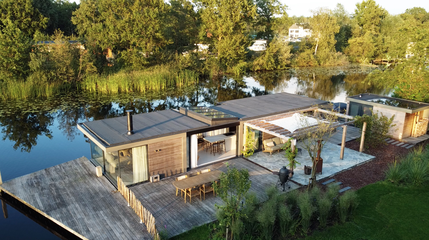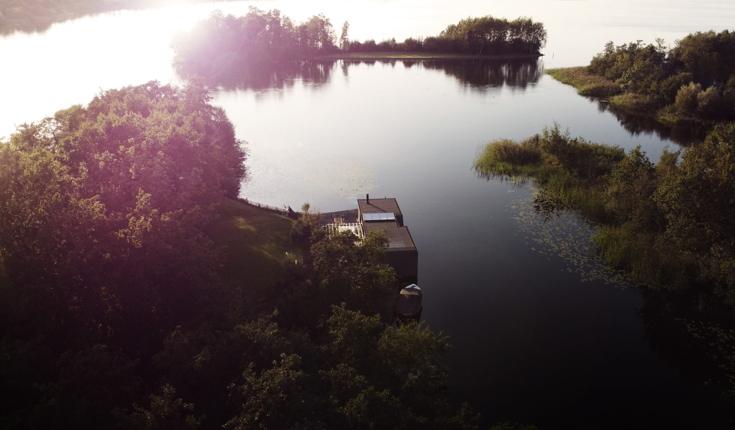 Uniek wonen en recreëren aan het water, midden in de natuur, zonder directe buren, een turn-key watervilla onder architectuur, met eigen grond en direct uitzicht over de plas.