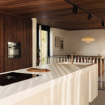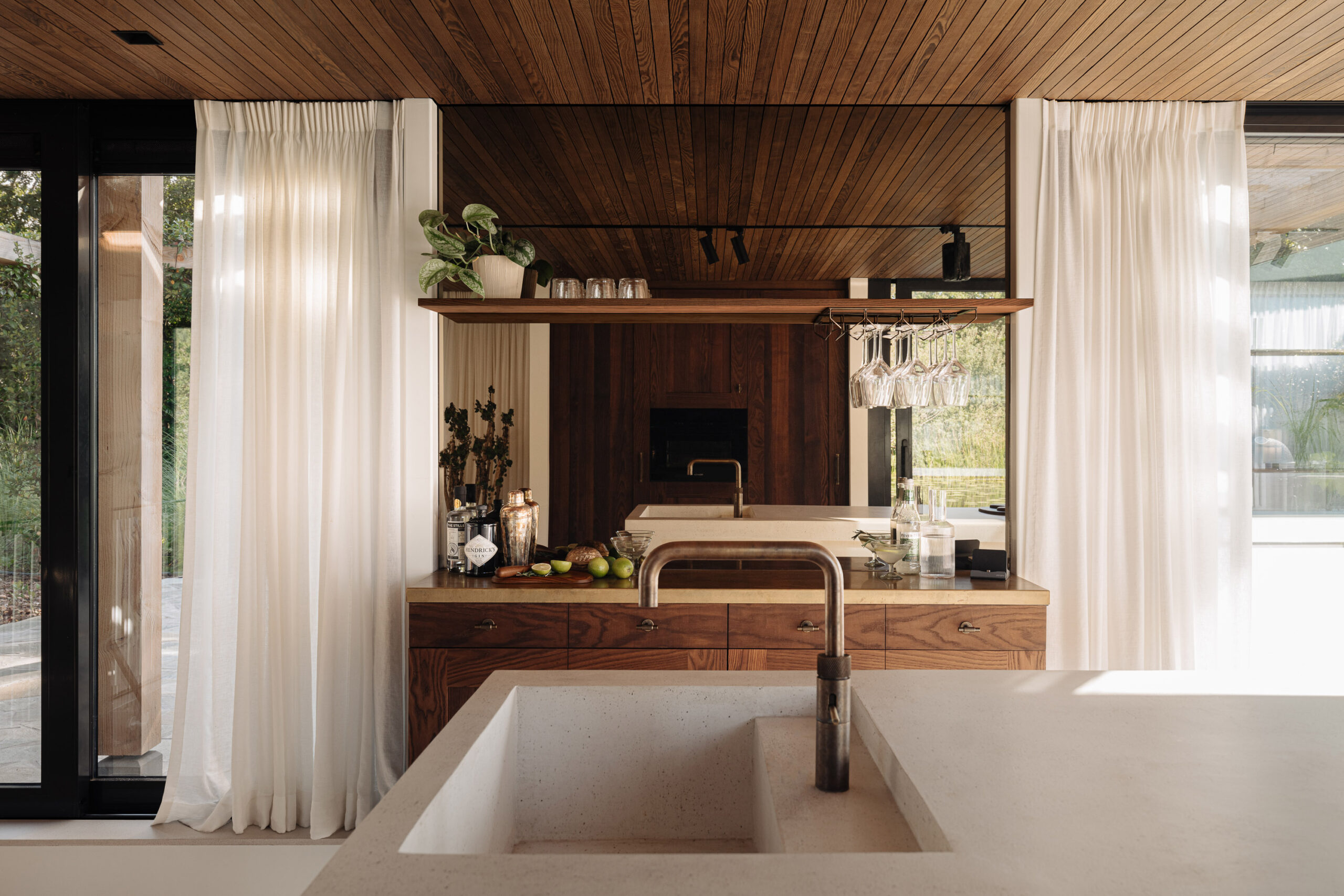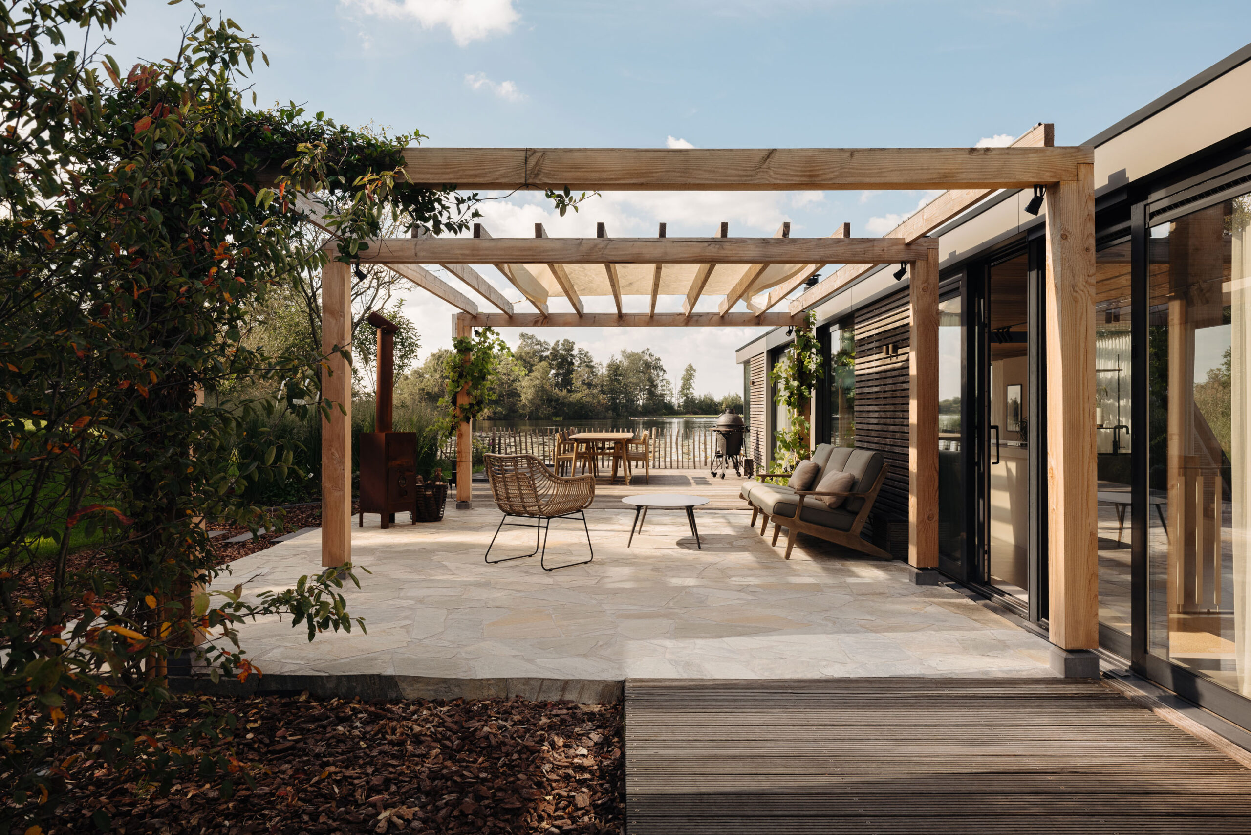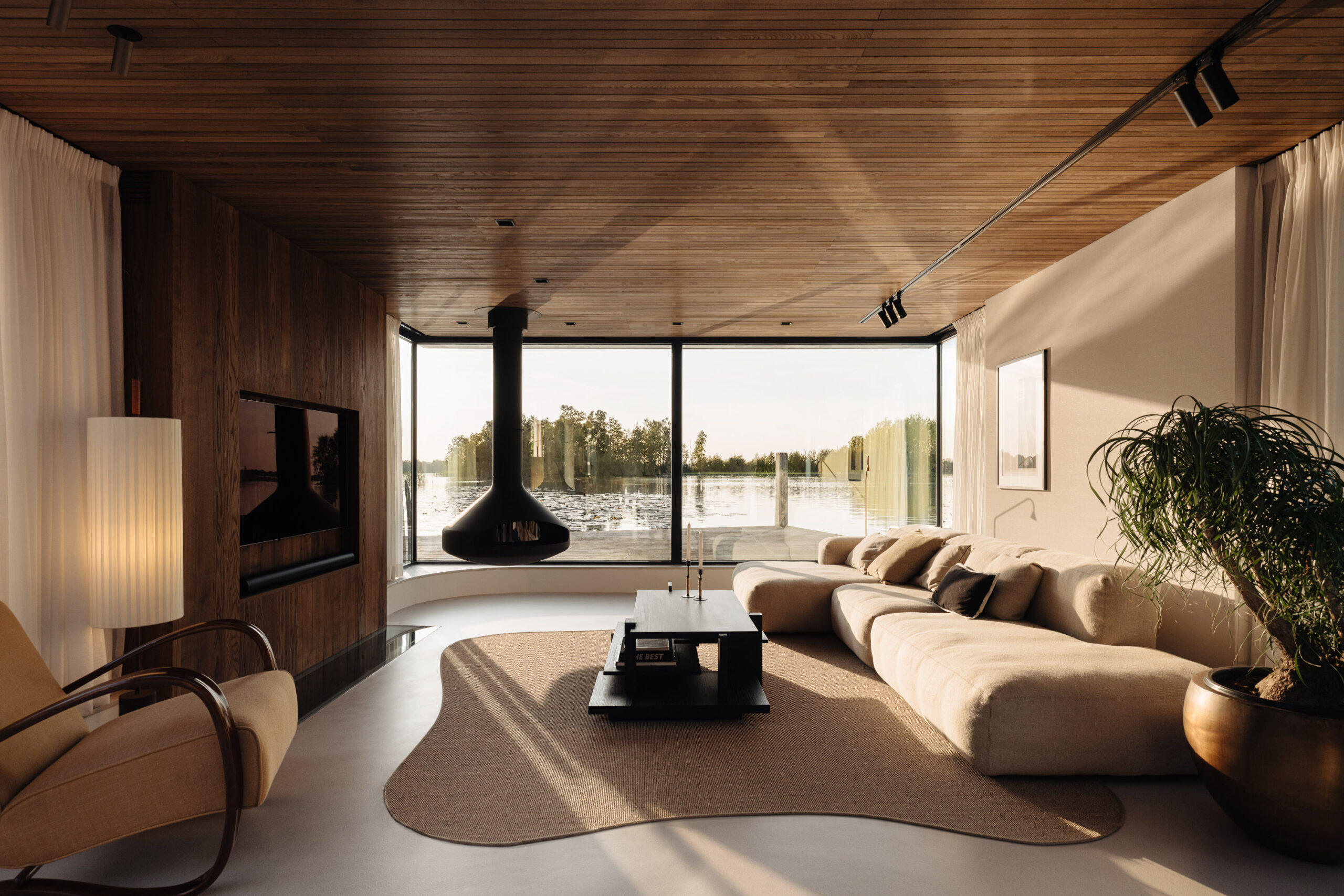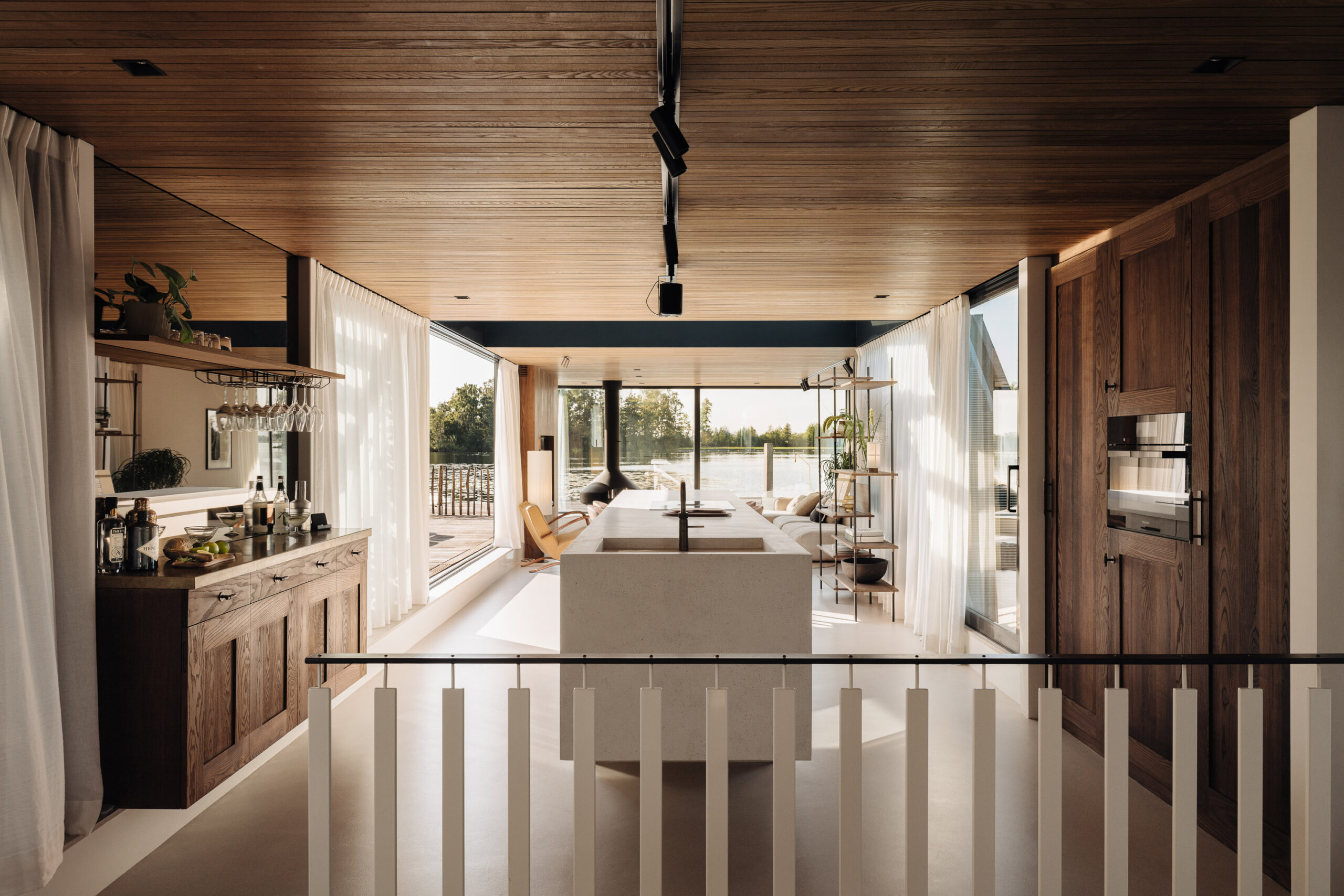 De woonkamer is voorzien van een Focus design houtkachel en biedt door het royale gebruik van glas een uniek, direct uitzicht over de plas. Natuurlijke materialen, een warm houten plafond, een ingetogen palet en doorlopende vloer, versterken het gevoel van rust en ruimte.