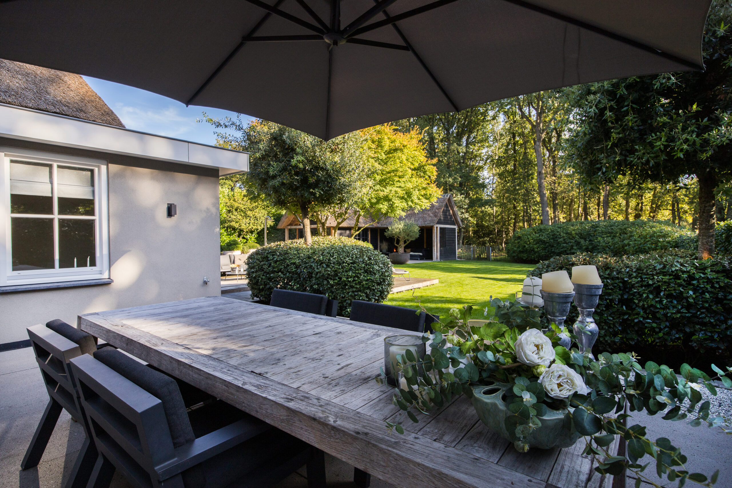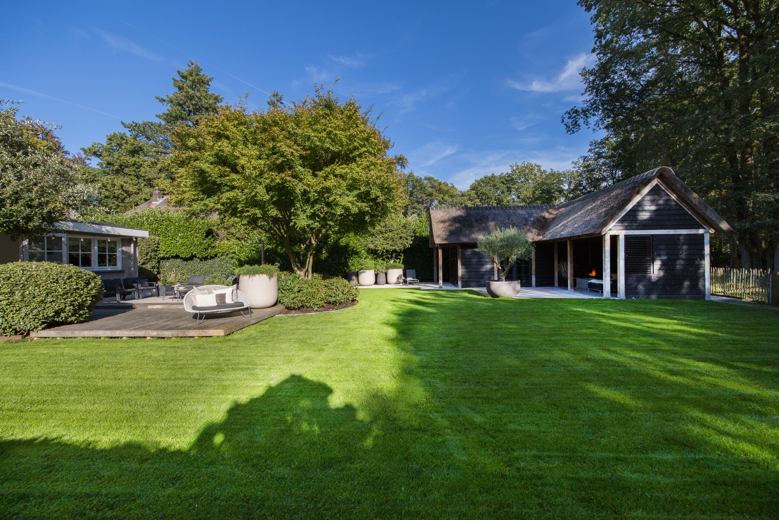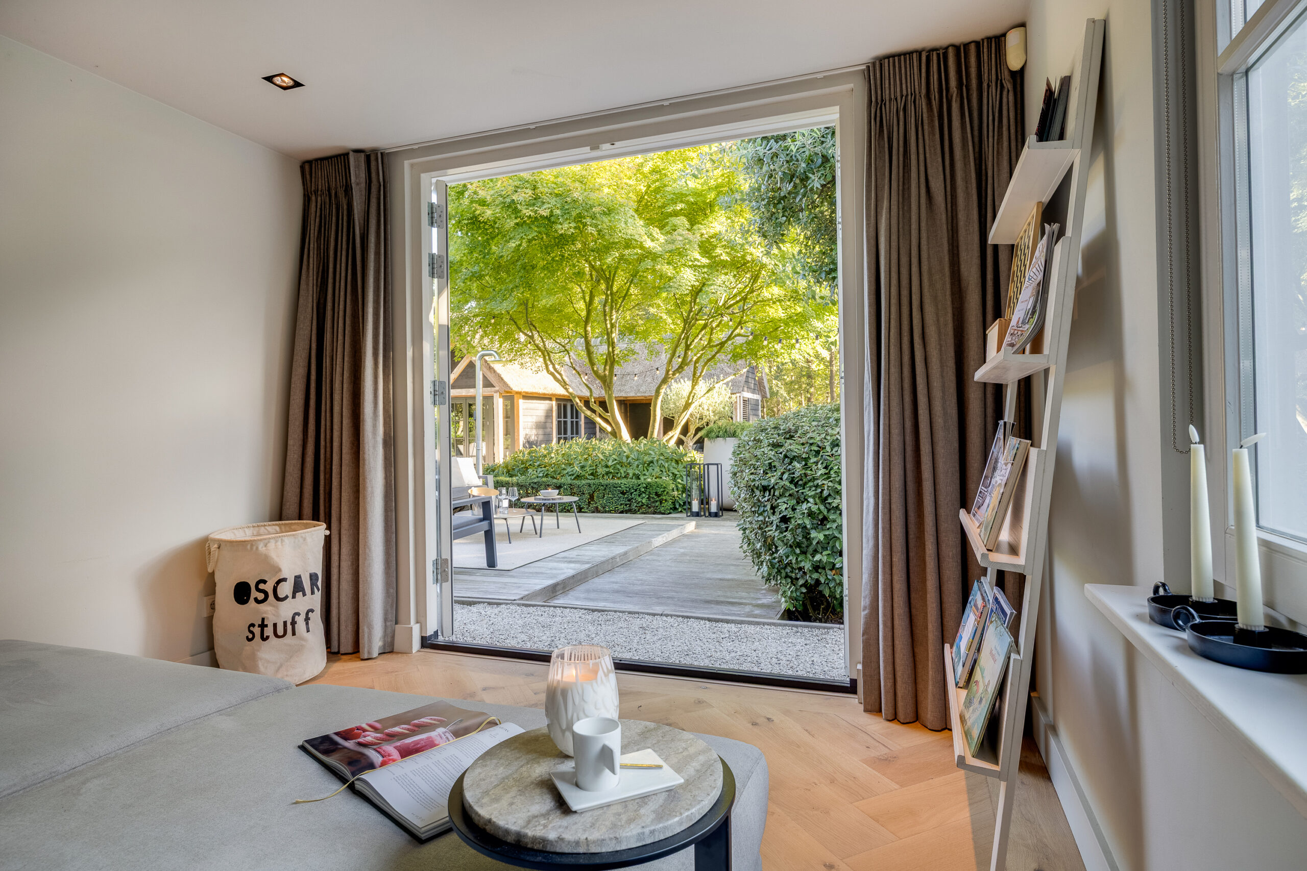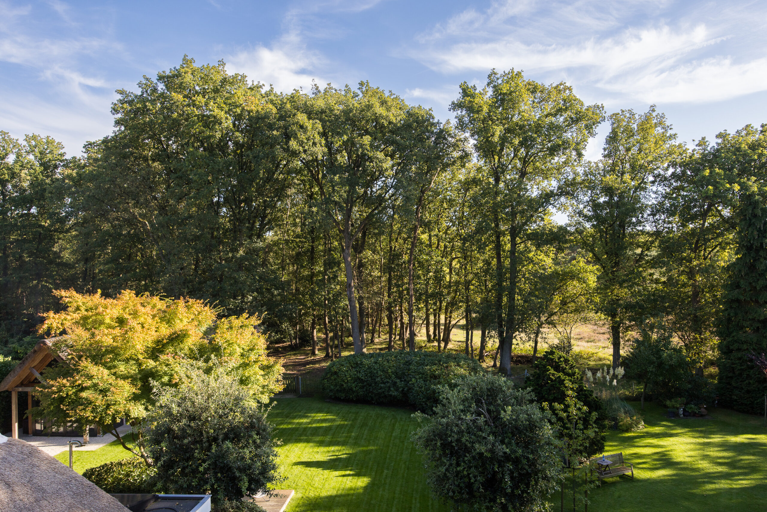 Via de dubbele openslaande deuren stapt u moeiteloos de groene, zorgvuldig aangelegde achtertuin in — een oase van rust en privacy en uitzicht over de heide.