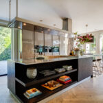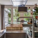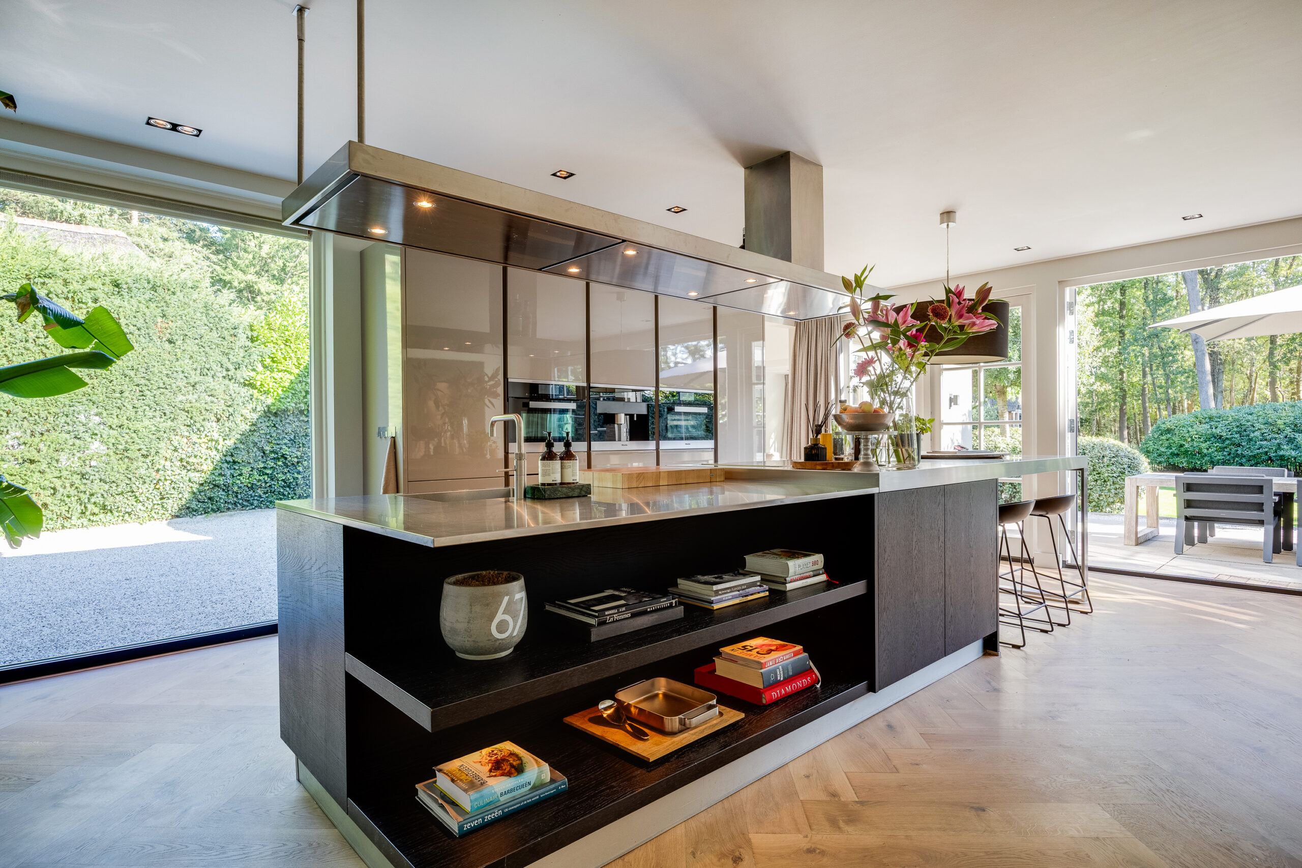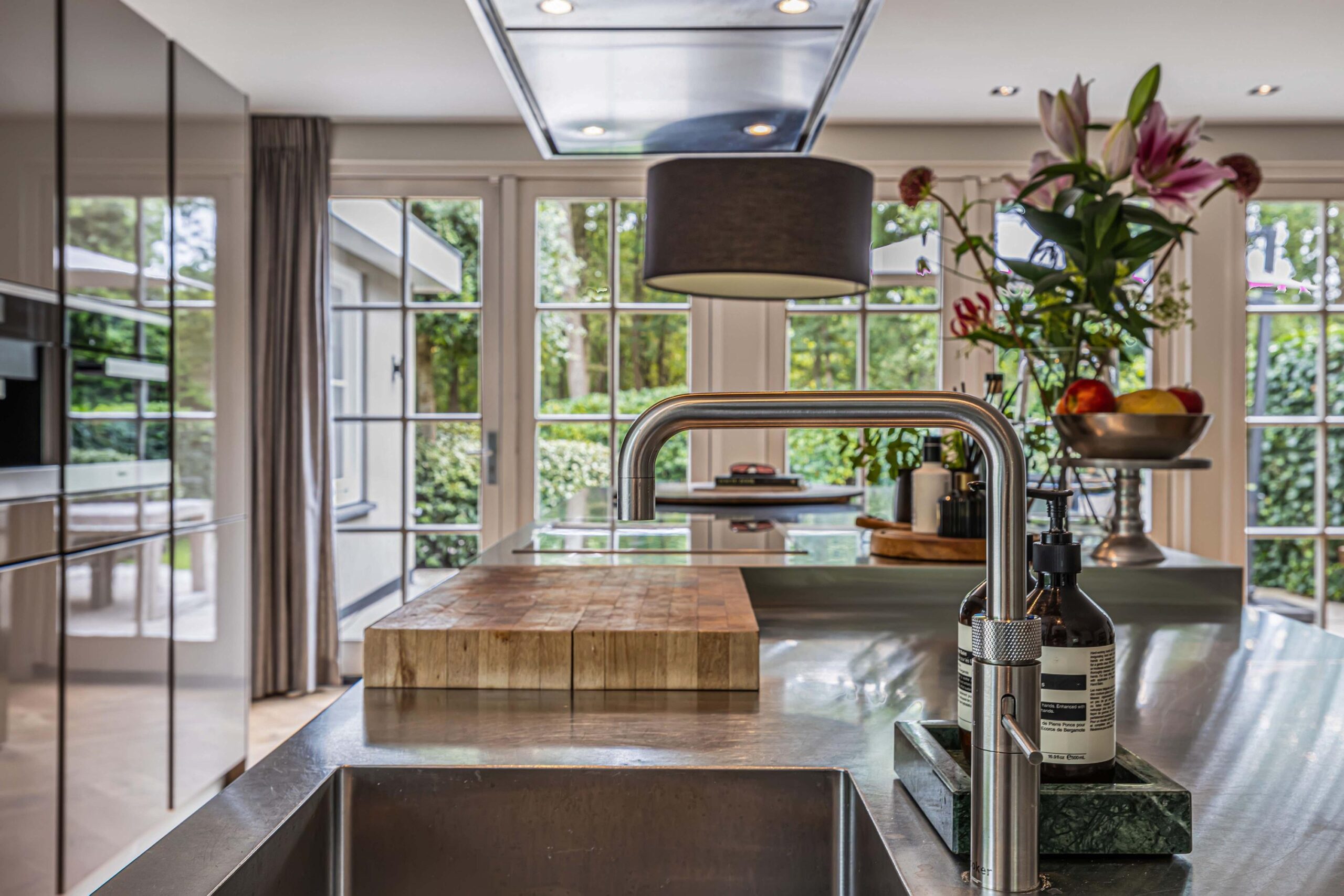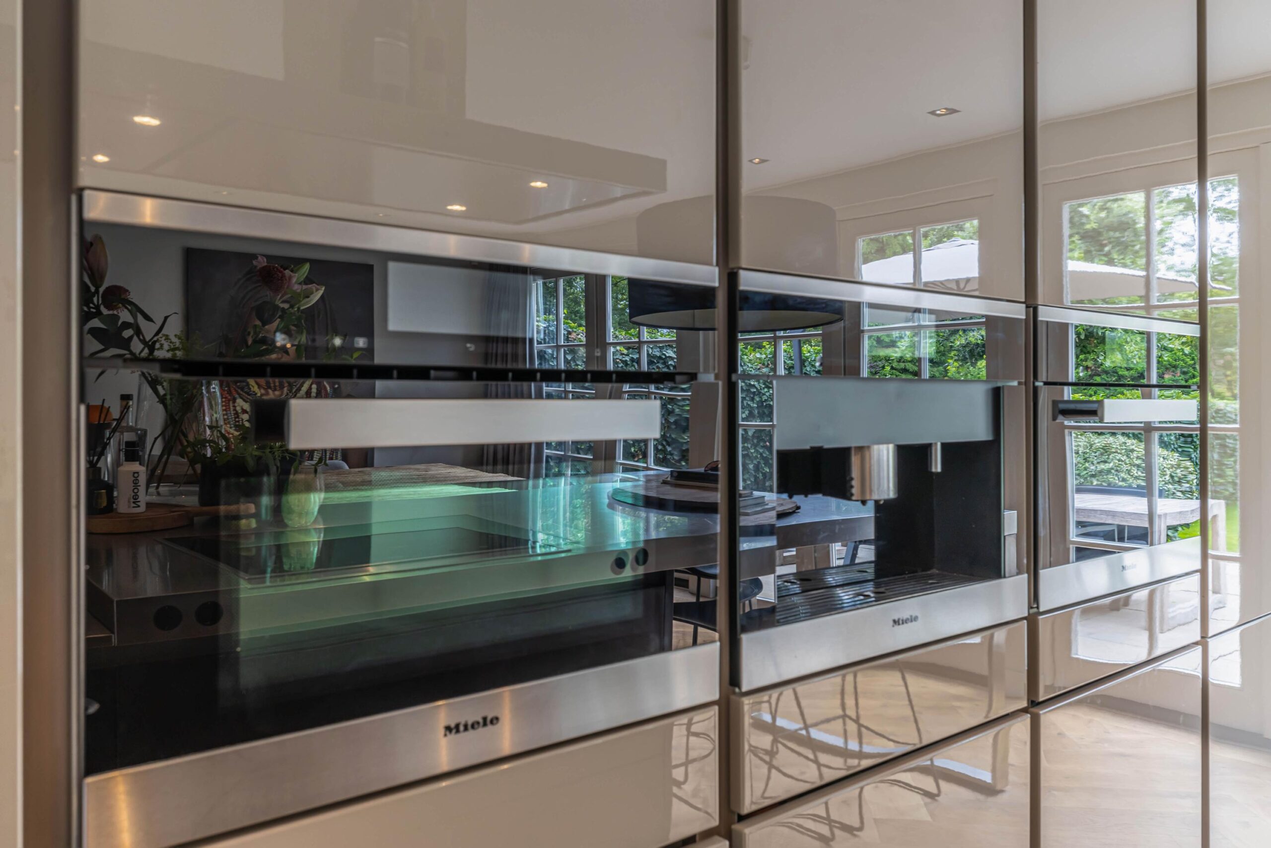 De uitgebouwde eetkeuken is het kloppend hart van dit bijzondere thuis: een groot kookeiland met stoer stalen blad, omringd door hoogwaardige Miele-apparatuur zoals inductiekookplaat, Quooker, koelkast, oven, koffieautomaat en stoomoven, maakt koken hier een waar genot.
