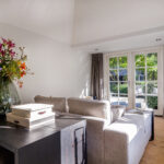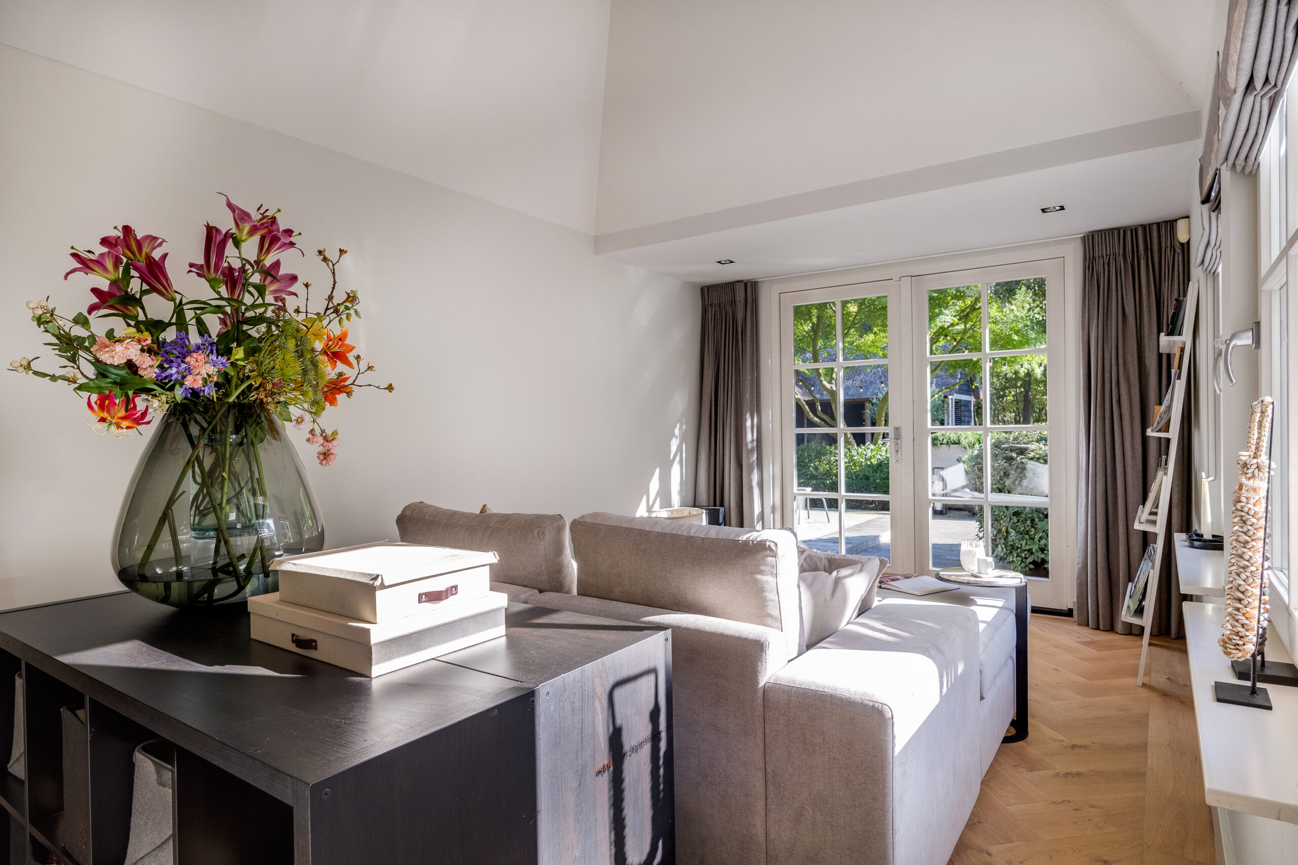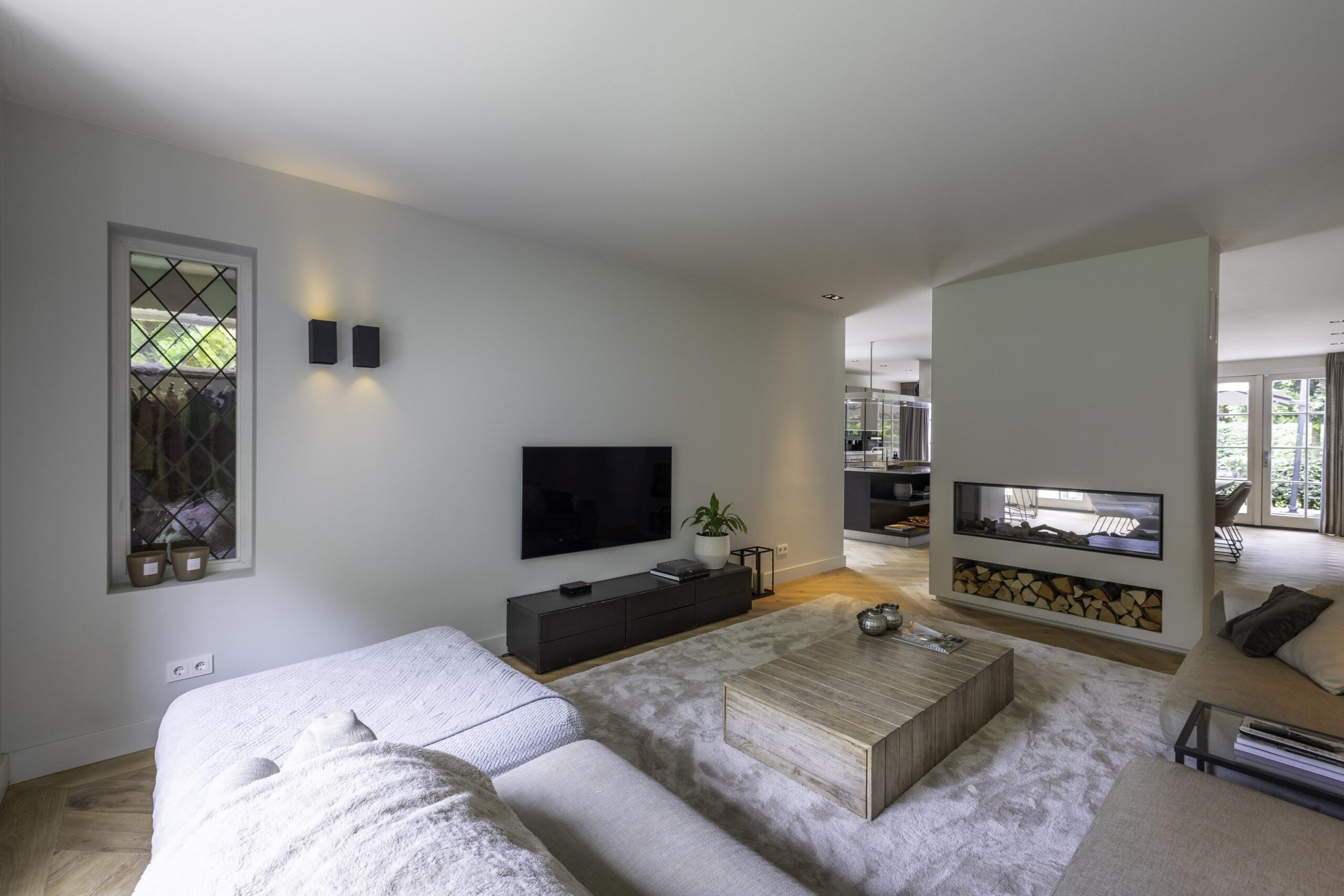 In de lichte zitkamer met grote erker en sfeervolle doorkijk gashaard voelt u meteen de elegantie van het huis.