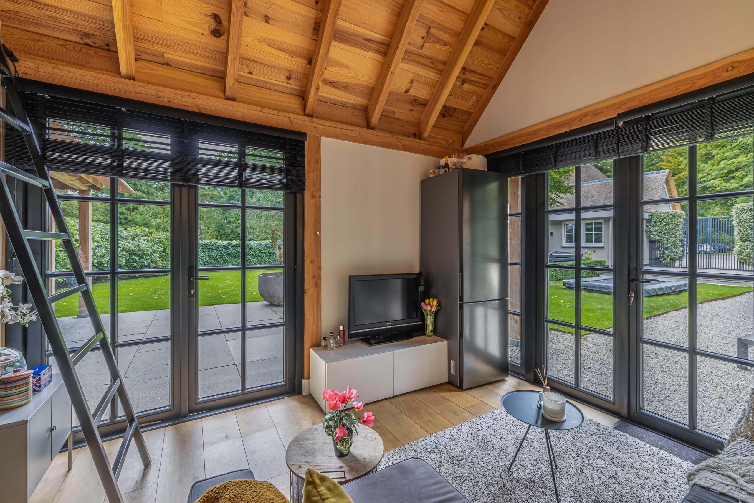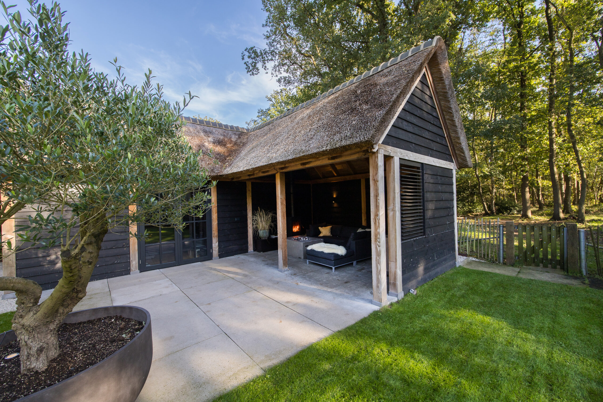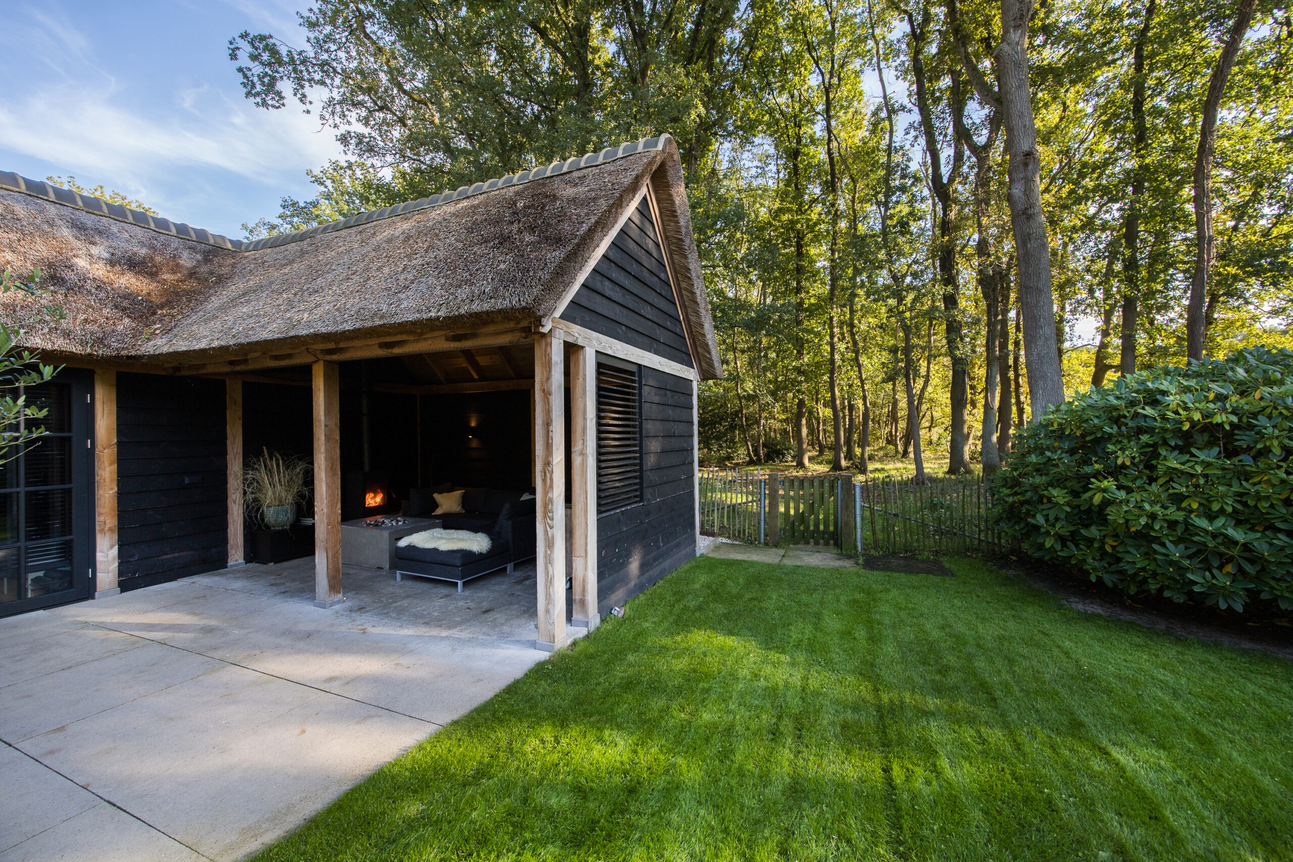 Het bijzondere bijgebouw van 26m2 met rieten kap, aan de perceelsgrens gelegen, vormt een serene plek apart van het huis. Met een woonkamer, badkamer en slaapentresol is dit bijgebouw ideaal als gastenverblijf, au pair-ruimte, kantoor of stille retraite. De overkapping met houthaard maakt het plaatje compleet; hier geniet u bij zonsondergang van knisperend vuur en een prachtig uitzicht richting uw eigen woning.