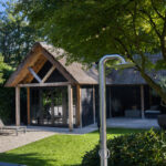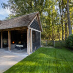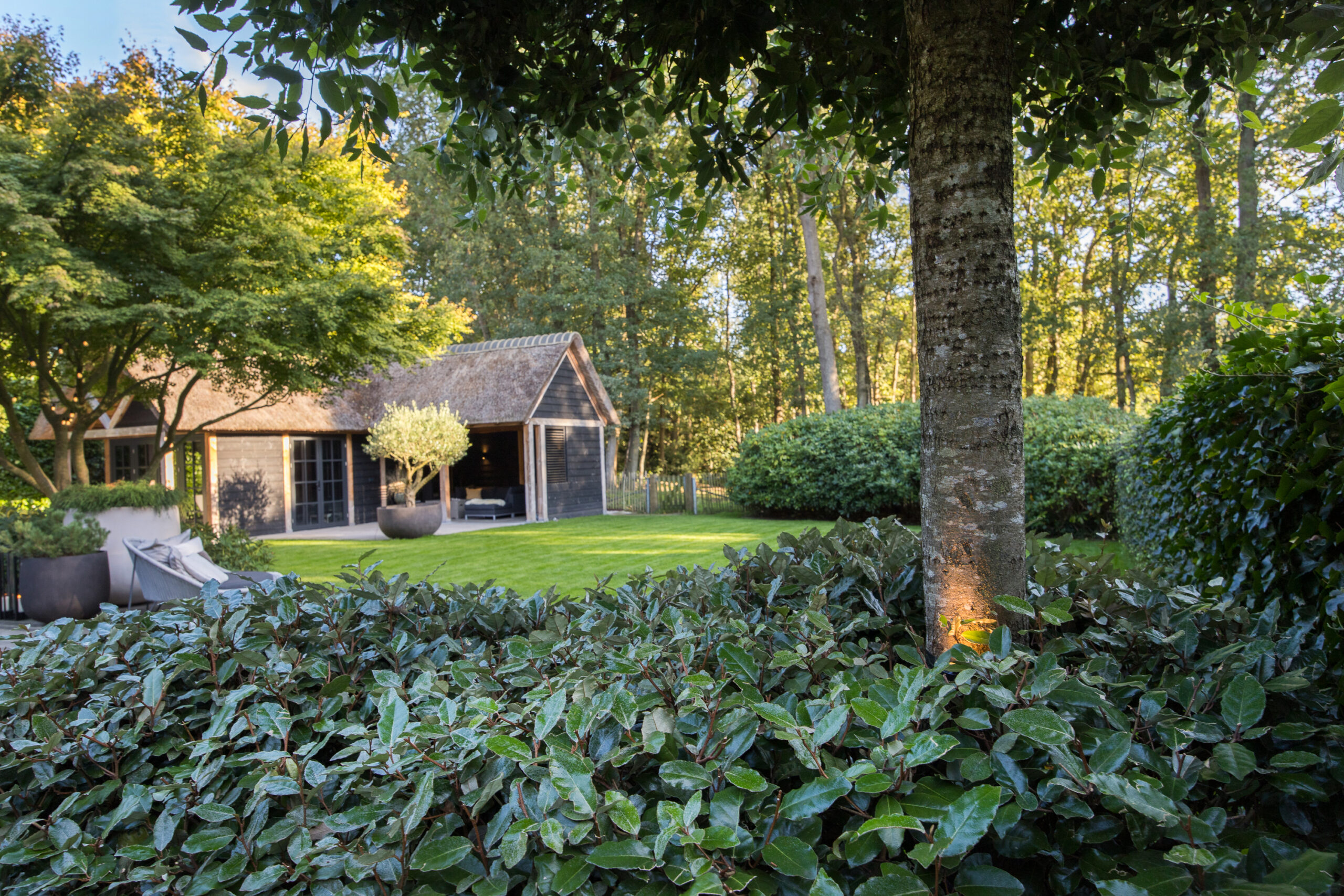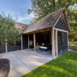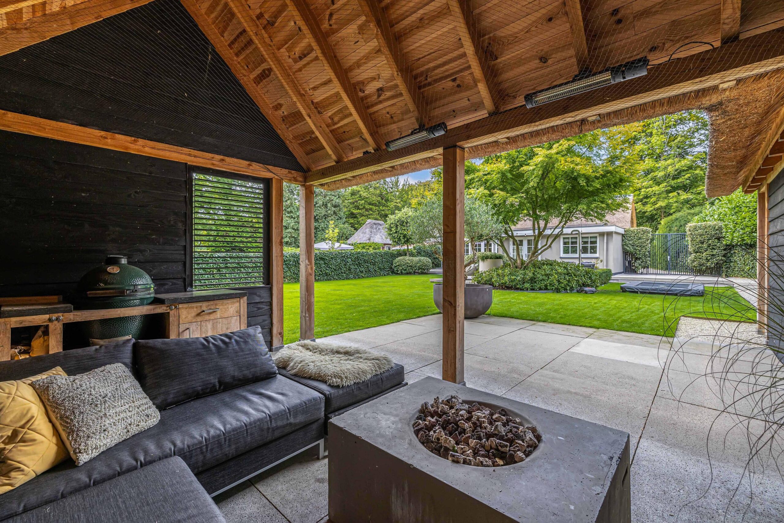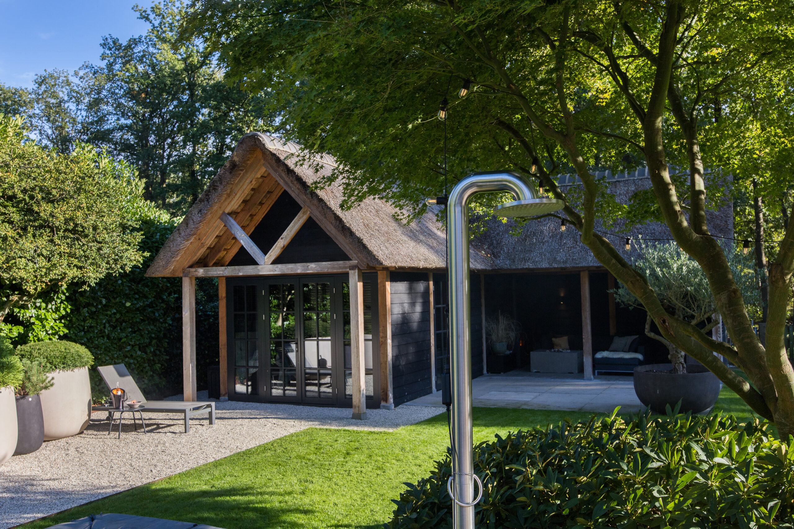 Het bijzondere bijgebouw van 26m2 met rieten kap, aan de perceelsgrens gelegen, vormt een serene plek apart van het huis. Met een woonkamer, badkamer en slaapentresol is dit bijgebouw ideaal als gastenverblijf, au pair-ruimte, kantoor of stille retraite. De overkapping met houthaard maakt het plaatje compleet; hier geniet u bij zonsondergang van knisperend vuur en een prachtig uitzicht richting uw eigen woning.