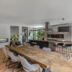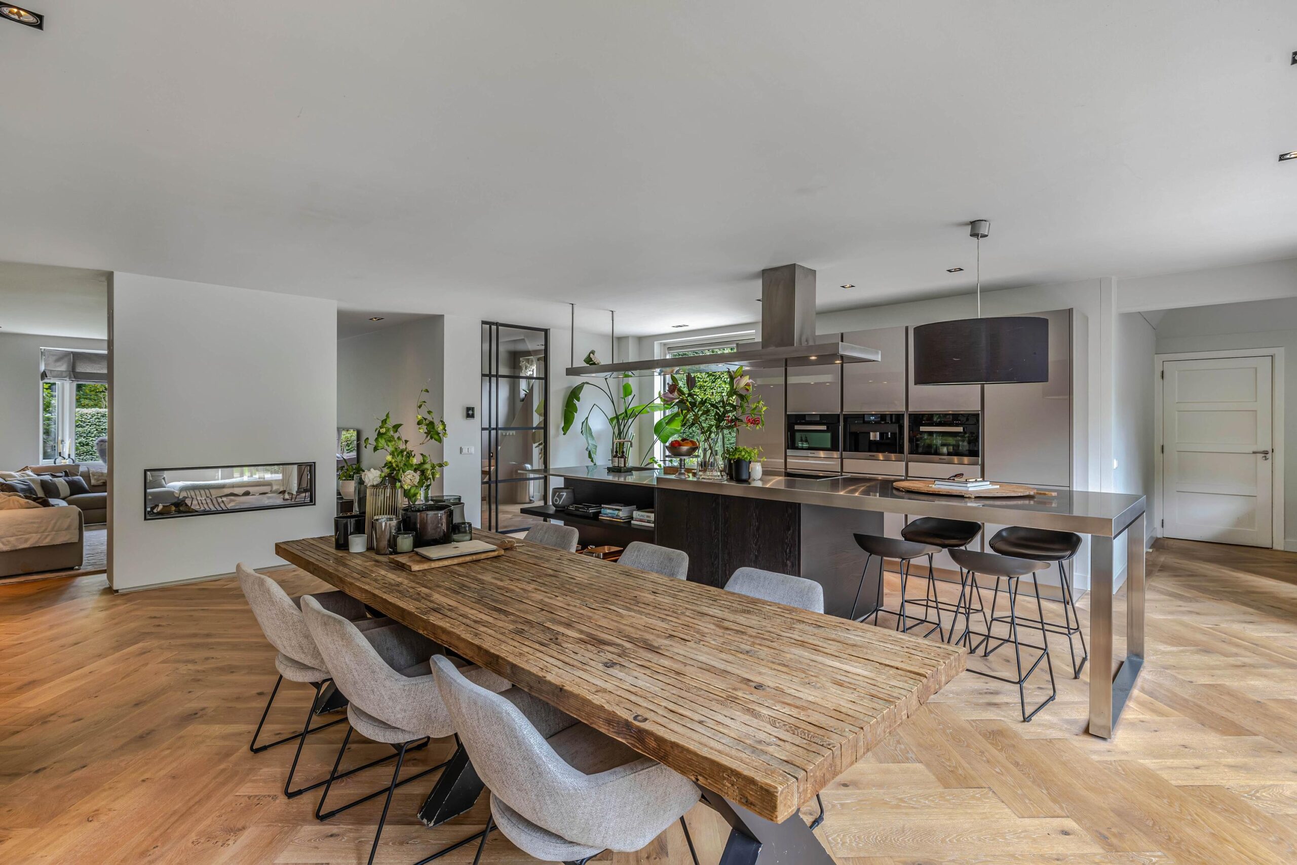 De uitgebouwde eetkeuken is het kloppend hart van dit bijzondere thuis: een groot kookeiland met stoer stalen blad, omringd door hoogwaardige Miele-apparatuur zoals inductiekookplaat, Quooker, koelkast, oven, koffieautomaat en stoomoven, maakt koken hier een waar genot.