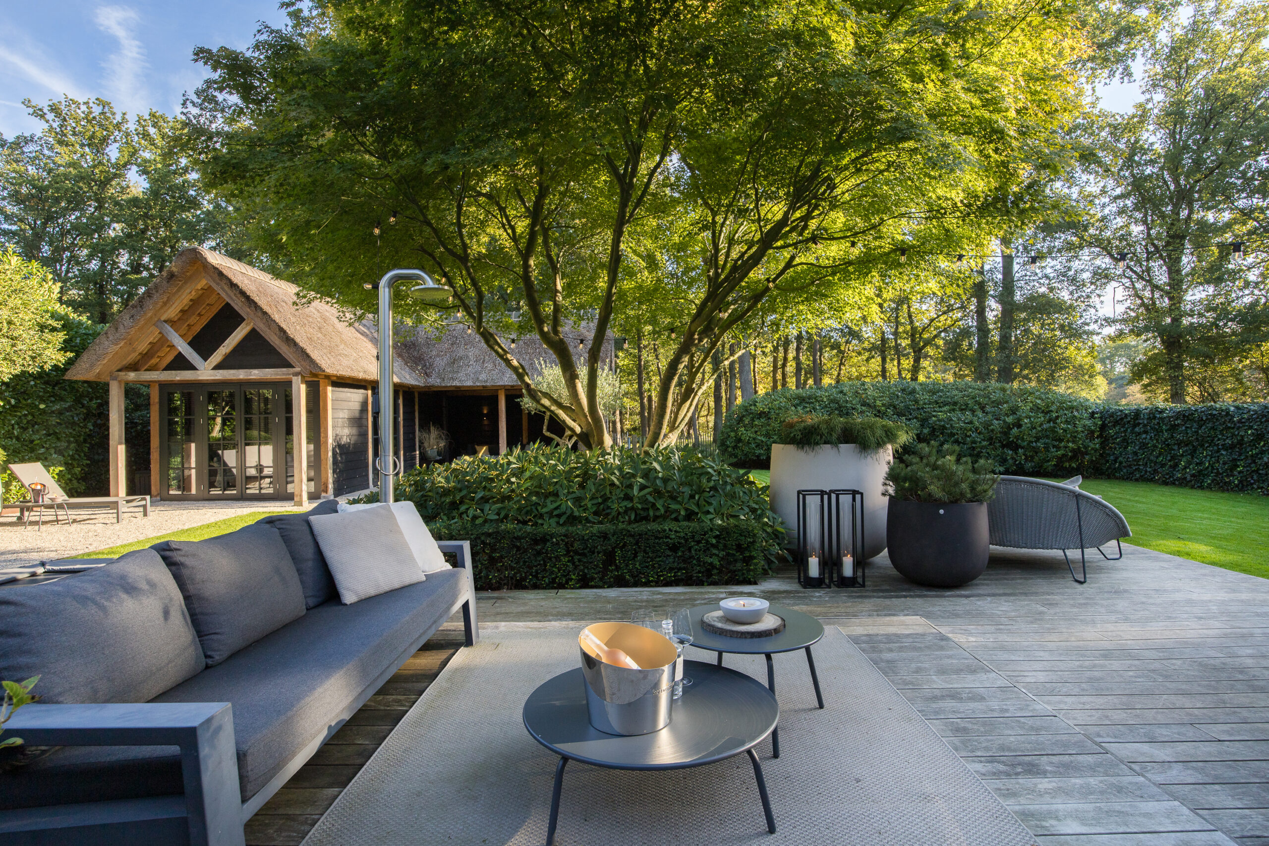 De tuin, voorzien van automatische besproeiing, buitendouche, mogelijkheid tot jacuzzi inbouw vlondersysteem en sfeervolle In-Lite led buitenverlichting systeem, nodigt uit om elk moment te koesteren — of het nu een zonnige zomerdag is of een frisse avond onder de sterren.