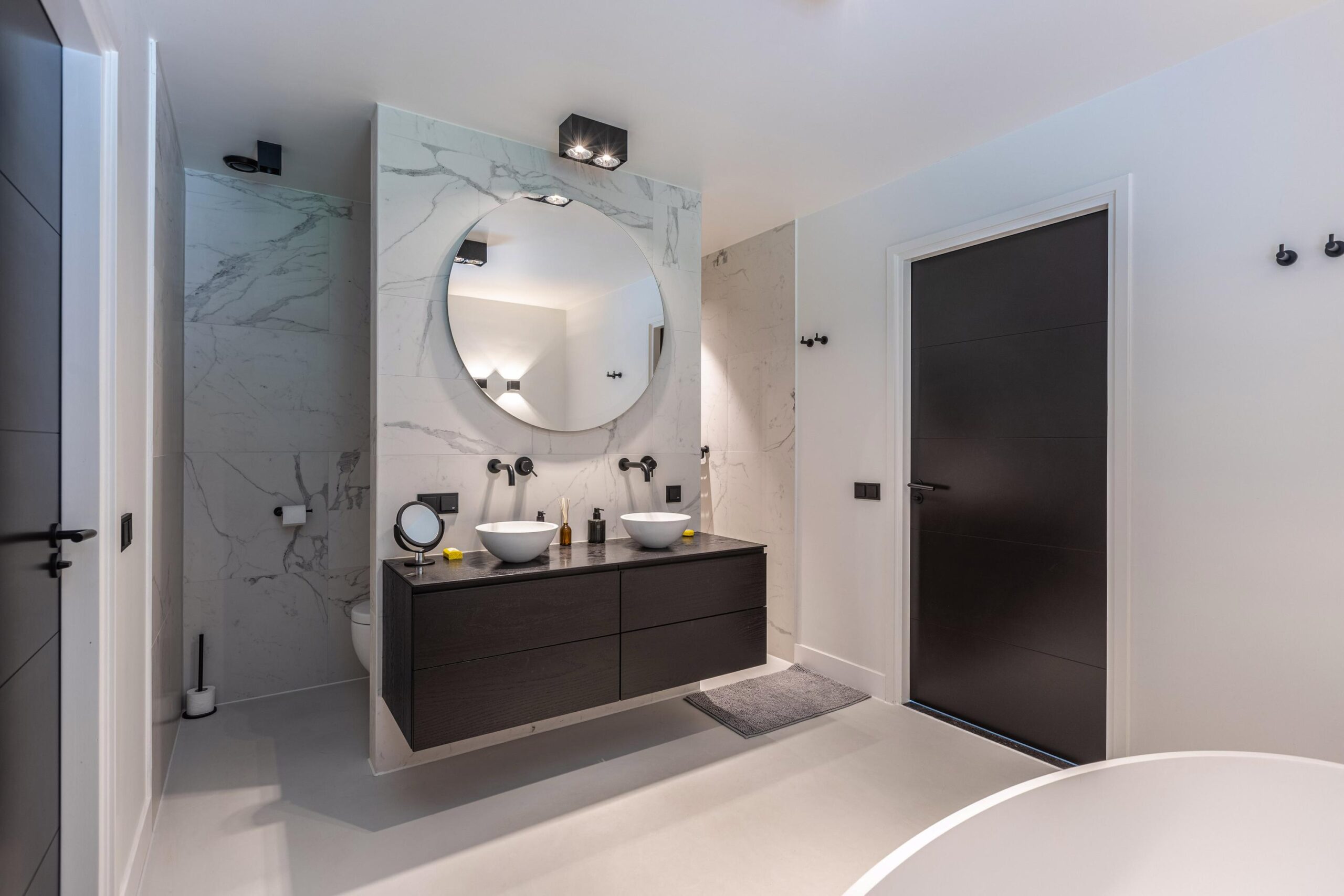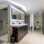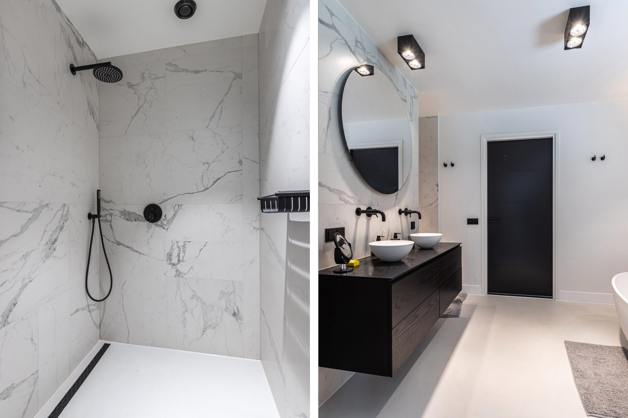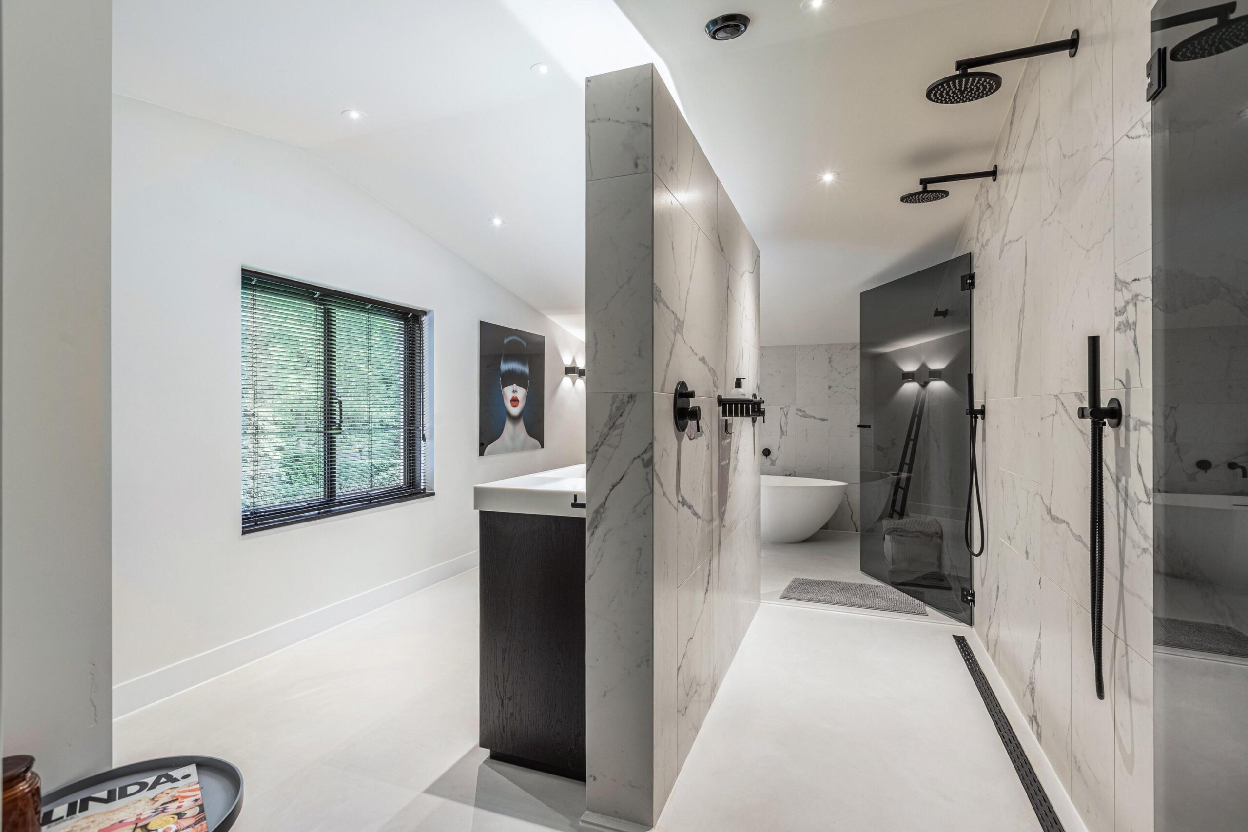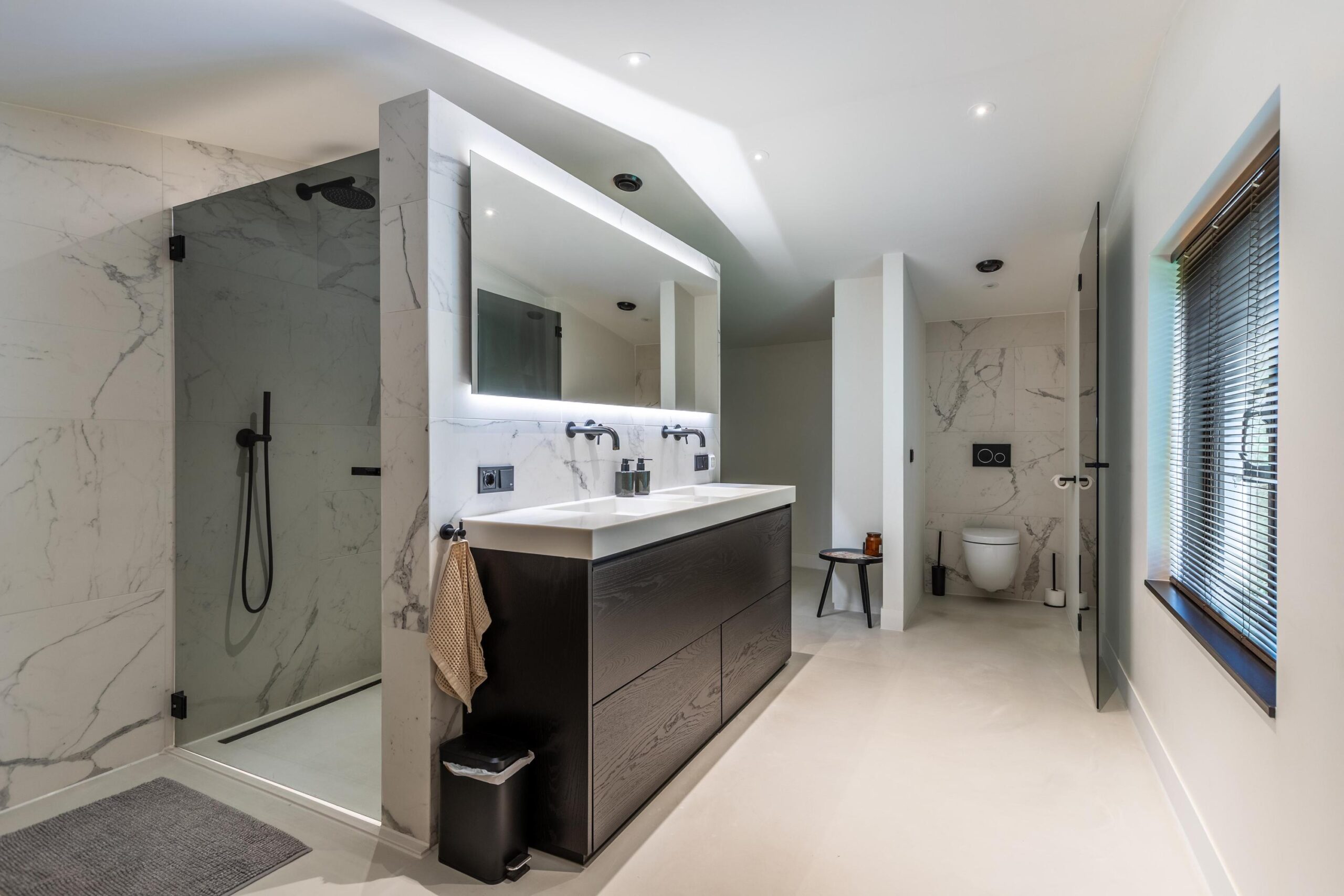 Grote 2e badkamer met vloerverwarming, dubbele douche en dubbele wastafels en design ligbad.