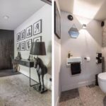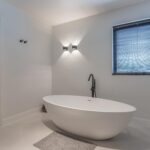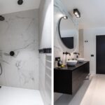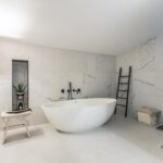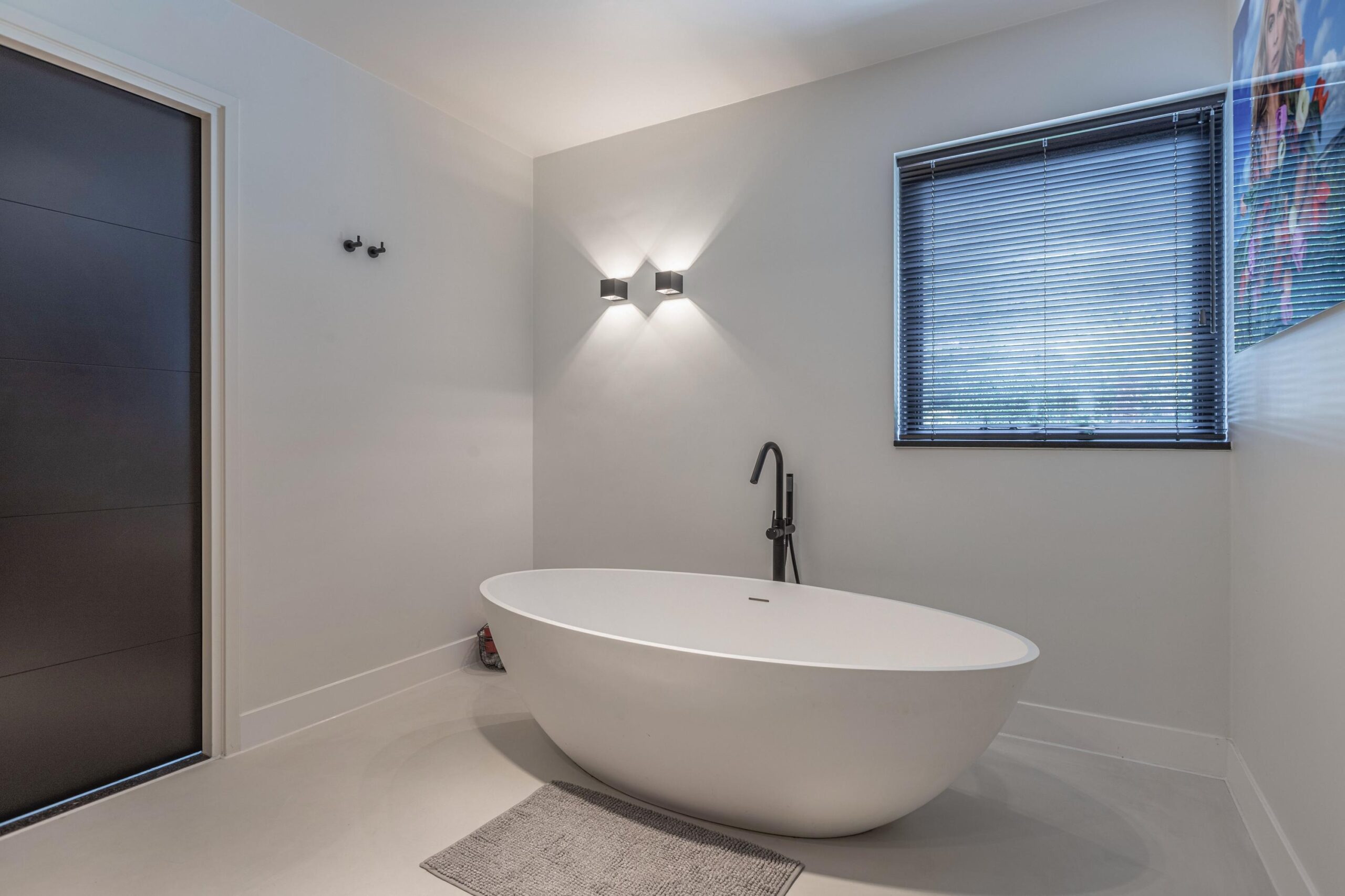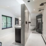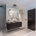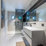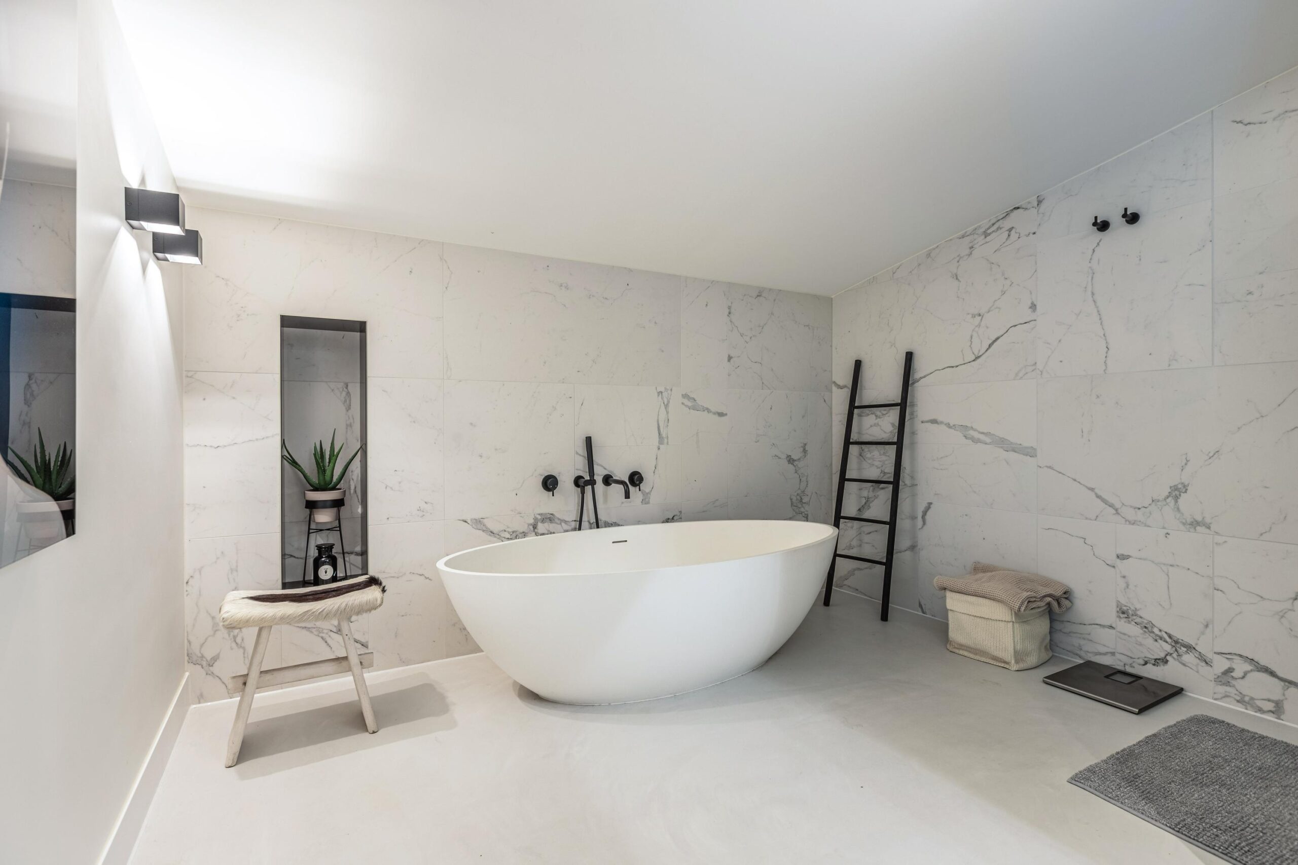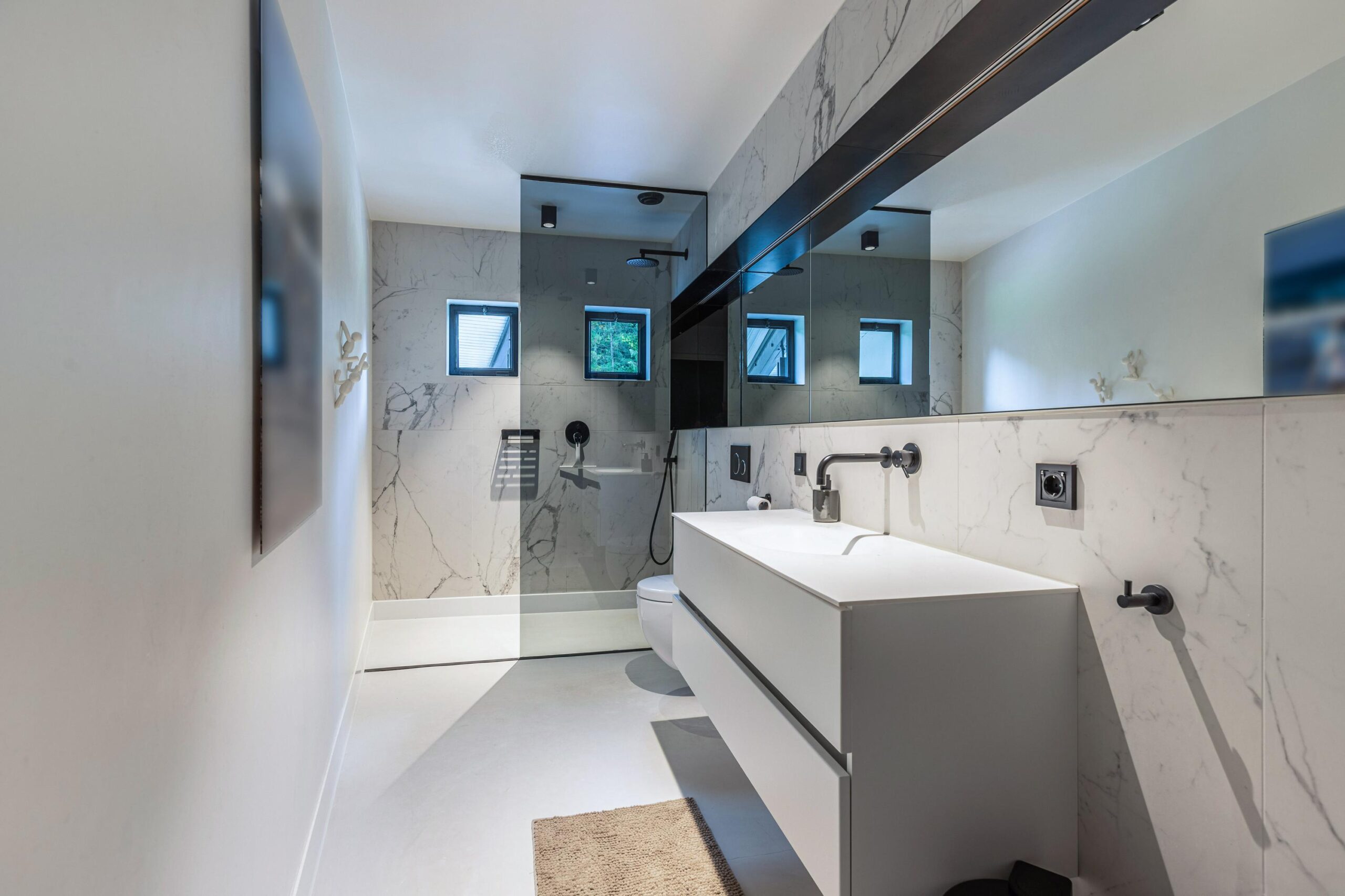 Grote 2e badkamer met vloerverwarming, dubbele douche en dubbele wastafels en design ligbad.