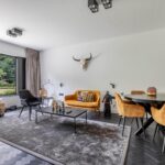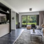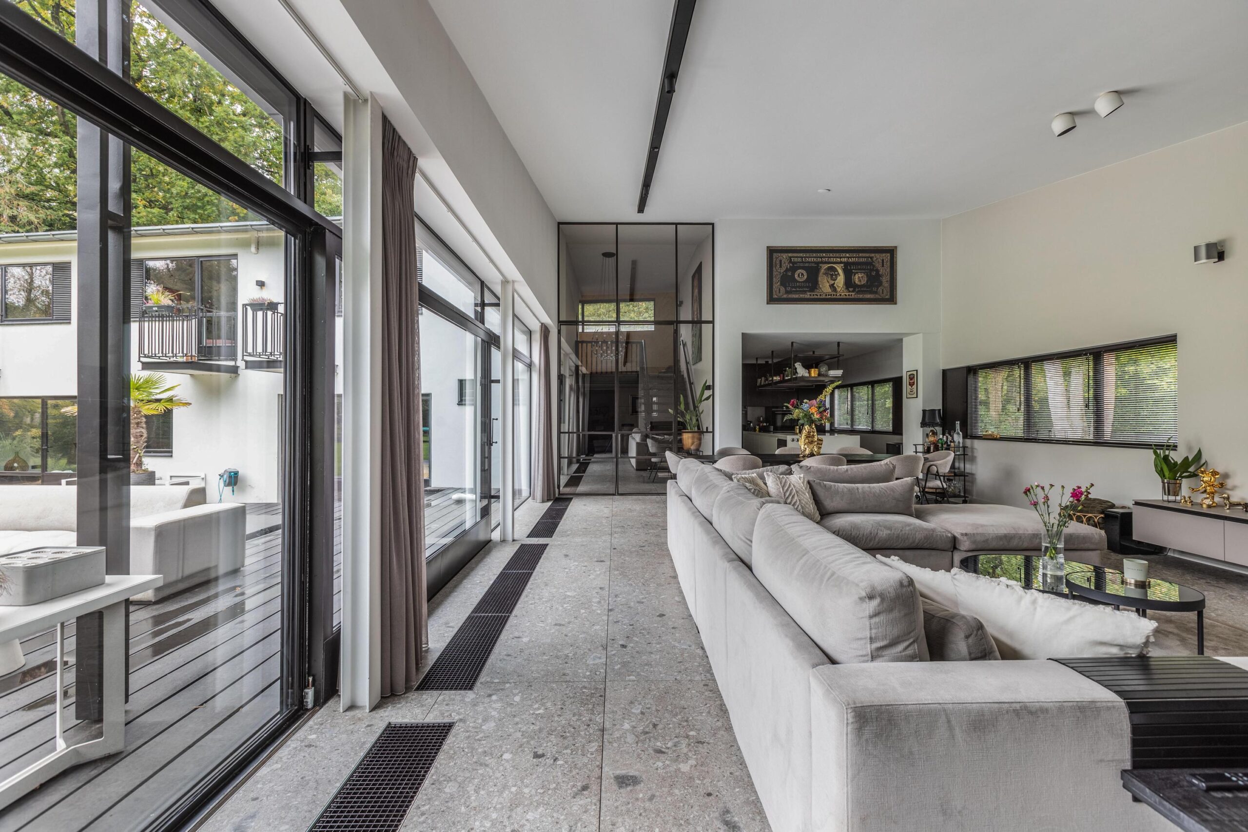Royale woonkamer met veel lichtinval door glazen schuifdeuren welke tevens toegang geven naar het terras op het Zuiden.