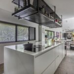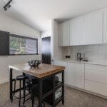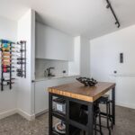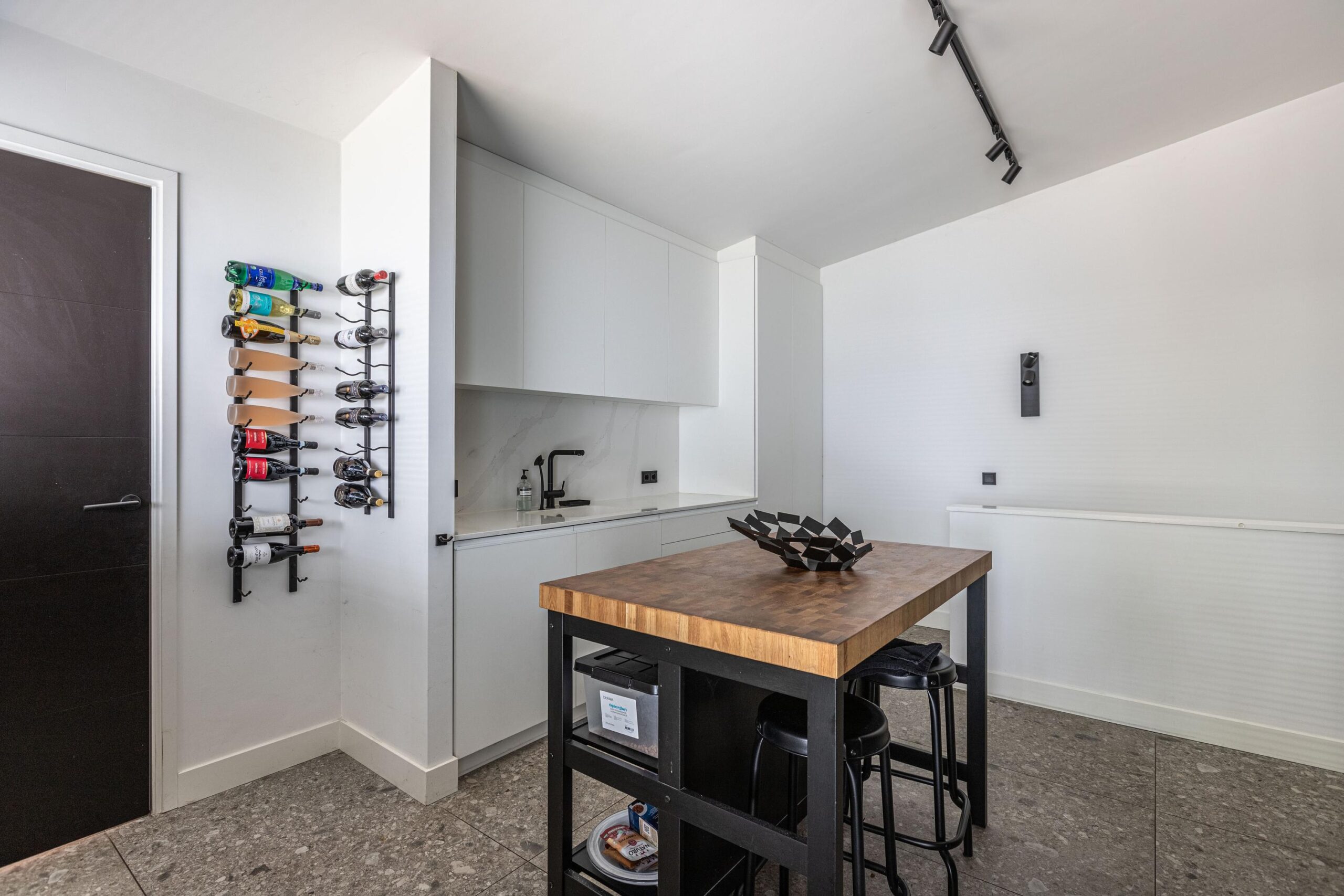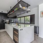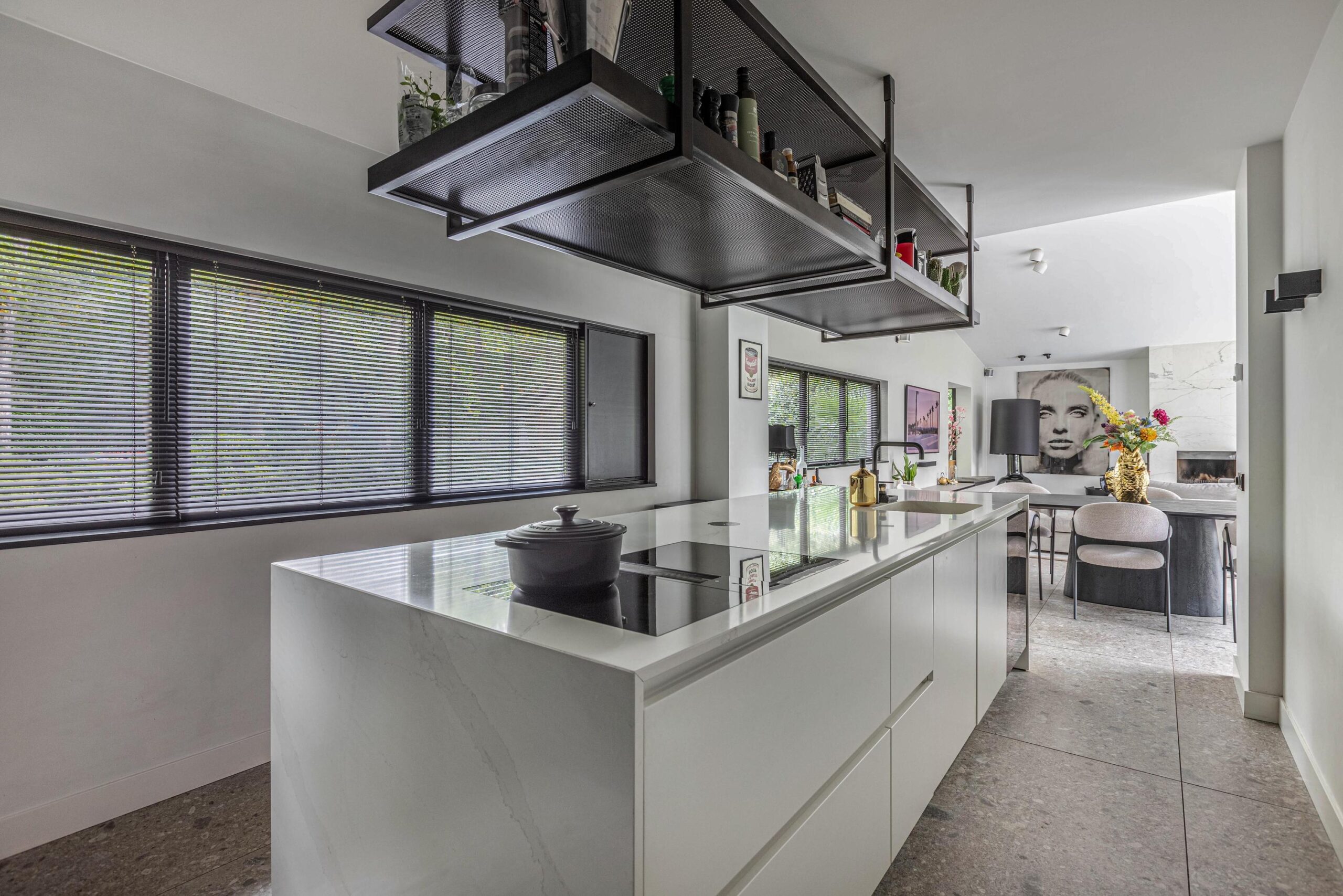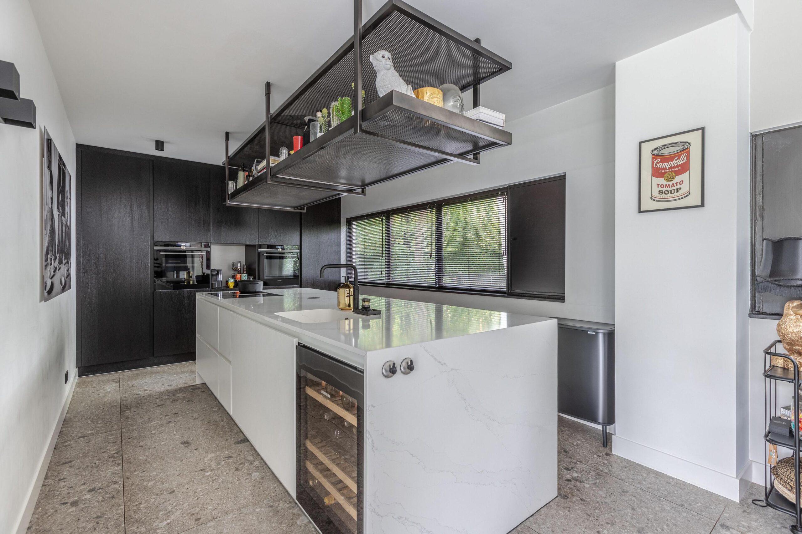 De moderne woonkeuken is voorzien van diverse apparatuur: kookplaat, afzuiging, vaatwasser, combi oven/magnetron, stoomoven, Liebherr wijnkoelkast, koelkast, vriezer, Quooker.
