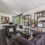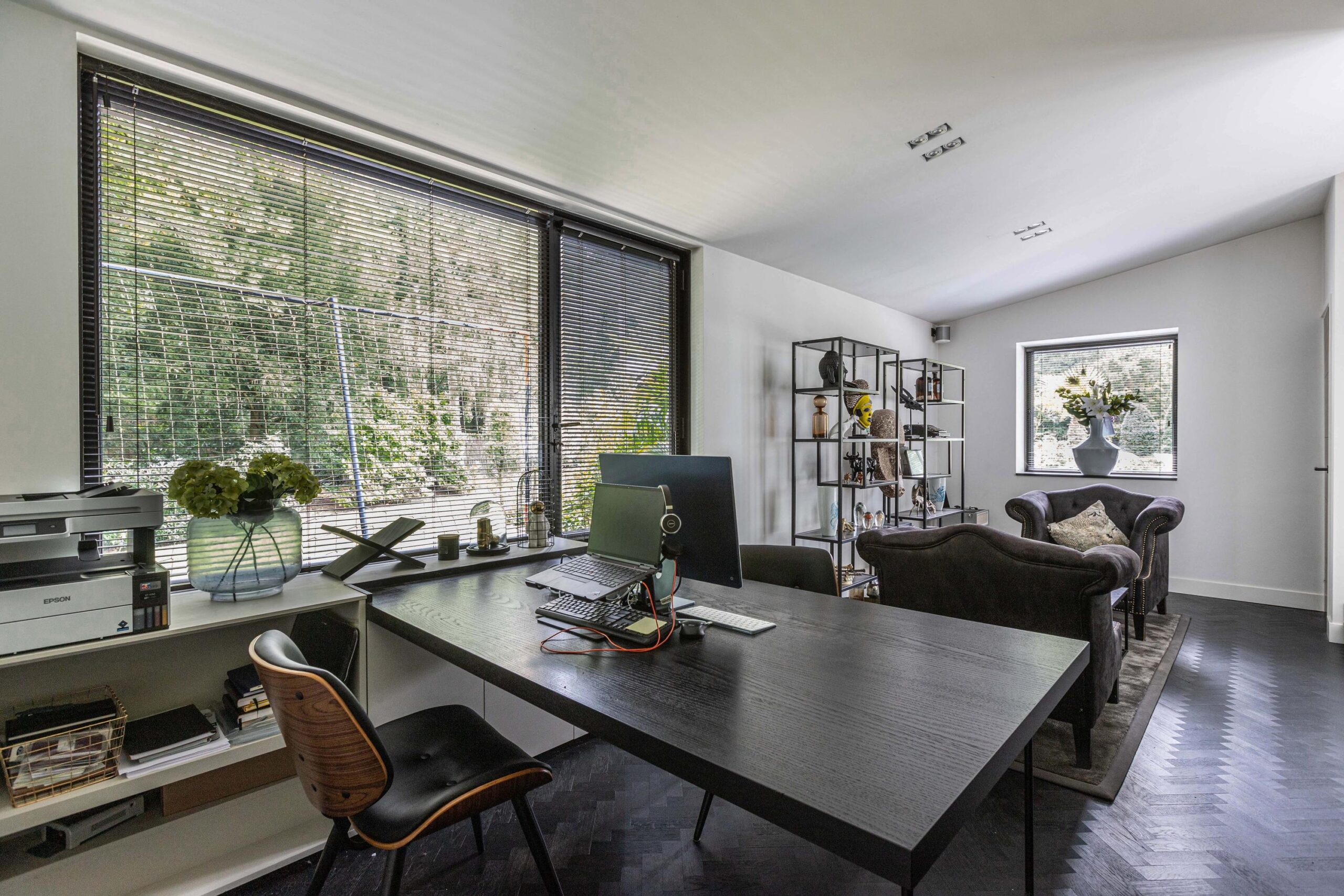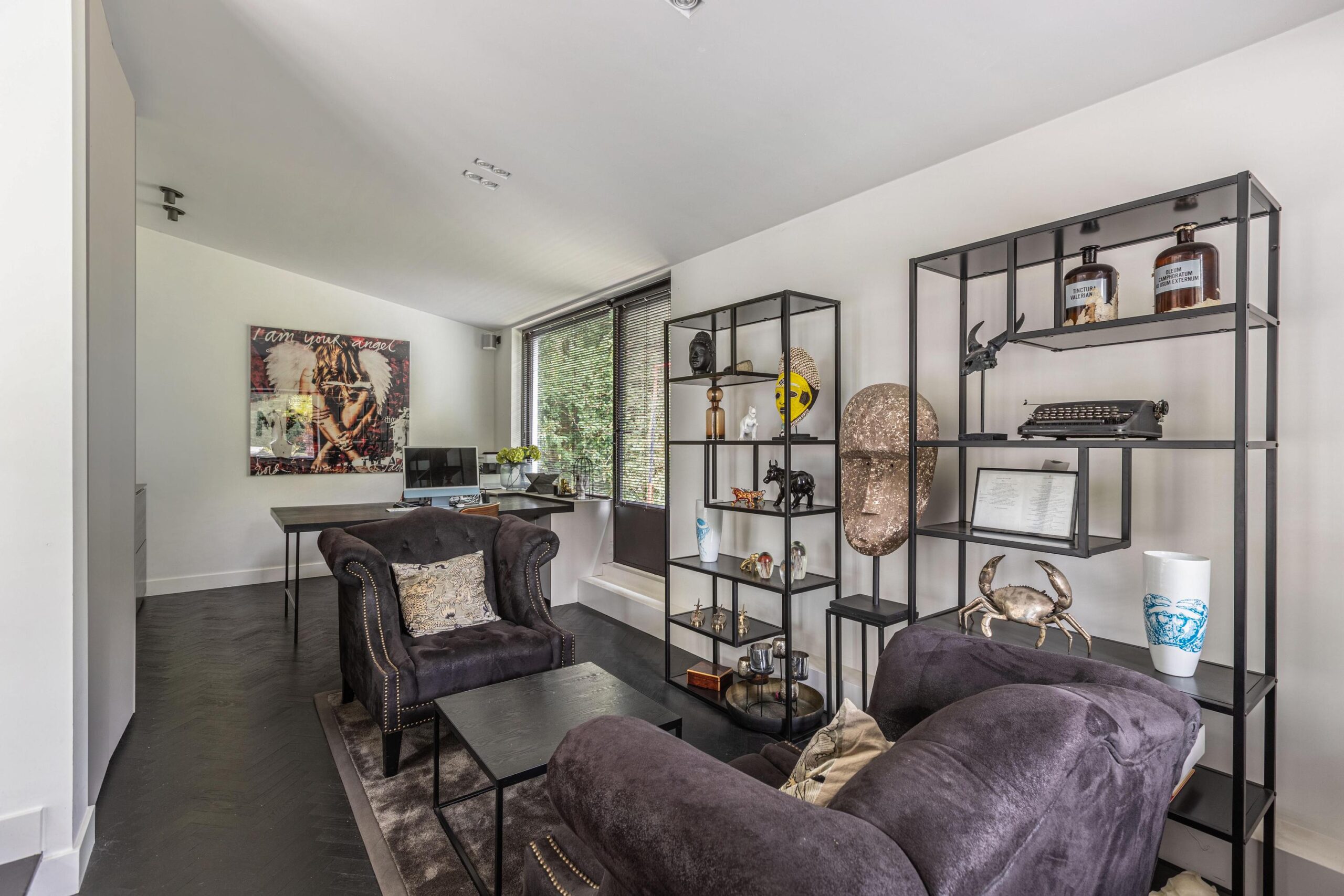 De woonkamer heeft een Italiaans natuurstenen vloer met vloerwarming, een open haard en een doorloop naar een afsluitbare werk-/studeer-/ tv-kamer welke ook een eigen terrasje heeft.