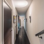Vanuit de hal loopt een gang met werkkast naar de bijkeuken met was- en droogapparatuur.