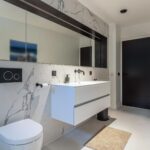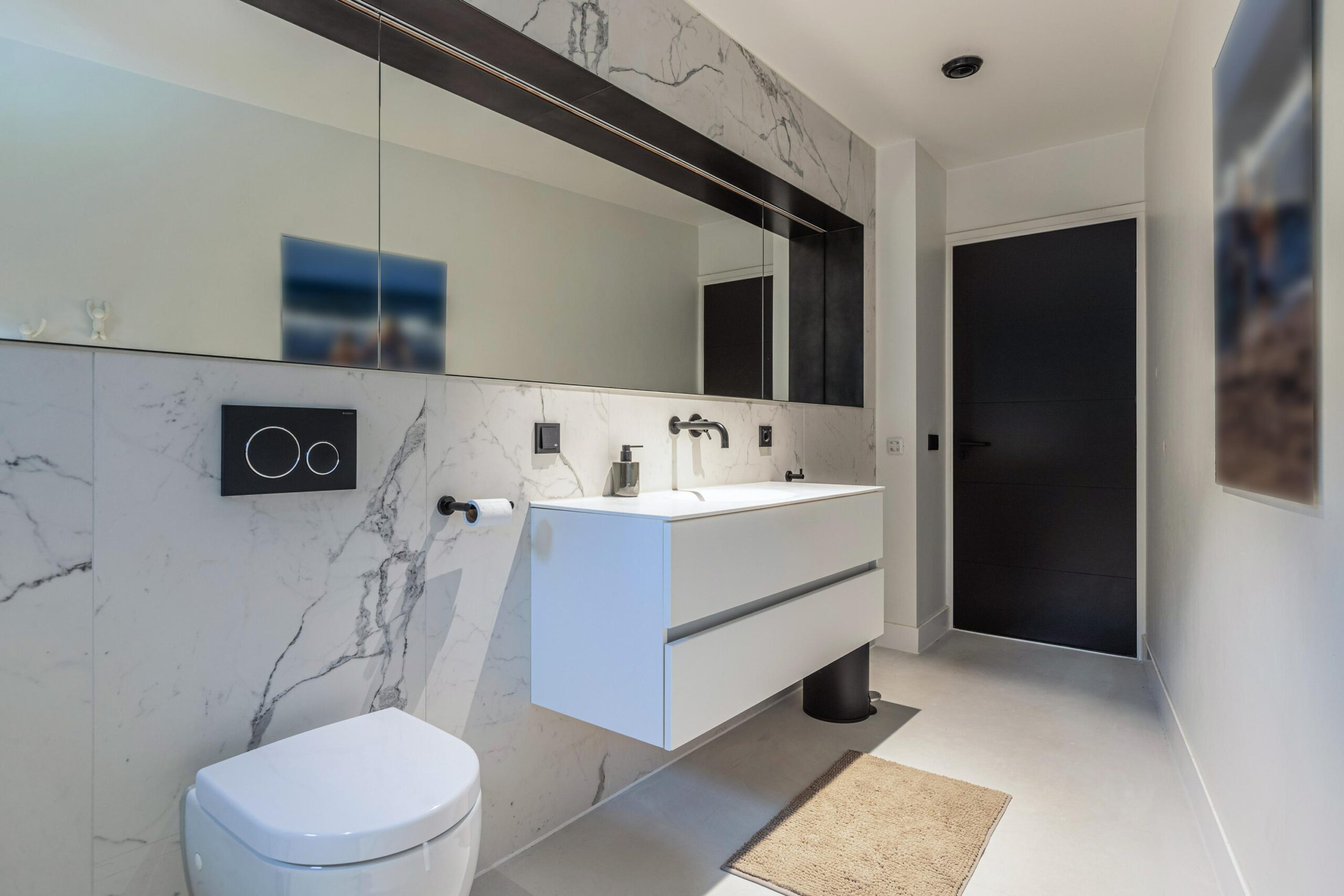 Ook zijn bereikbaar een tweetal ruime slaapkamers beide met vaste kasten en een moderne ruime badkamer met vloerverwarming, dubbele douche, dubbele wastafels en een design ligbad.