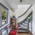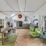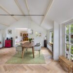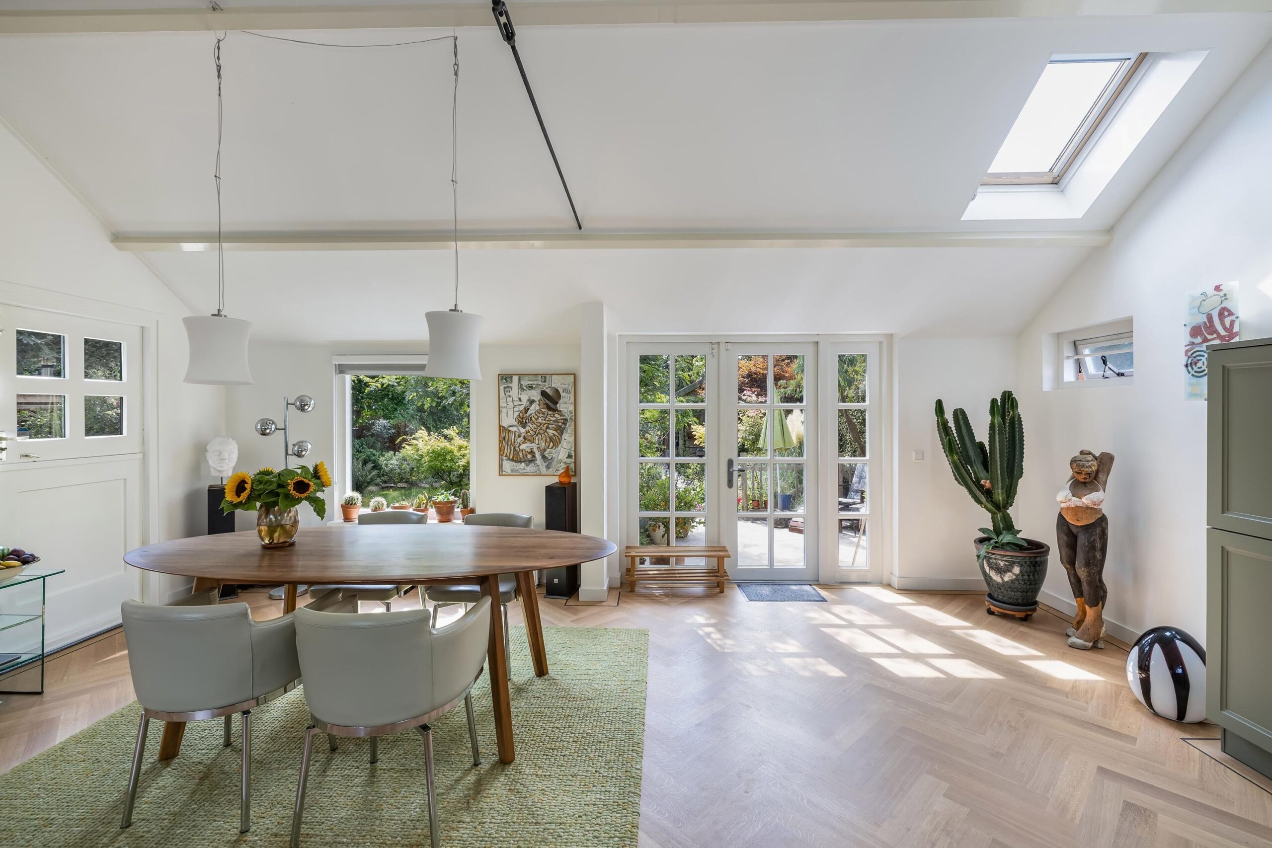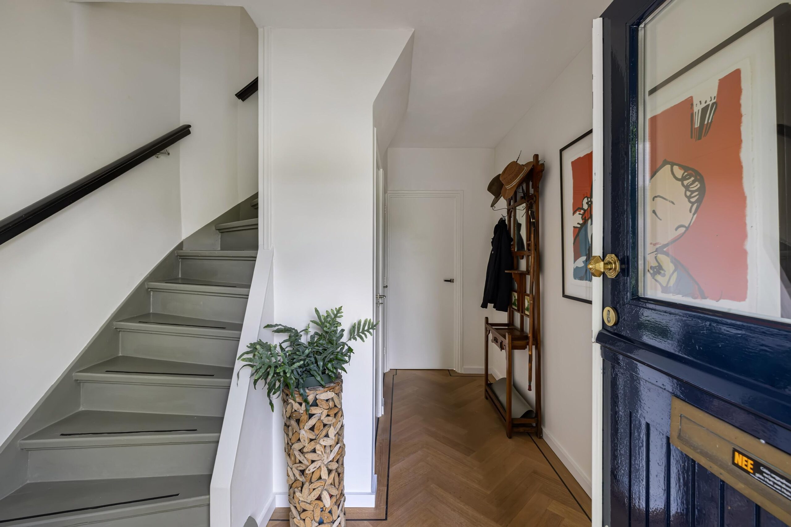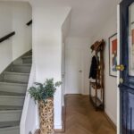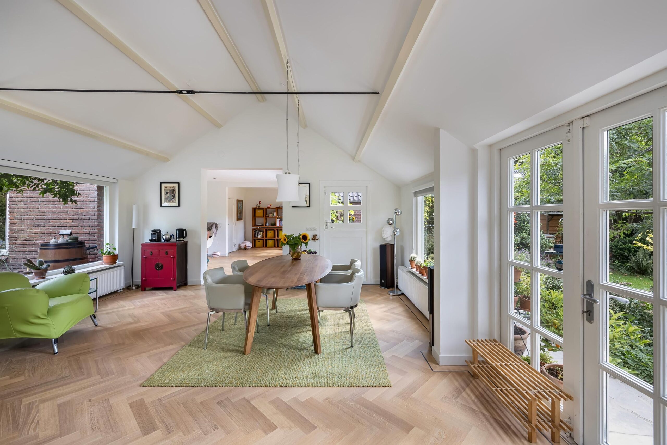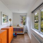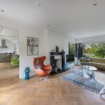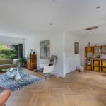 Het intieme bibliotheekhoekje is een uitnodiging om te verdwalen in verhalen, terwijl de lichte visgraat parketvloer onder uw voeten de elegantie van deze bijzondere woning versterkt.