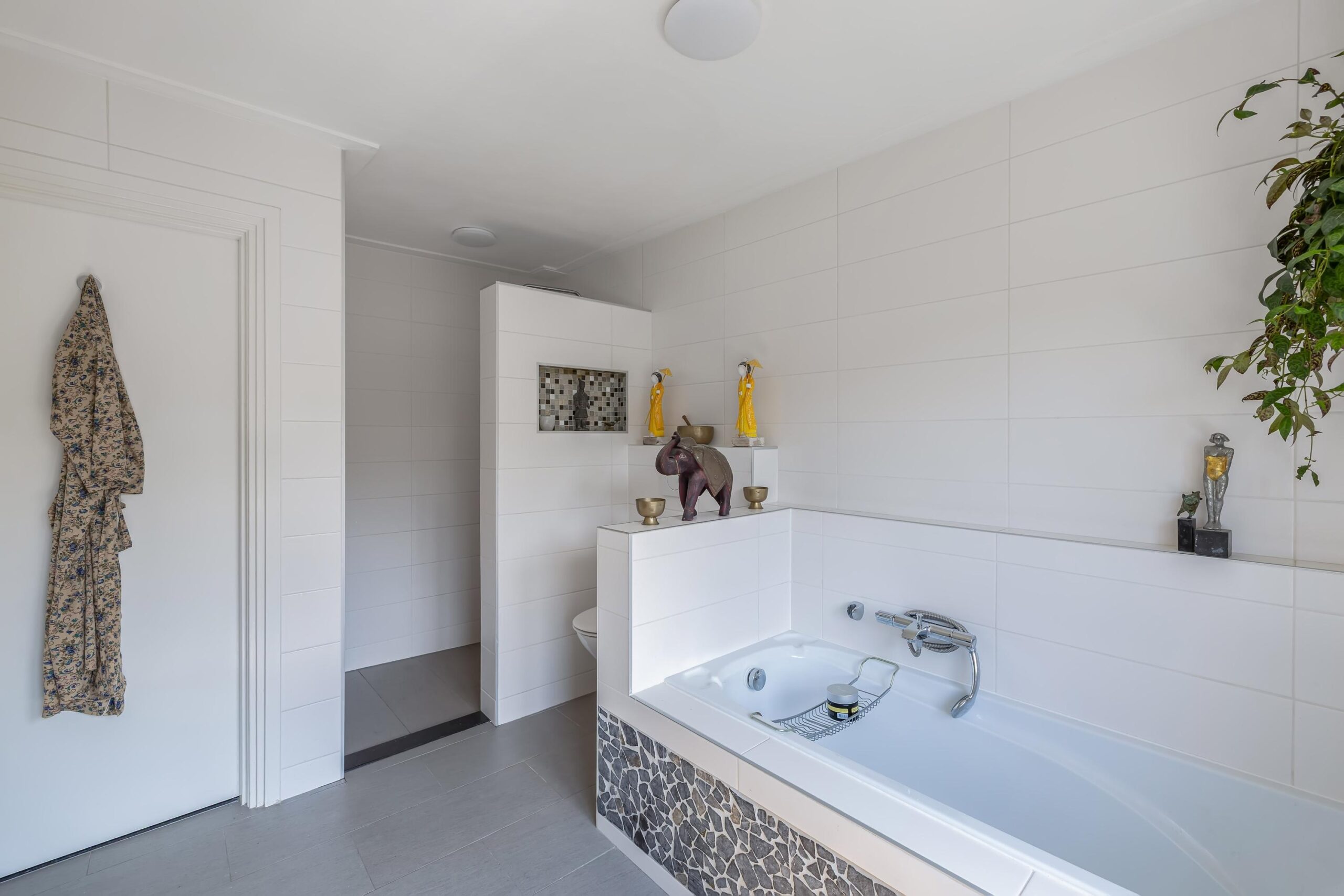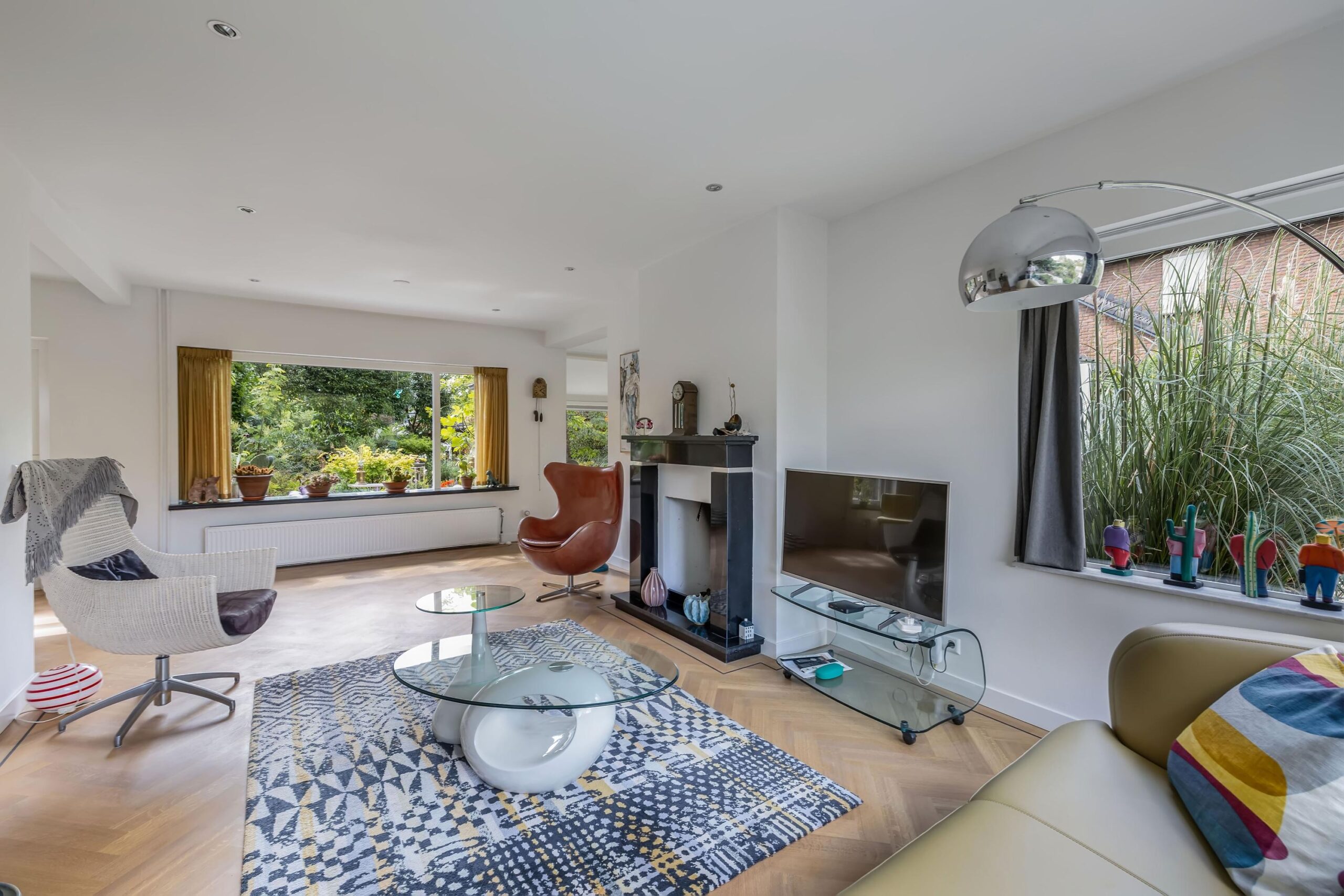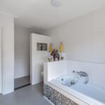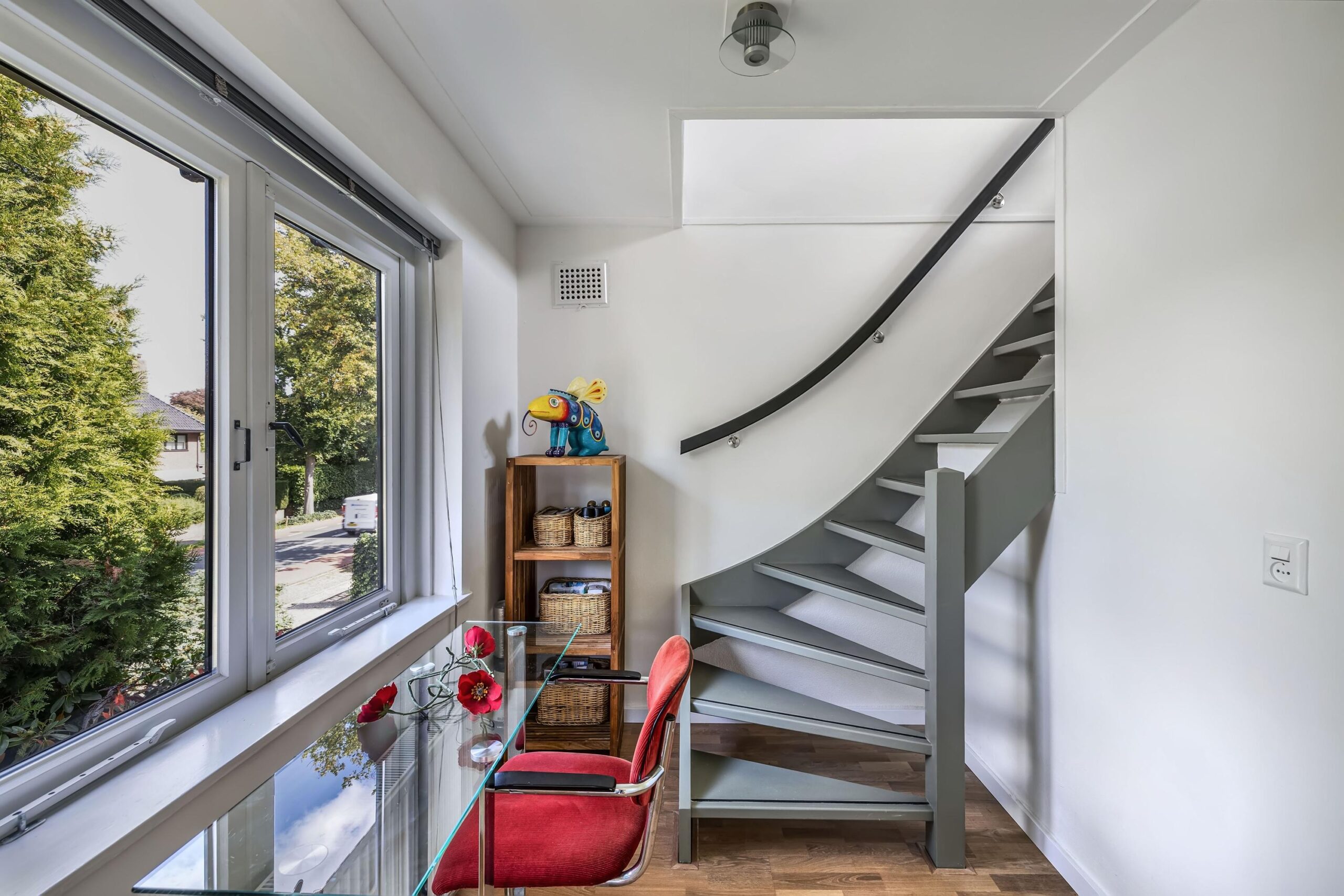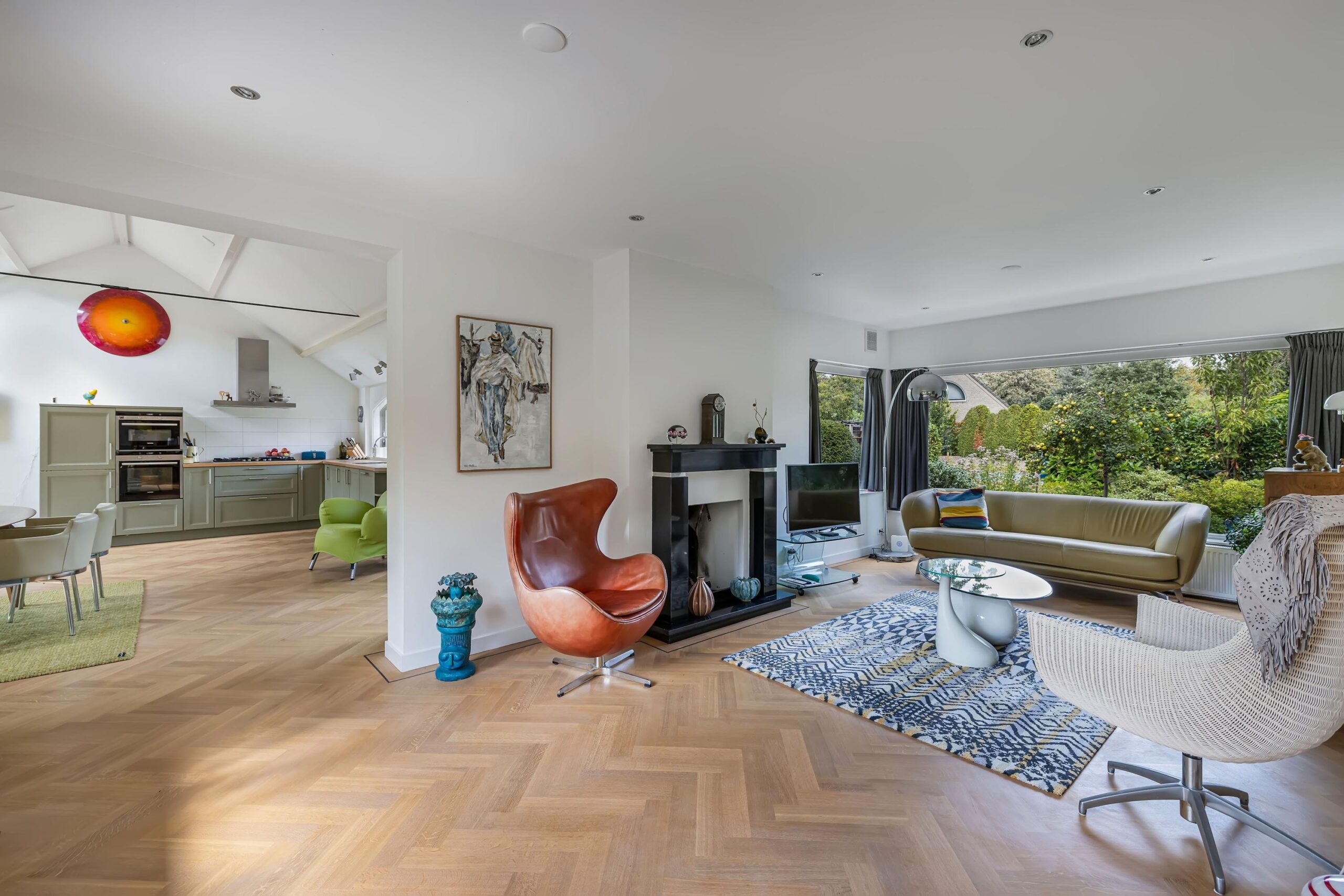 Het intieme bibliotheekhoekje is een uitnodiging om te verdwalen in verhalen, terwijl de lichte visgraat parketvloer onder uw voeten de elegantie van deze bijzondere woning versterkt.