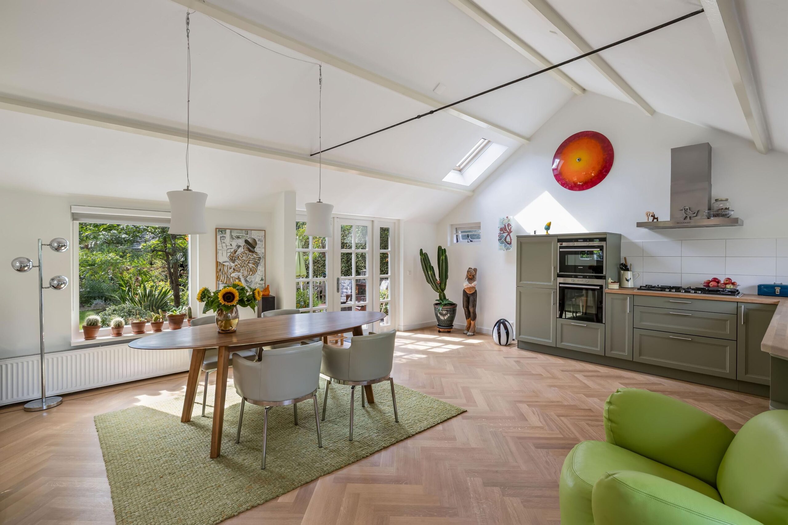De olijfgroene keuken, voorzien van de nieuwste Siemens apparatuur, nodigt uit tot culinaire avonturen en het delen van warme momenten met dierbaren.