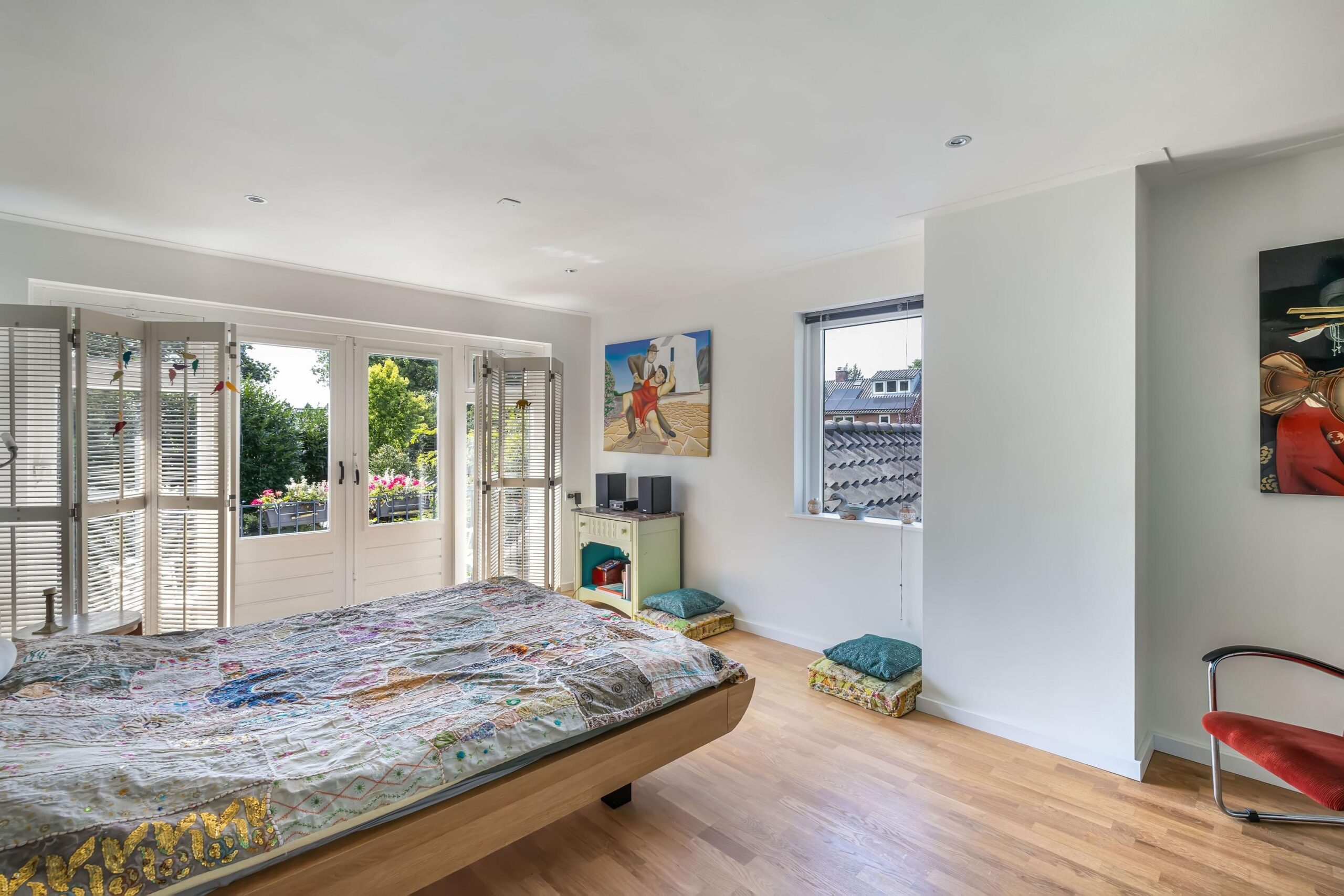 Op de eerste verdieping is een grote, smaakvolle masterslaapkamer, met strokenparket en openslaande deuren naar het balkon met fantastisch uitzicht.