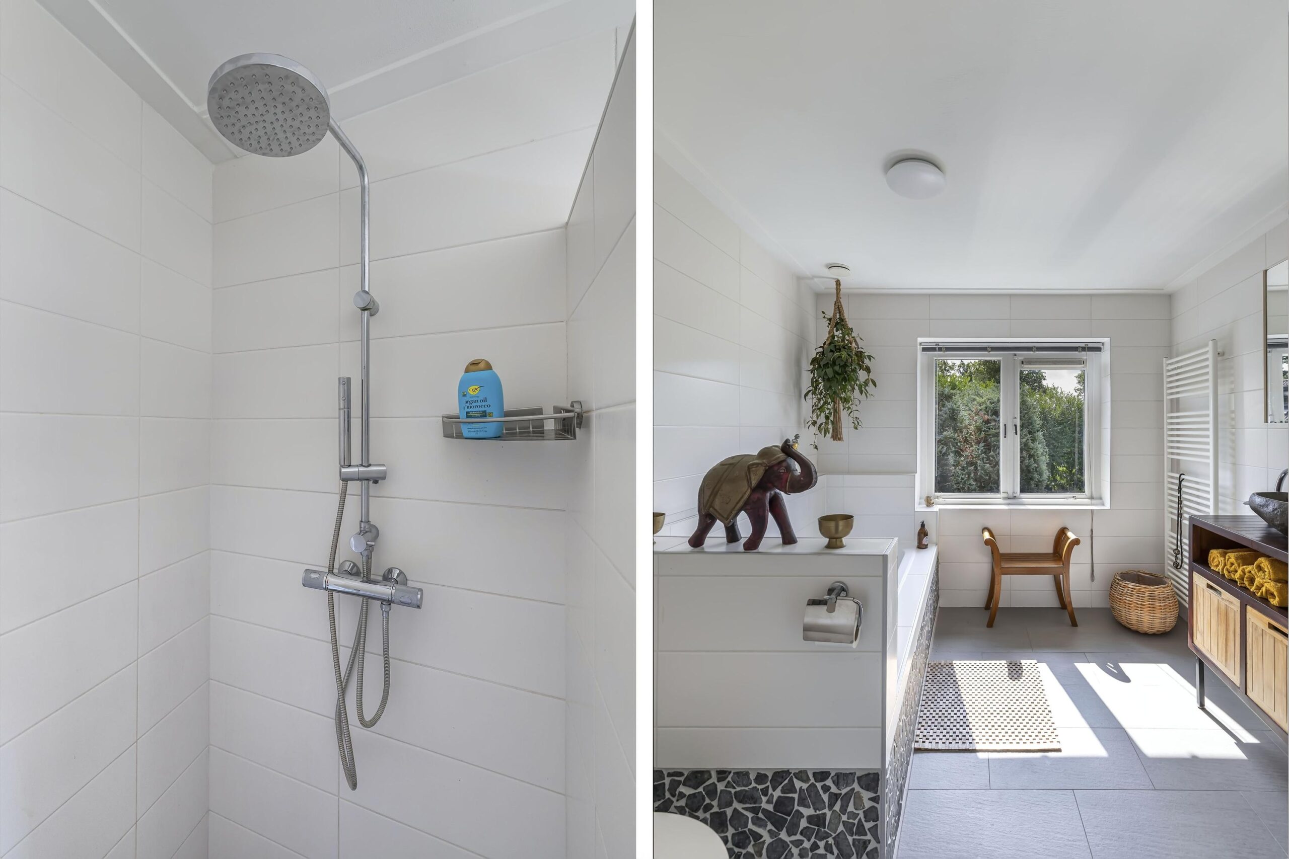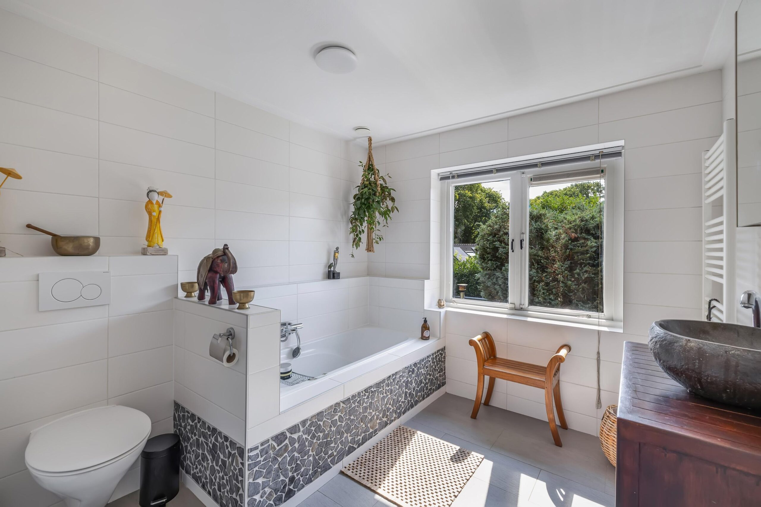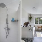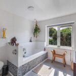 De grote gemoderniseerde badkamer heeft een bad en een inloopdouche en grote ramen met uitzicht op de tuin.