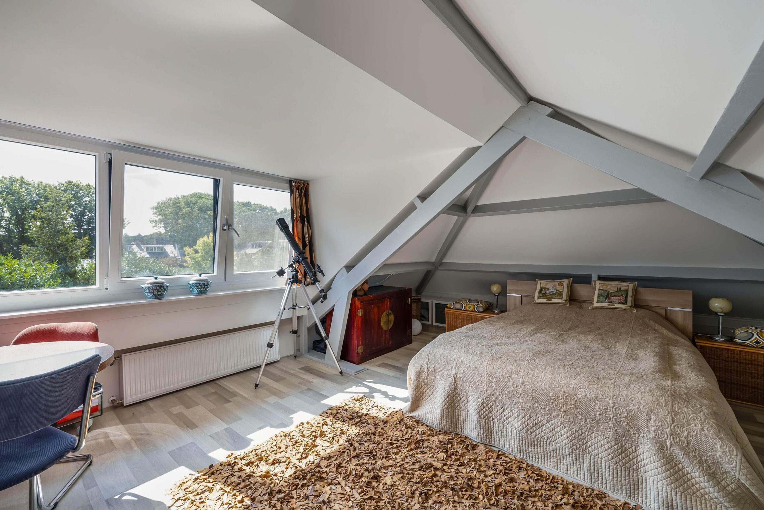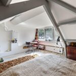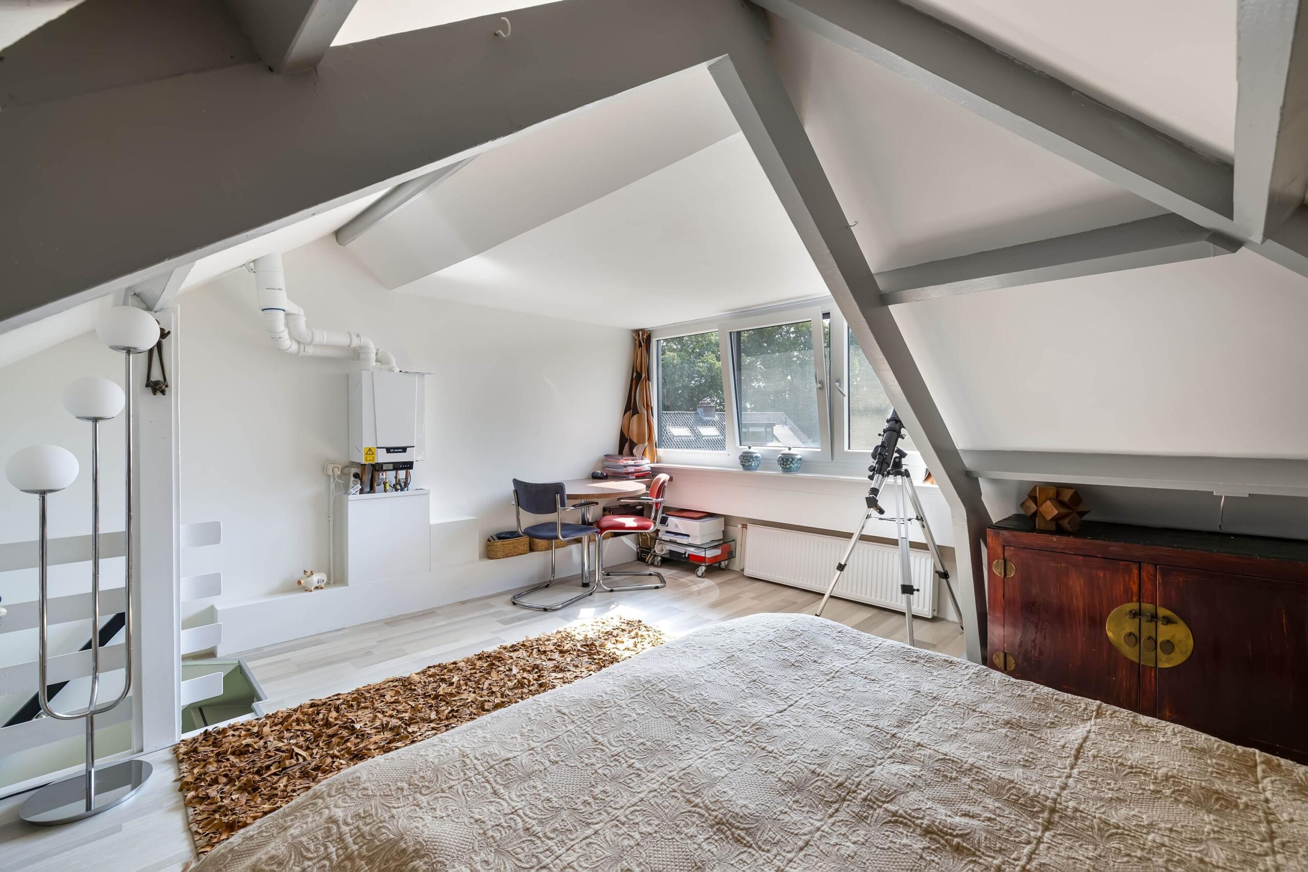 Via de opentrap naar zolder komt u in het ruime, lichte appartement met een grote dakkapel (2023), een 2-persoonsbed en een fijne, grote werkplek.