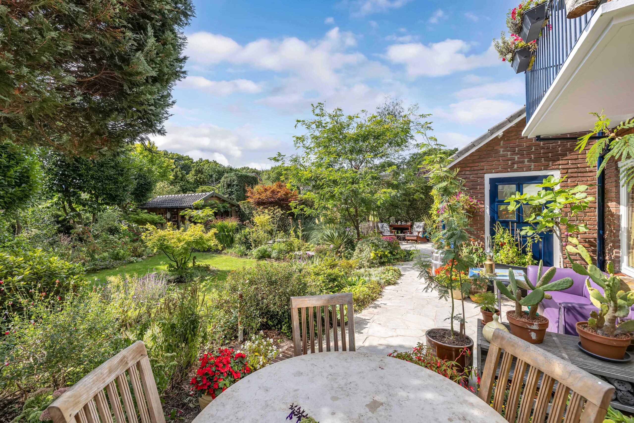 De tuin, rijk aan bloemen, vijvers en bomen, is uw eigen privéparadijs met een royaal terras dat zich uitstrekt langs het hele huis en drie sfeervolle zithoeken biedt — voor een zwoele ochtendkoffie, een ontspannen borrel of een romantisch diner onder de sterren. De achterom naar de achtertuin mag ook niet ontbreken.
