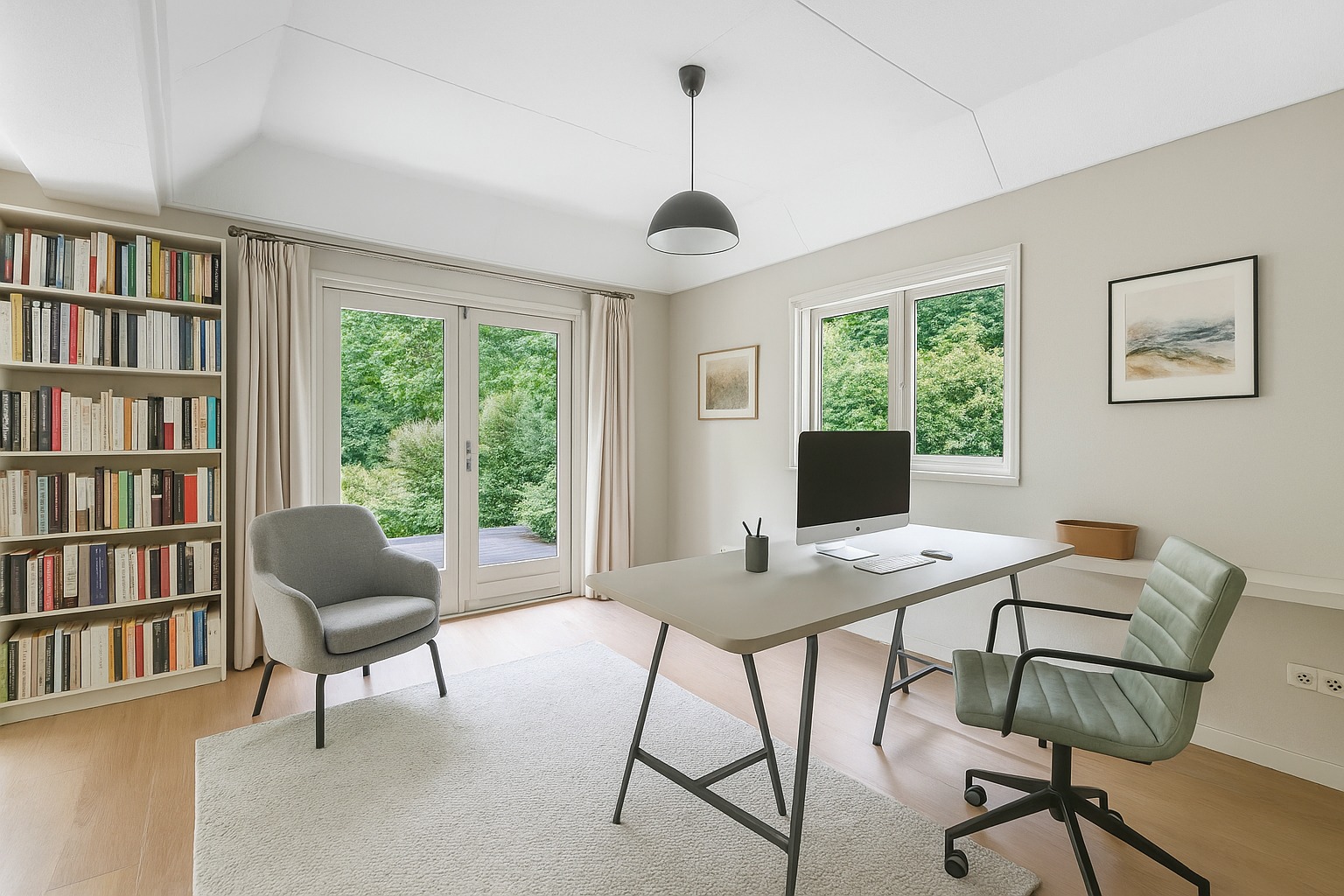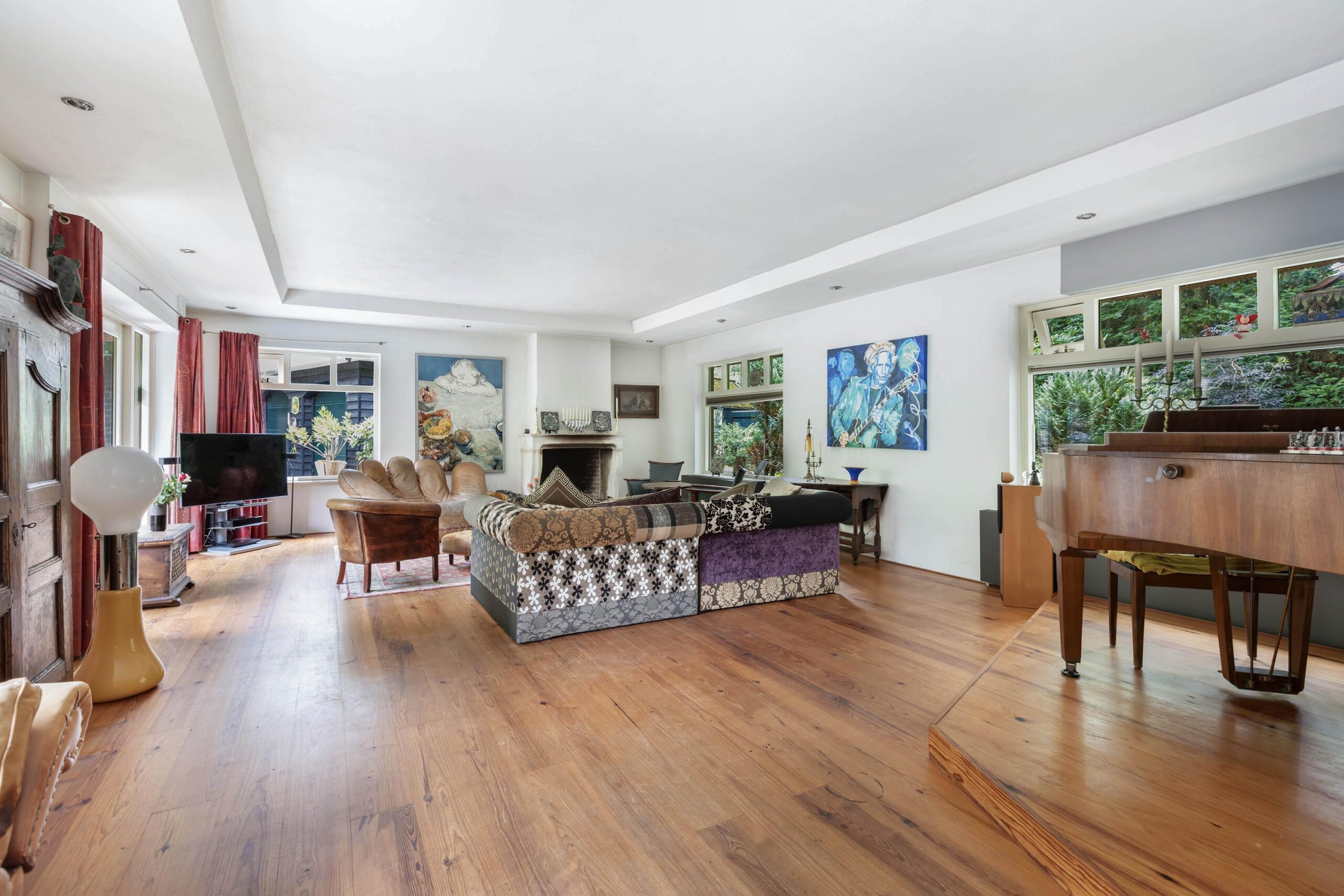 De centrale hal biedt toegang tot het souterrain, toilet en trapopgang. De royale living (ca. 54 m²) in het aangebouwde deel heeft grote raampartijen, een open haard en prachtig tuinzicht. De open keuken met eetkamer bevindt zich in het oorspronkelijke gedeelte en kan naar eigen smaak worden gemoderniseerd. Daarnaast is er een multifunctionele ruimte, ideaal als kantoor, atelier of praktijk aan huis.