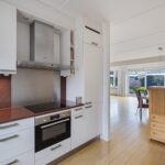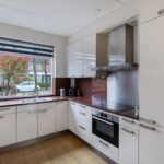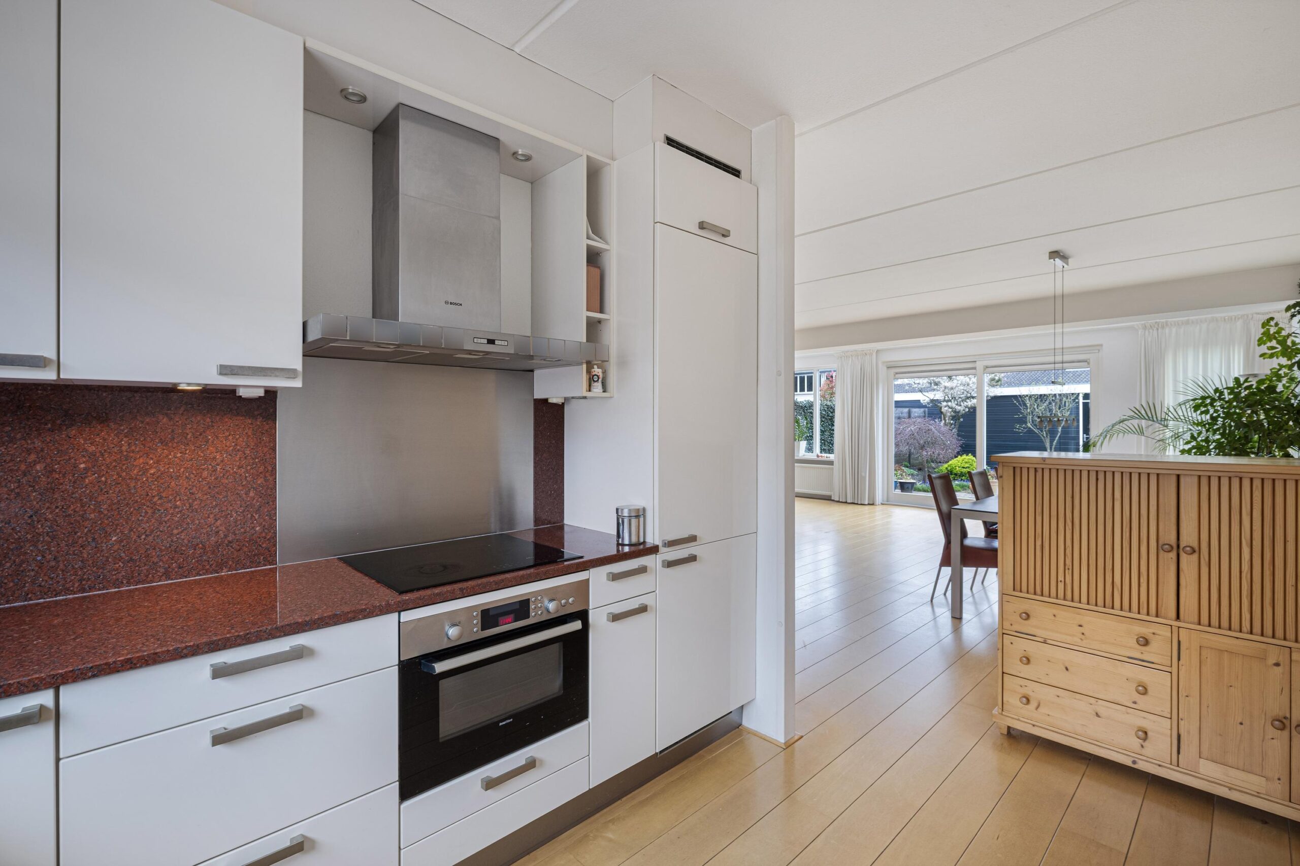 De halfopen keuken is praktisch ingericht en voorzien van diverse inbouwapparatuur, waaronder een inductiekookplaat, koelkast, vriezer, oven en afzuigkap.