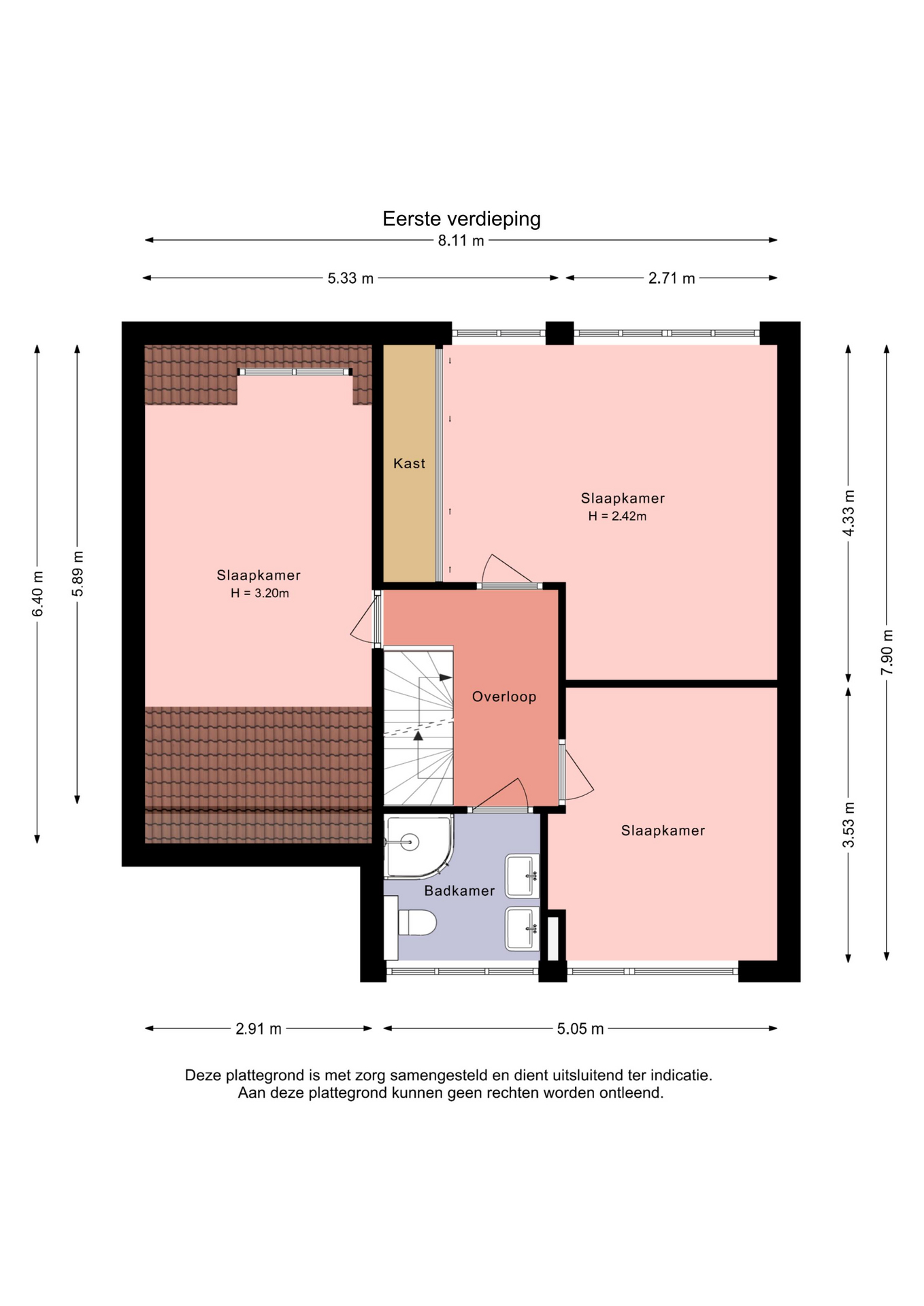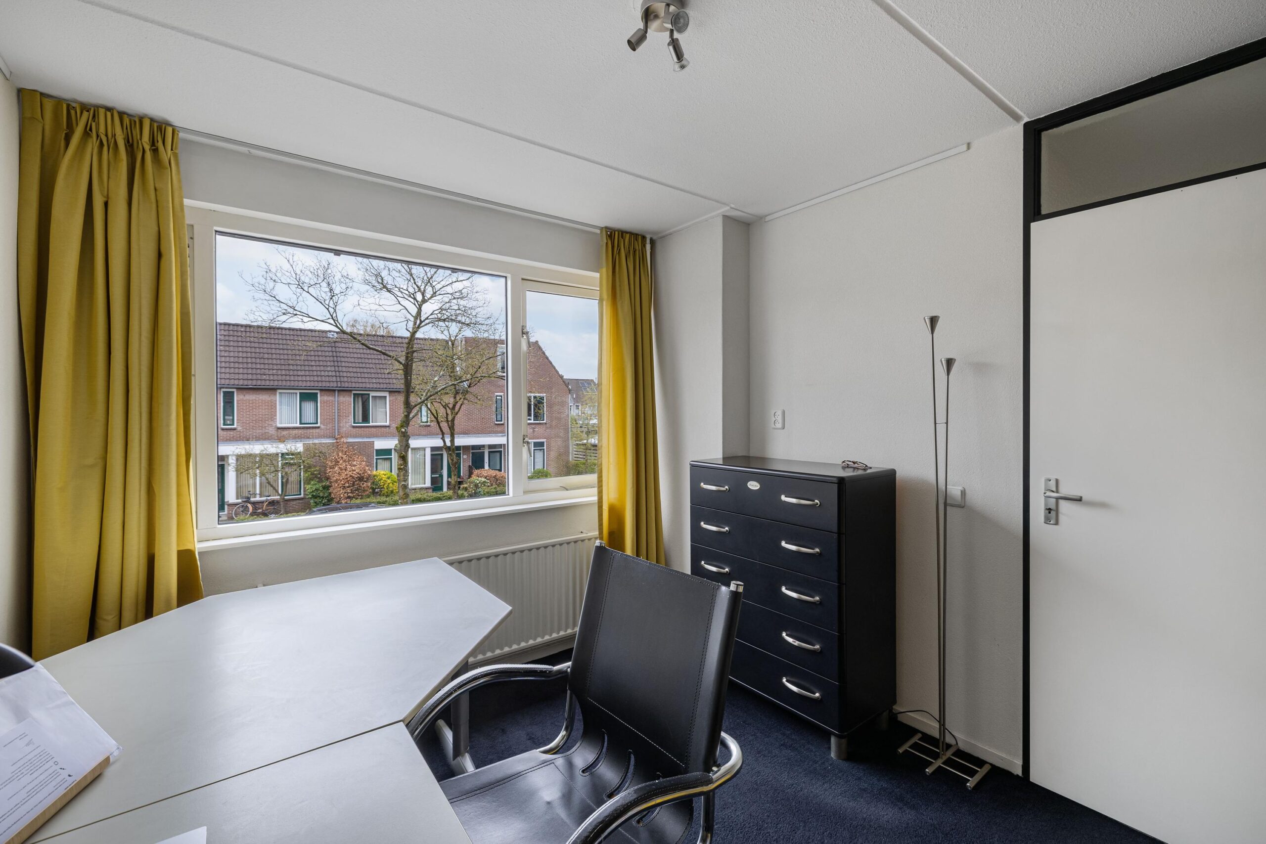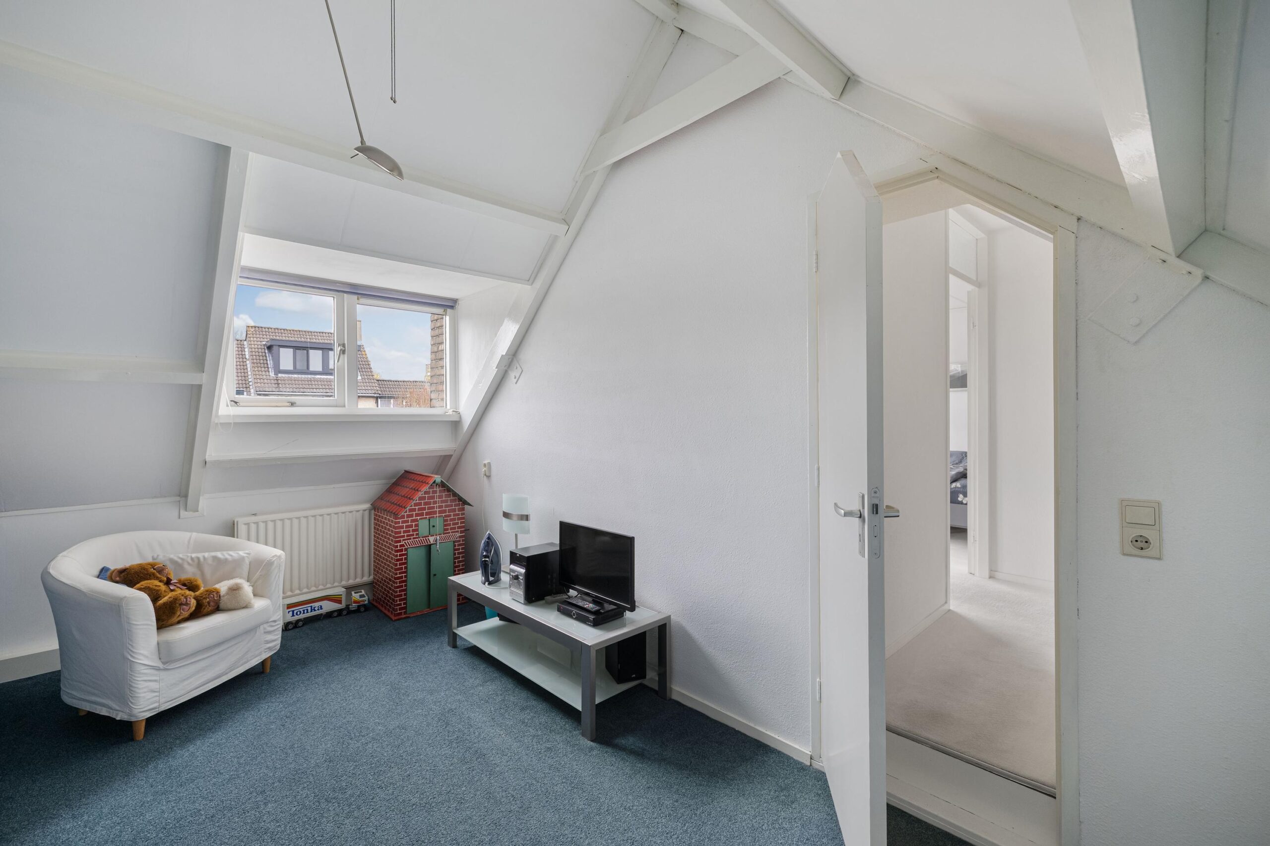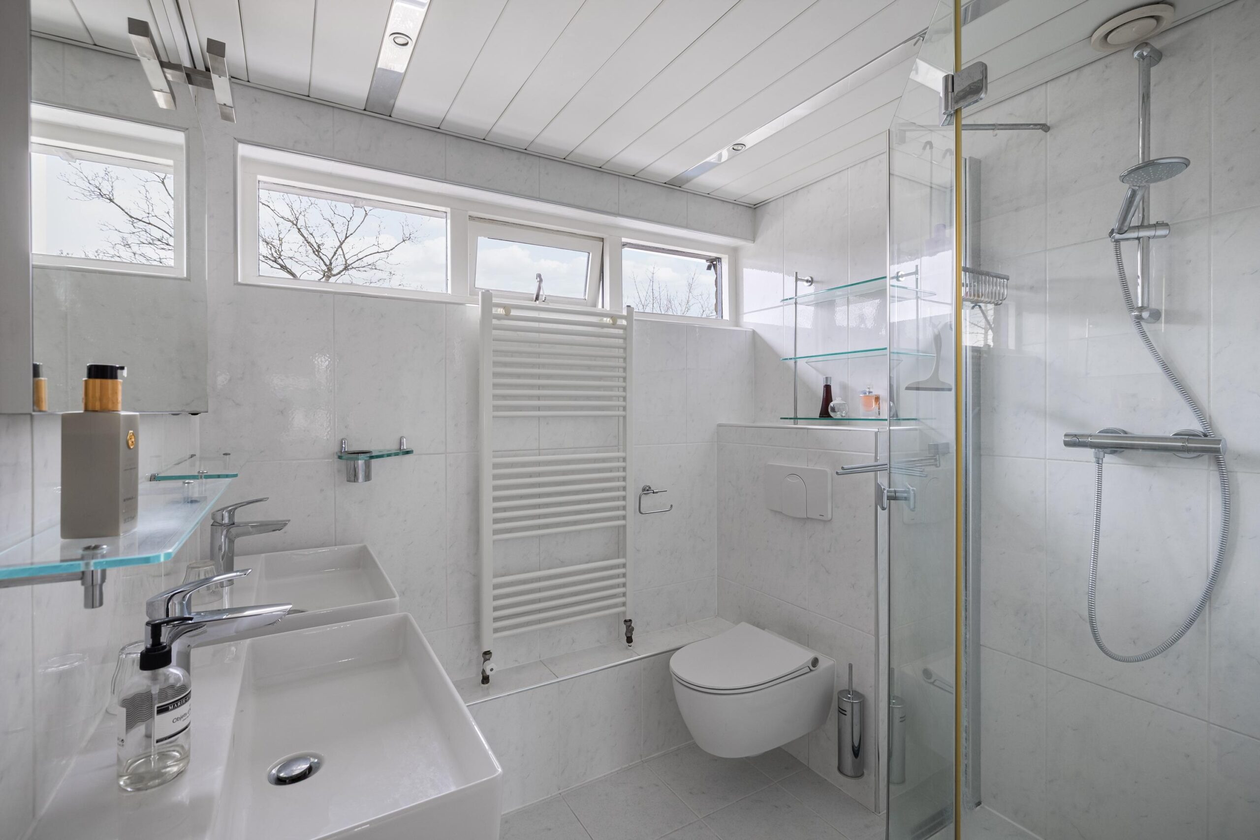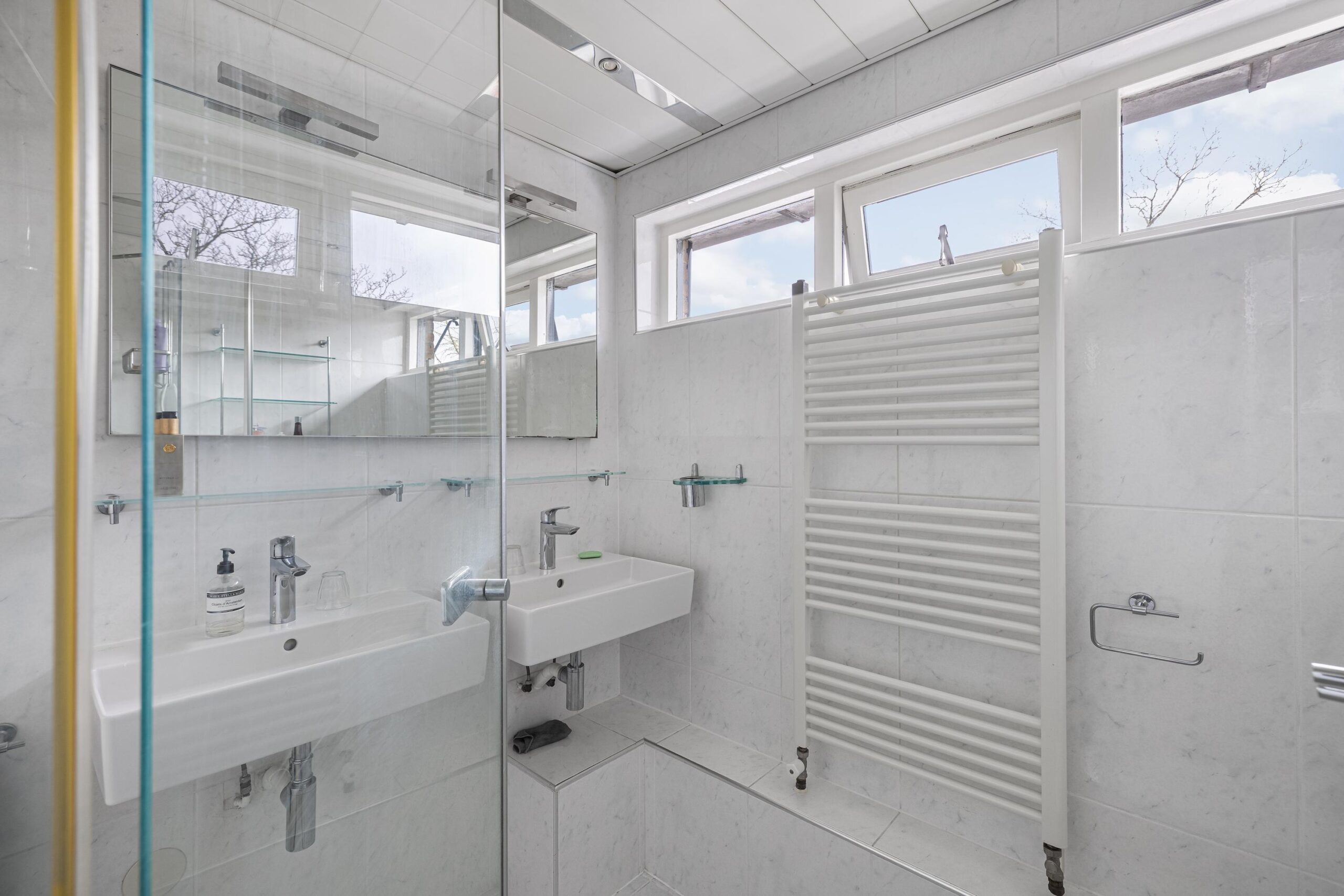 Op de eerste verdieping bevinden zich drie goed bemeten slaapkamers. De royale ouderslaapkamer is ontstaan uit twee kamers en beschikt over een grote kastenwand. Daarnaast is er een slaapkamer aan de voorzijde en een derde kamer boven de garage met dakkapel. De moderne badkamer is compleet uitgerust met een dubbele wastafel, tweede toilet, douche en handdoekradiator.