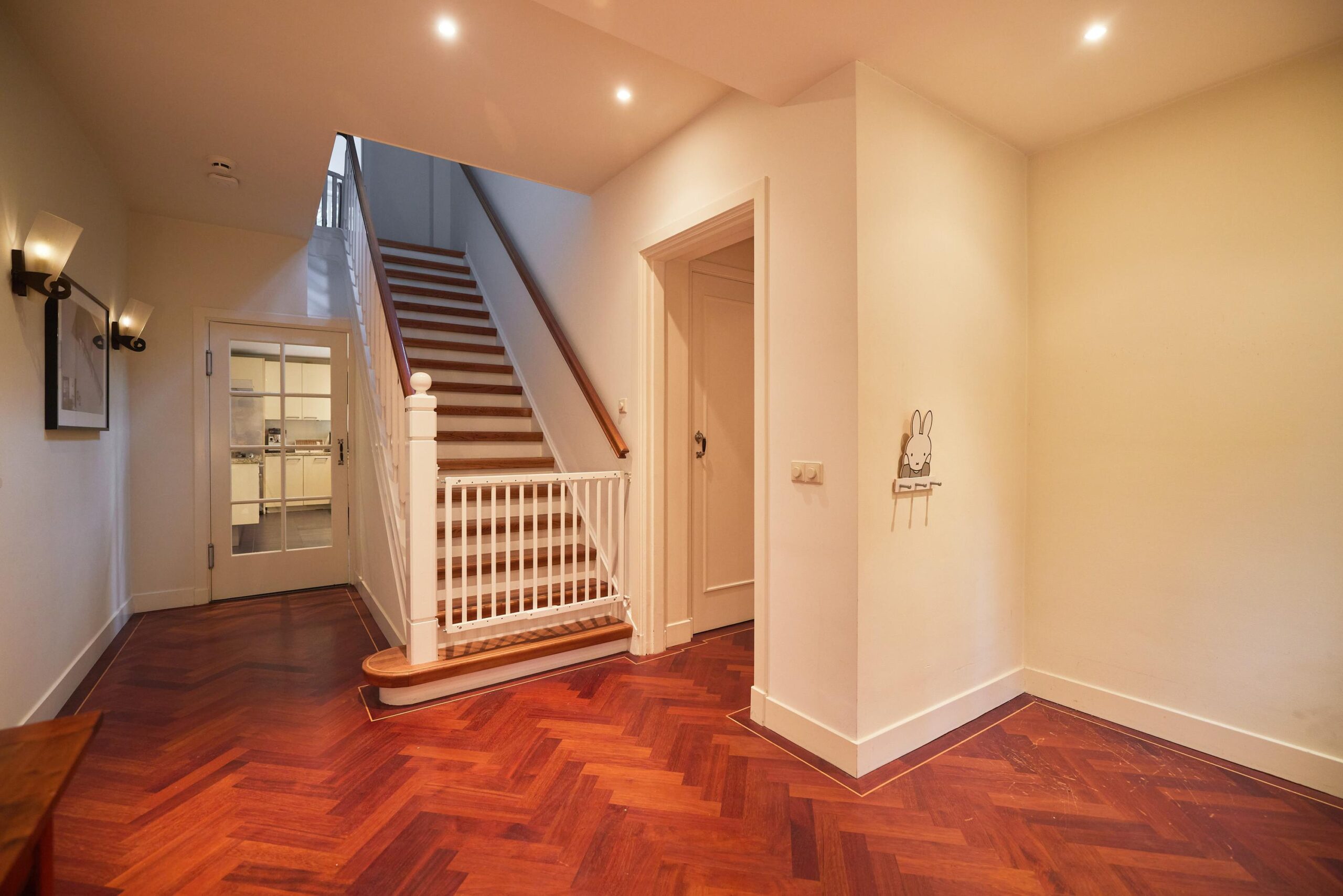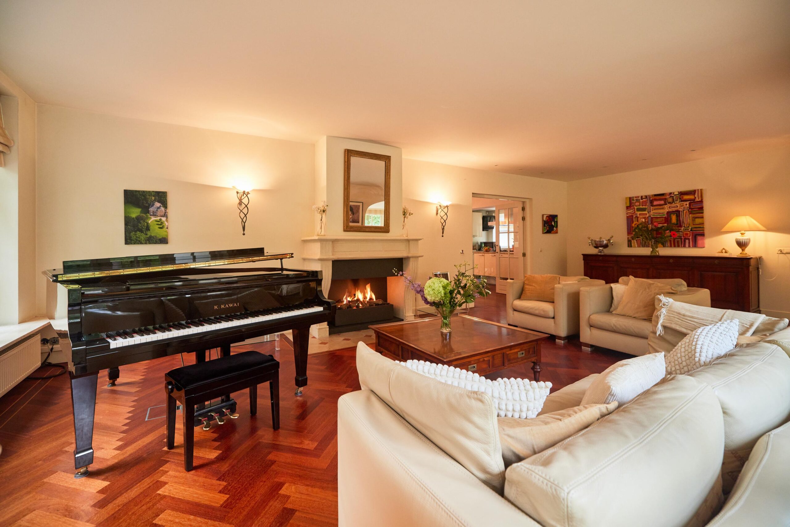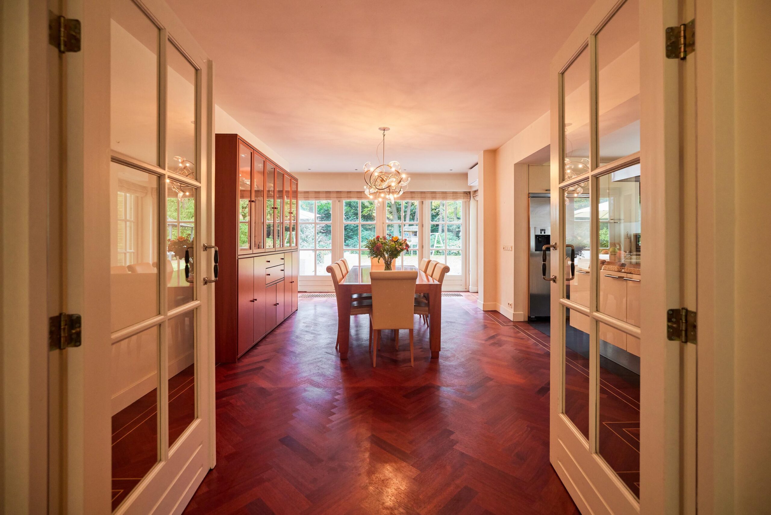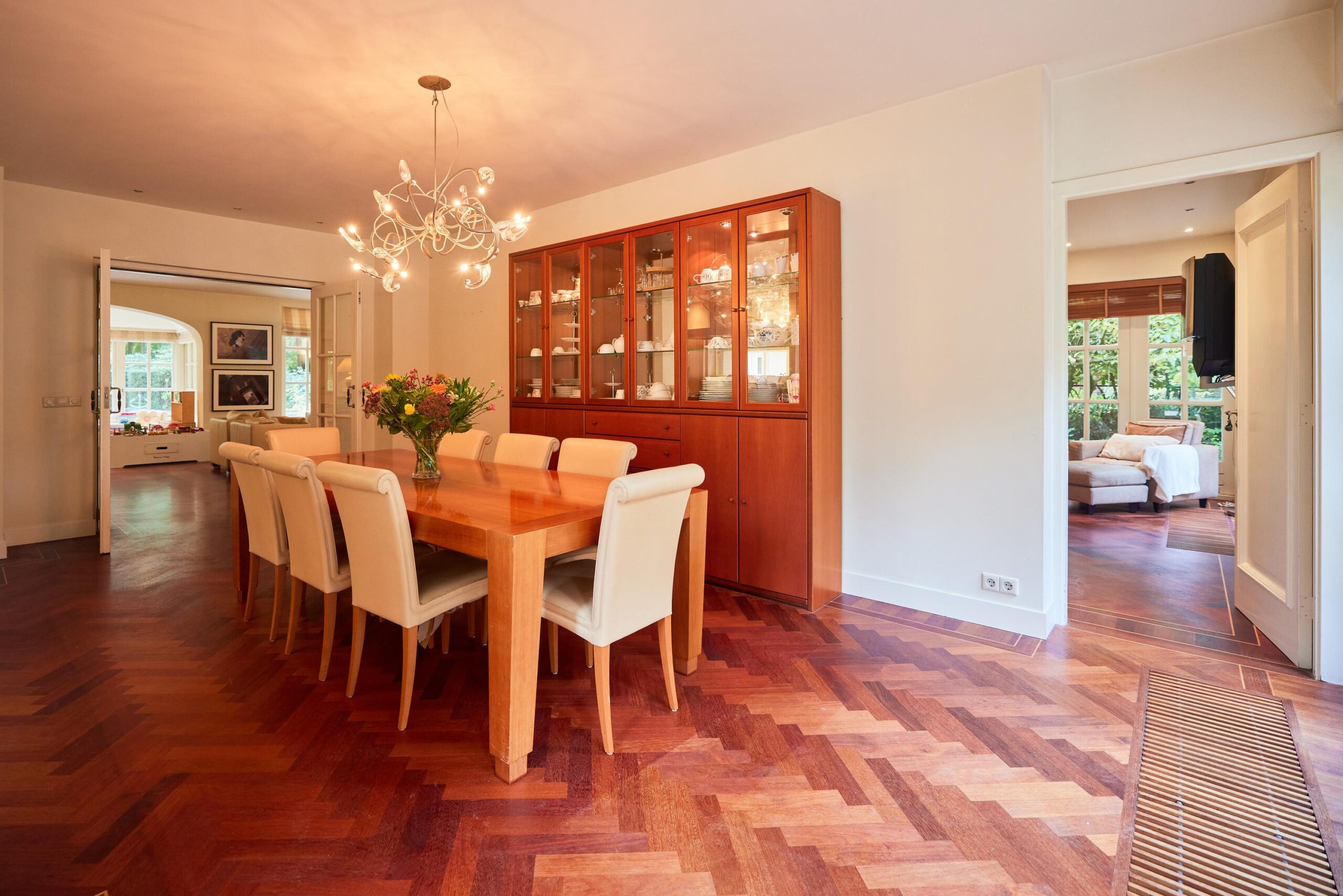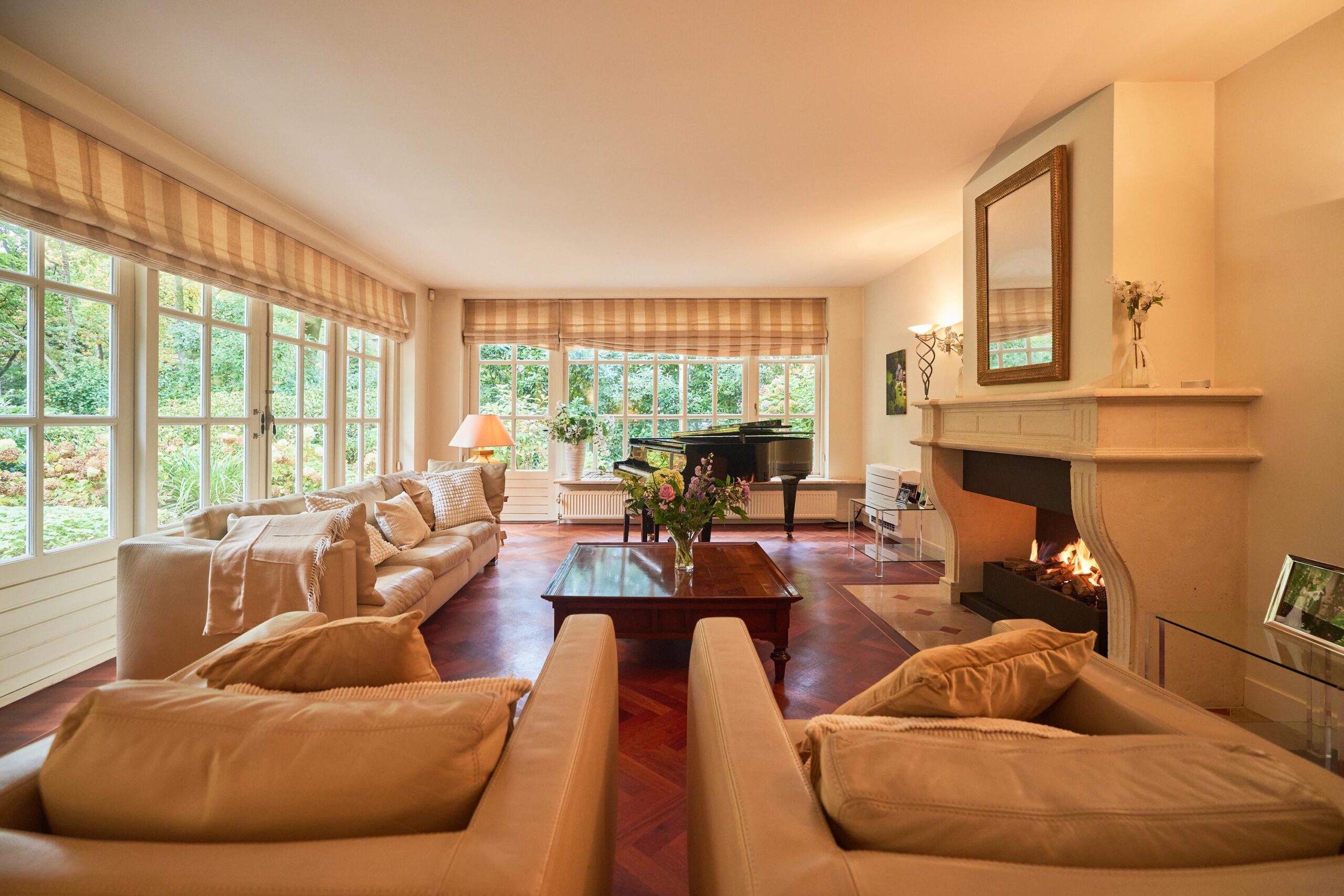 Via de ruime entree met trapopgang en gastentoilet kom je binnen in een lichte en sfeervolle villa met een uitstekend doordachte indeling. Zowel de begane grond als de eerste etage is voor voorzien van een prachtige parketvloer. De royale woonkamer met gashaard bevindt zich aan de voorzijde van het huis en kenmerkt zich door grote ramenpartijen, een erker en openslaande deuren naar de tuin.
