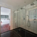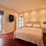 Via de robuuste trap kom je op de eerste verdieping, waar een royale overloop toegang biedt tot de verschillende vertrekken. Aan de voorzijde bevindt zich een ruime master bedroom met openslaande deuren naar een eigen balkon, wat zorgt voor veel licht en een fraai uitzicht. Aangrenzend ligt een ruime inloopkast met veel opbergruimte en een eigen badkamer en-suite. De badkamer is uitgerust met een dubbele inloopdouche, wastafelmeubel met dubbele waskommen en een toilet.