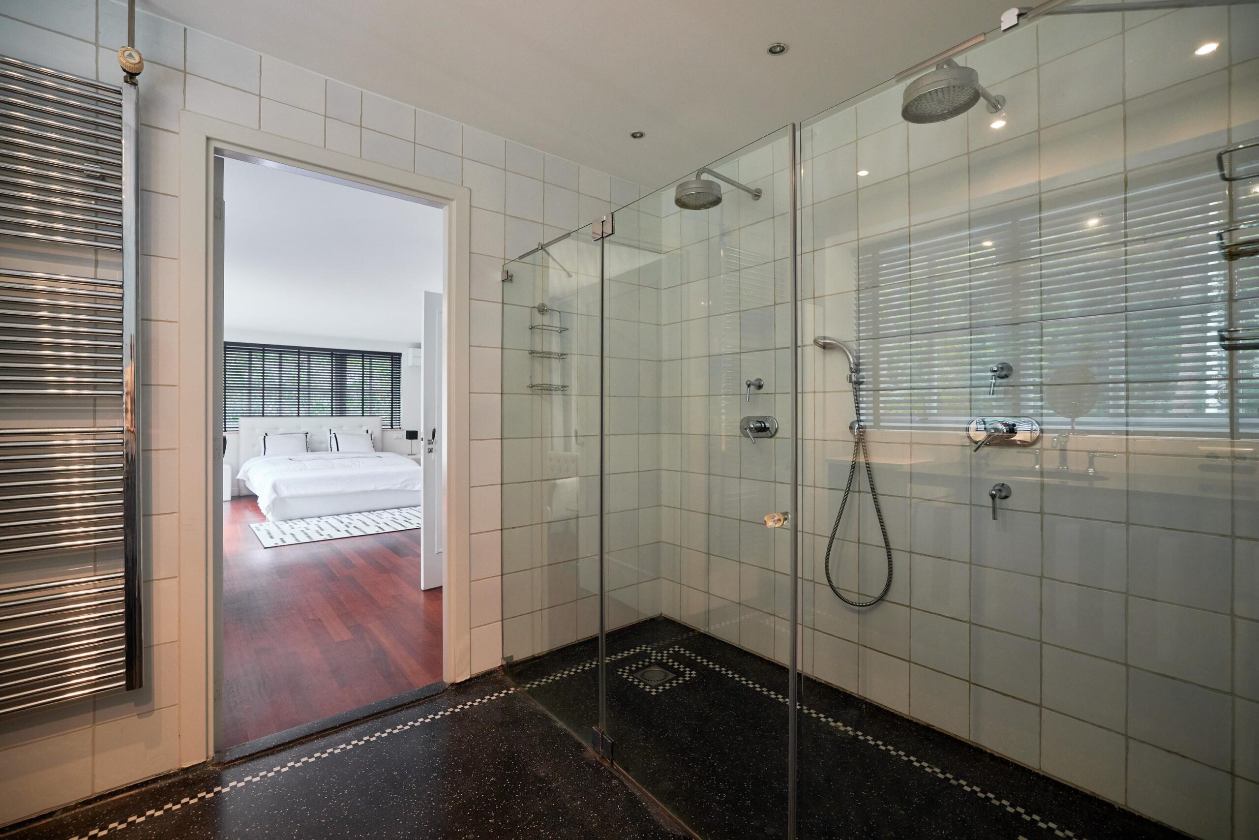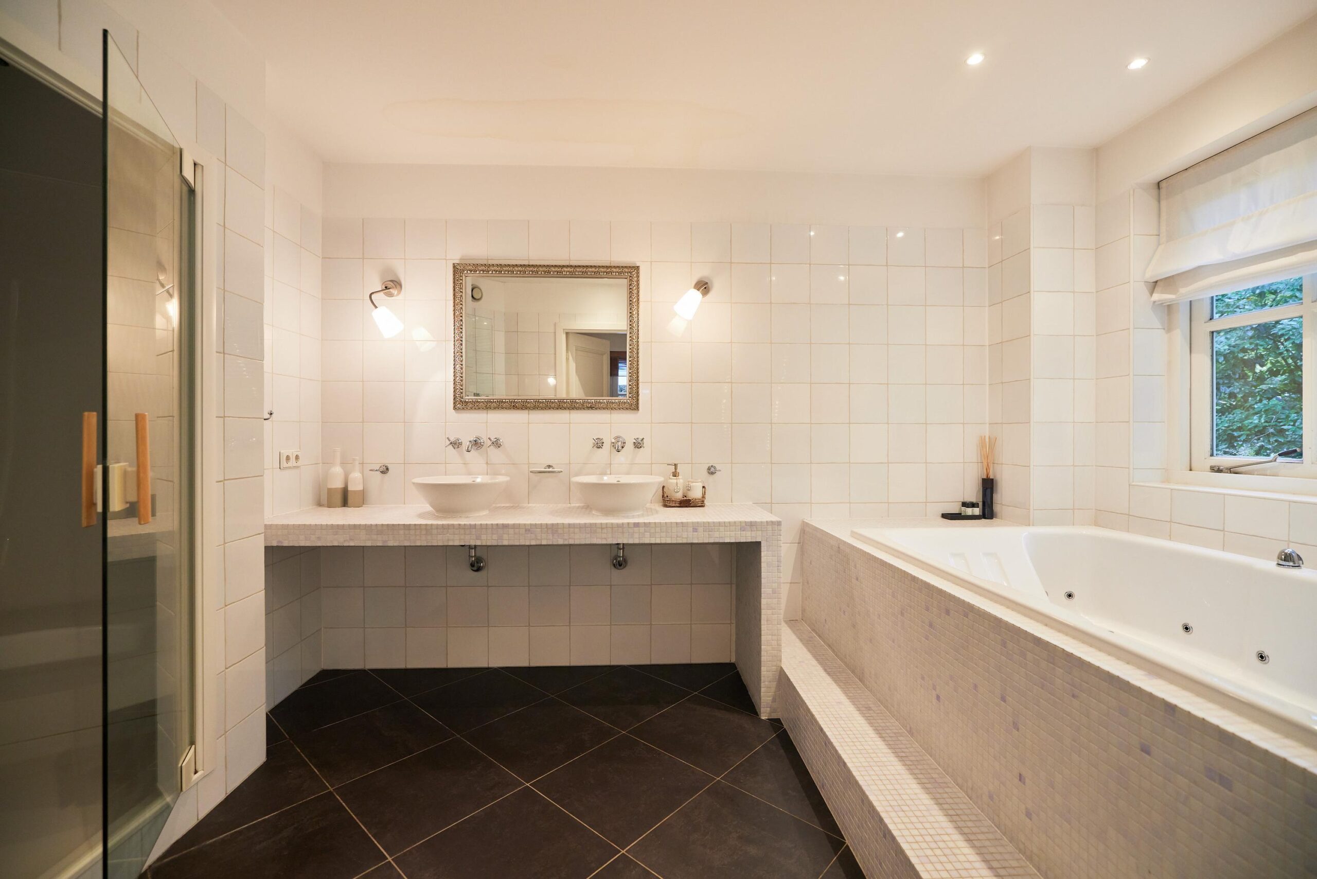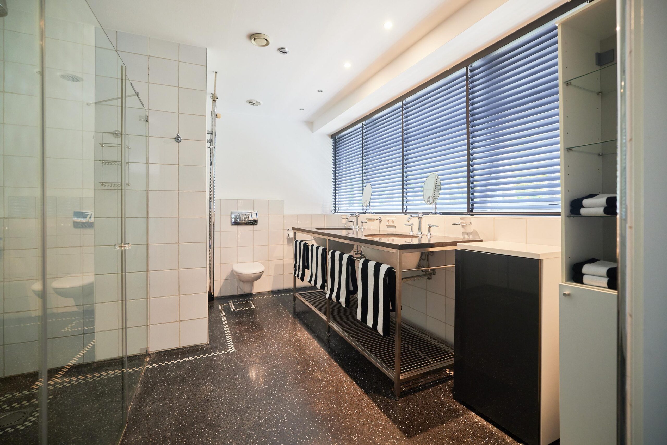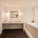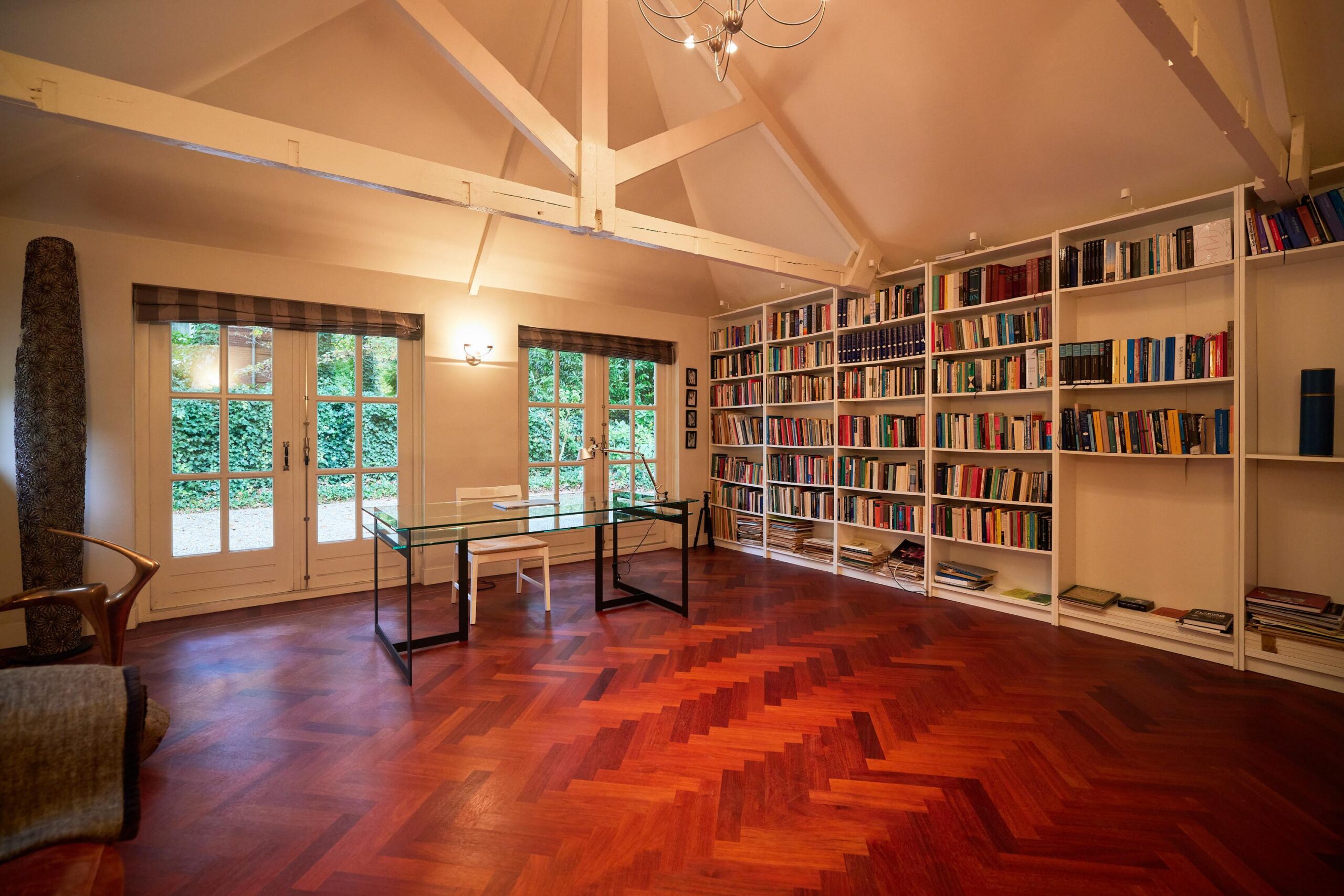 Op de begane grond bevindt zich daarnaast een ruime slaapkamer met stijlvolle en-suite badkamer uitrust met ligbad, inloopdouche, dubbele wastafel en toilet. Door de aanwezigheid van een slaapkamer met badkamer op de begane grond is deze villa tevens levensloopbestendig. Daarnaast is er een aparte bibliotheek/werkkamer die zich uitstekend leent als tweede zithoek, speelruimte of kantoor.