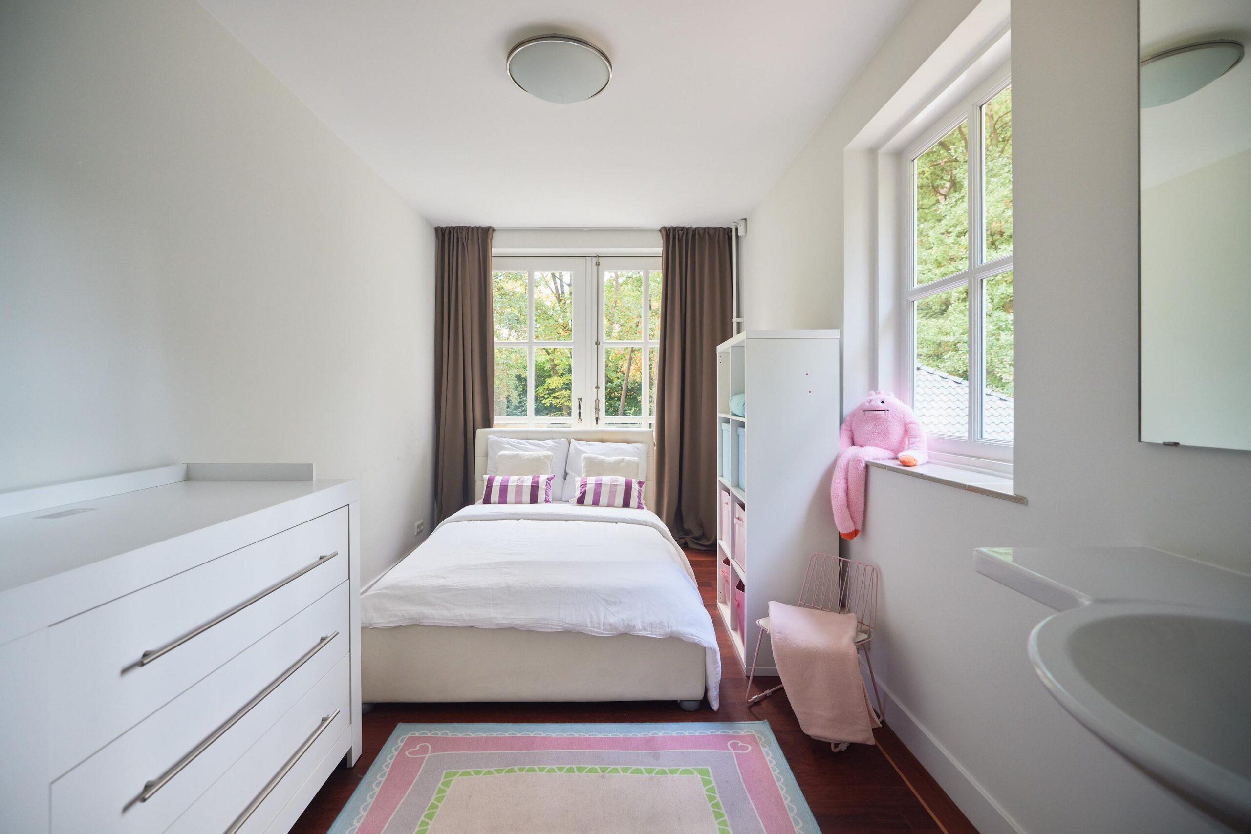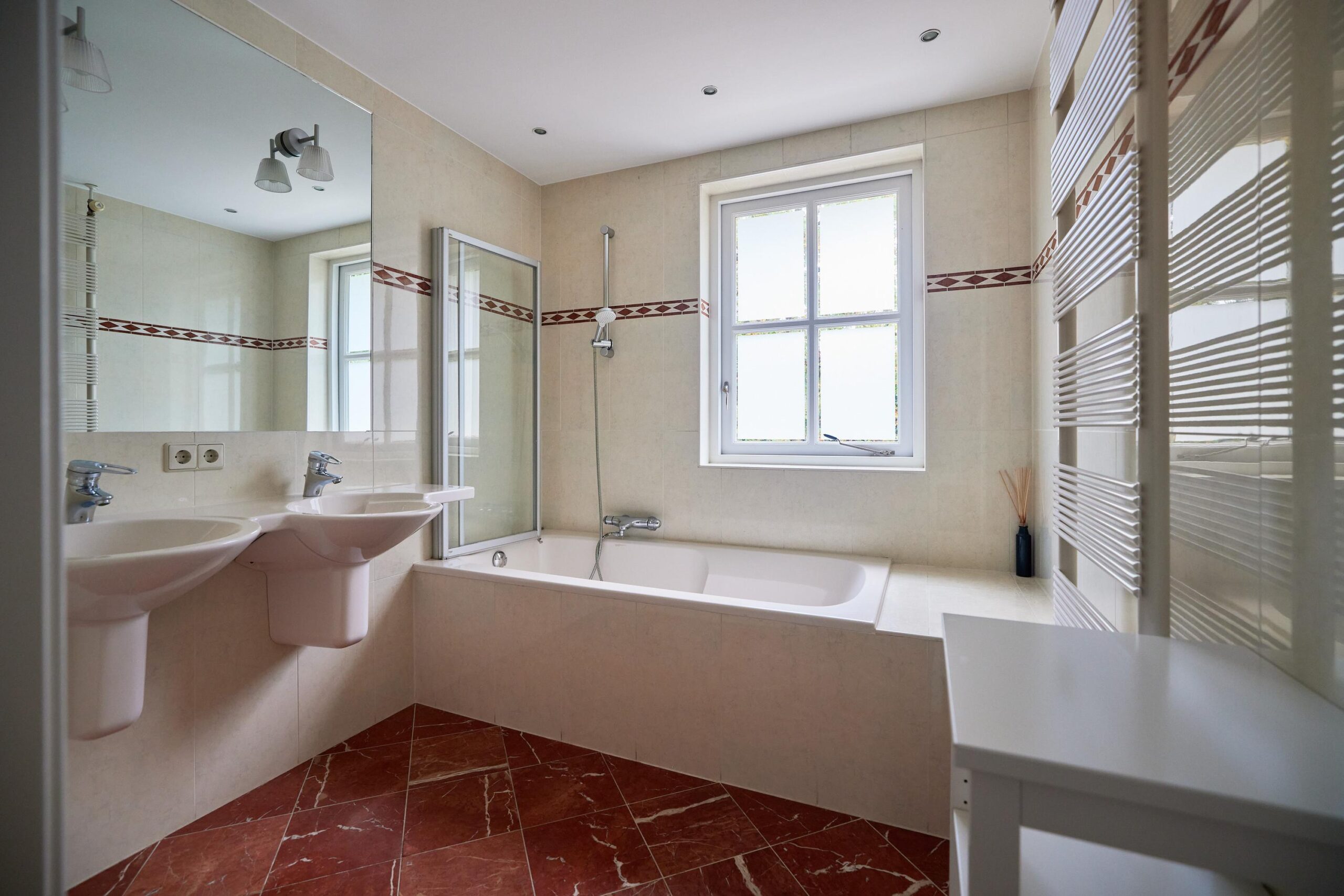Op deze verdieping bevinden zich tevens nog een tweetal ruime slaapkamers, een separaat gastentoilet met fontein en een tweede, kleinere badkamer met ligbad met douche en dubbelwastafelmeubel– ideaal voor gebruik door gasten of kinderen. Vanuit één van deze kamers is er toegang tot een royaal balkon aan de achterzijde van de woning met zicht over de groene tuin.