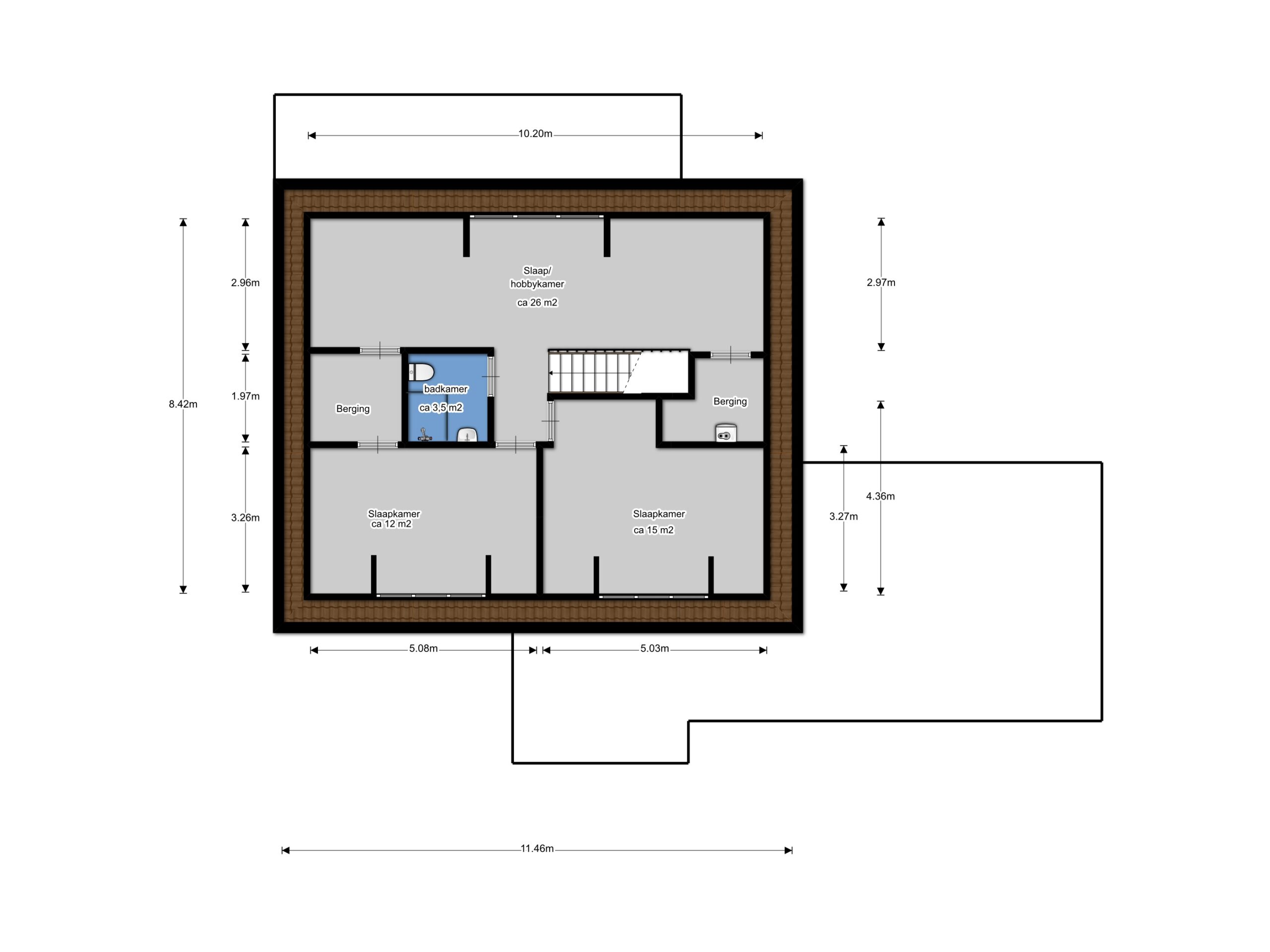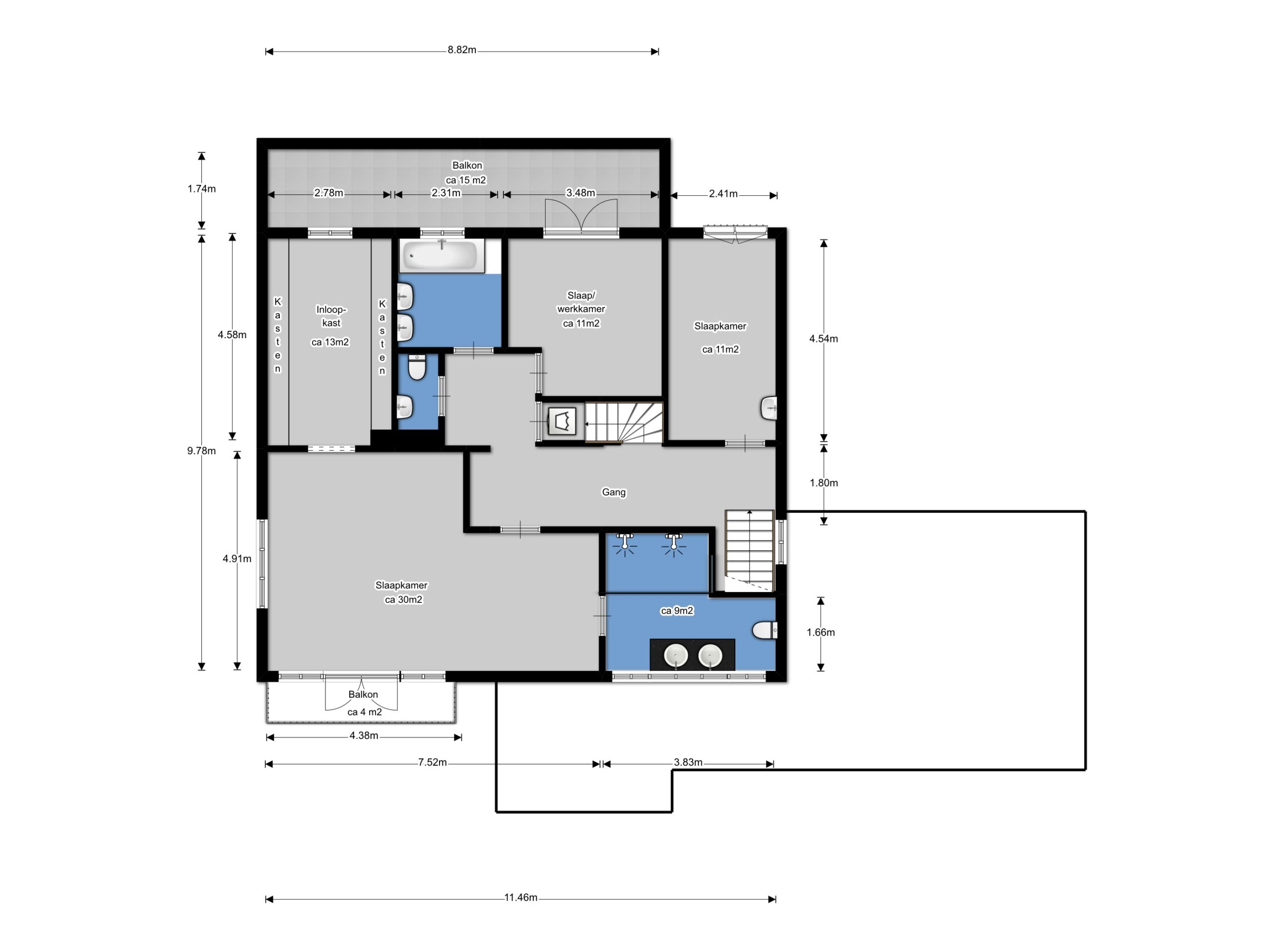 De tweede verdieping is verrassend ruim en biedt volop mogelijkheden. Hier bevinden zich nog twee slaapkamers en een vierde badkamer, voorzien van een inloopdouche, wastafel en toilet. Deze verdieping is perfect geschikt voor een groot gezin, maar kan ook uitstekend dienstdoen als gastenverblijf of voor een au-pair.
