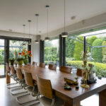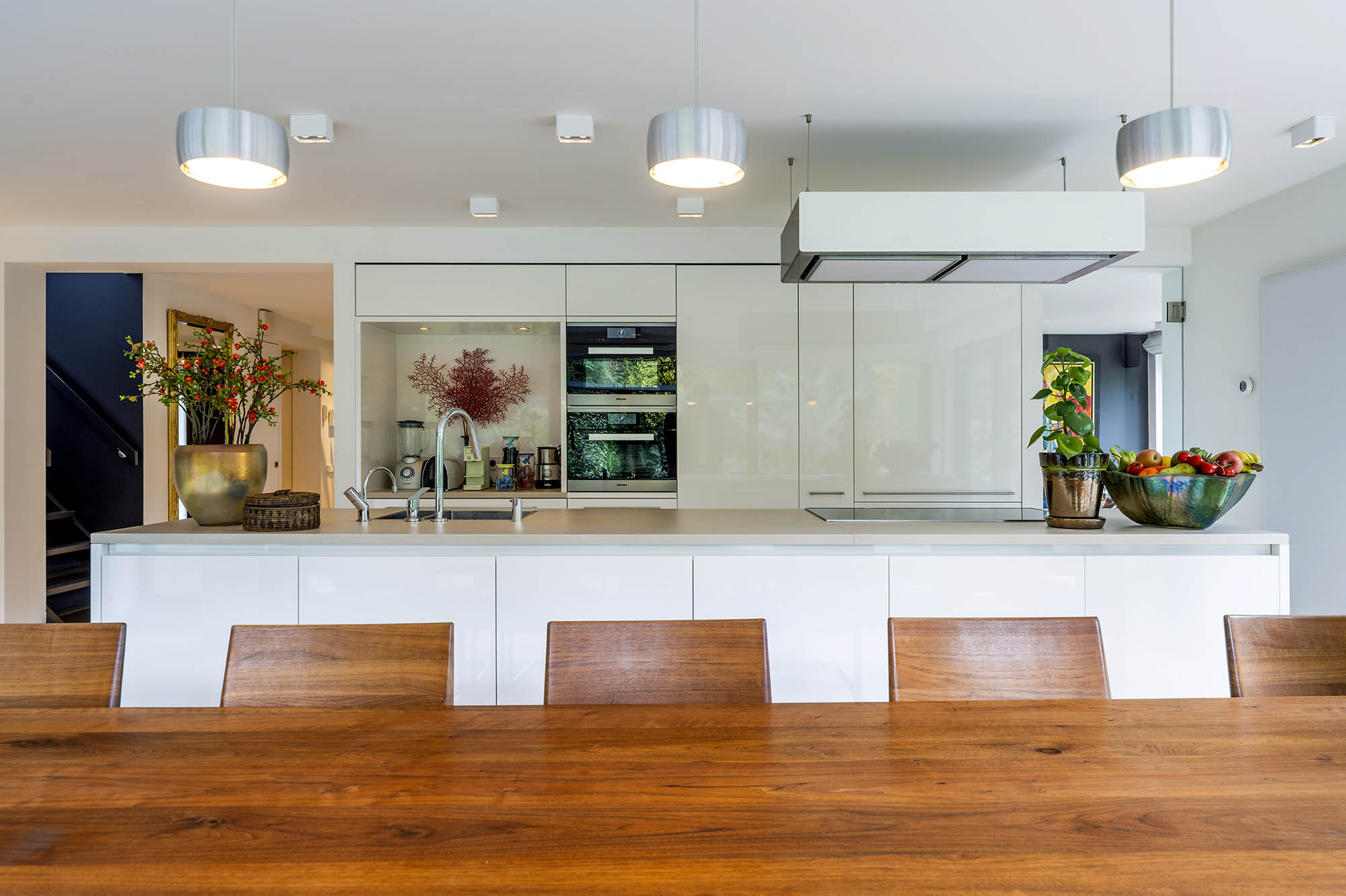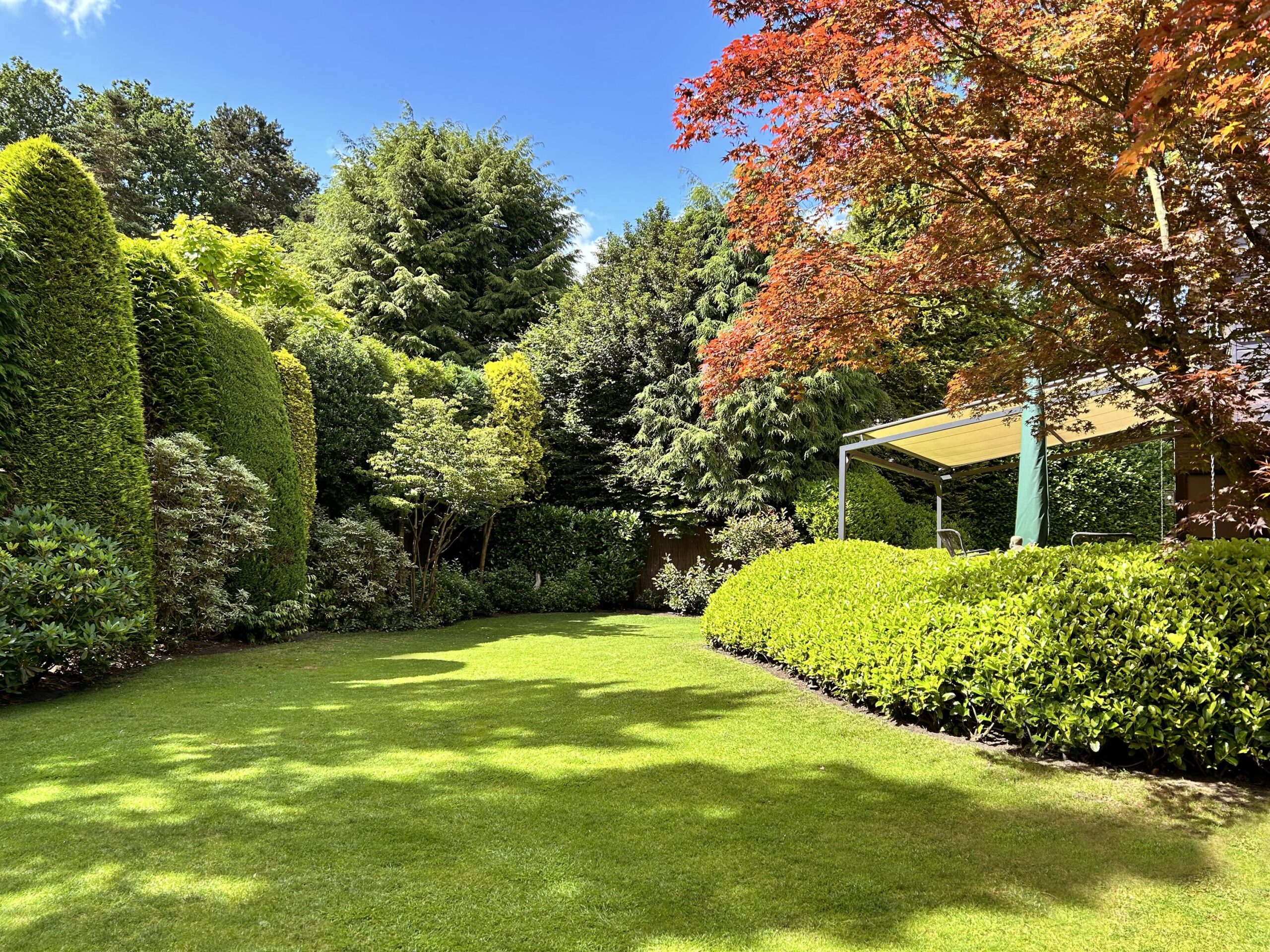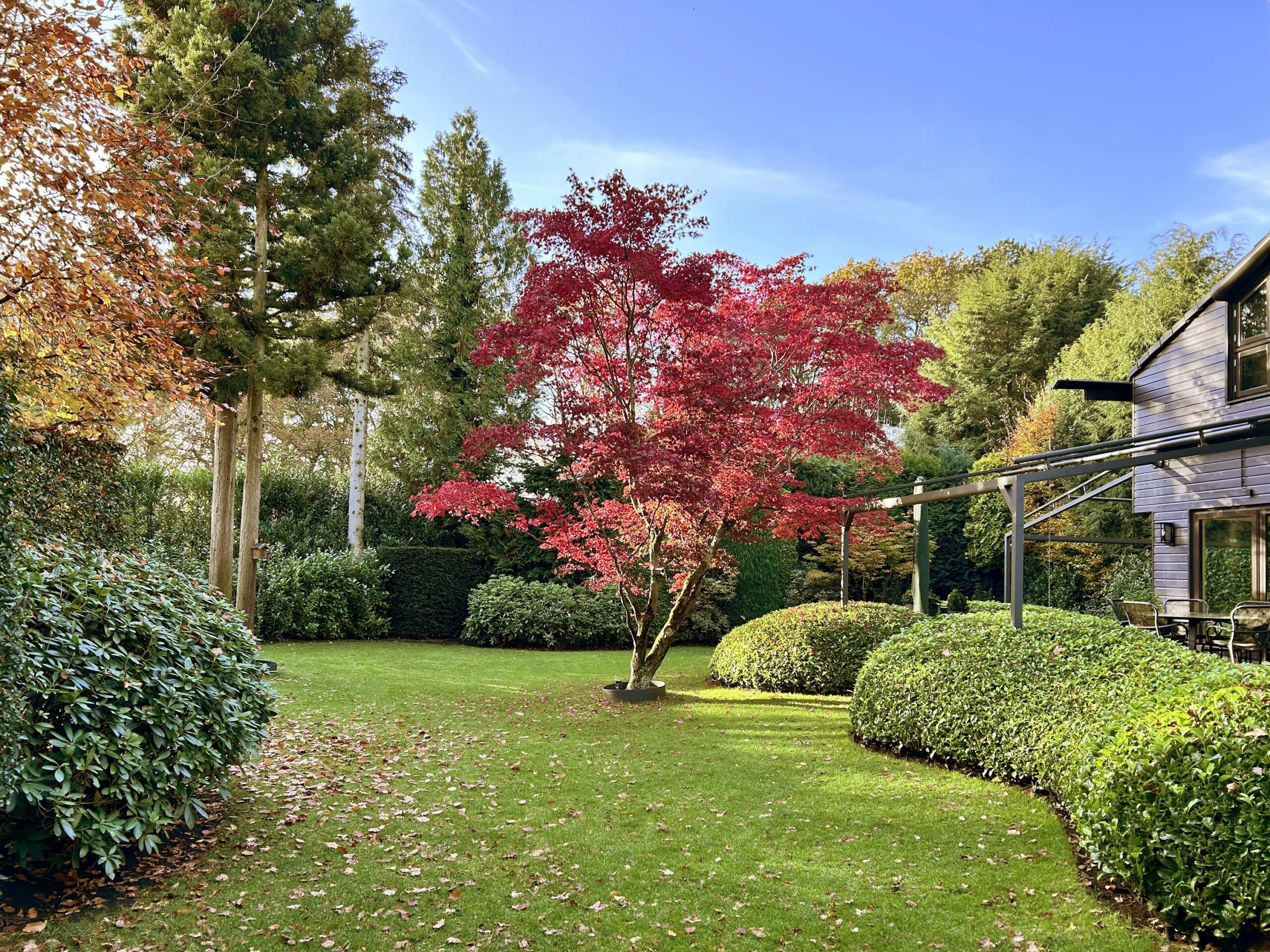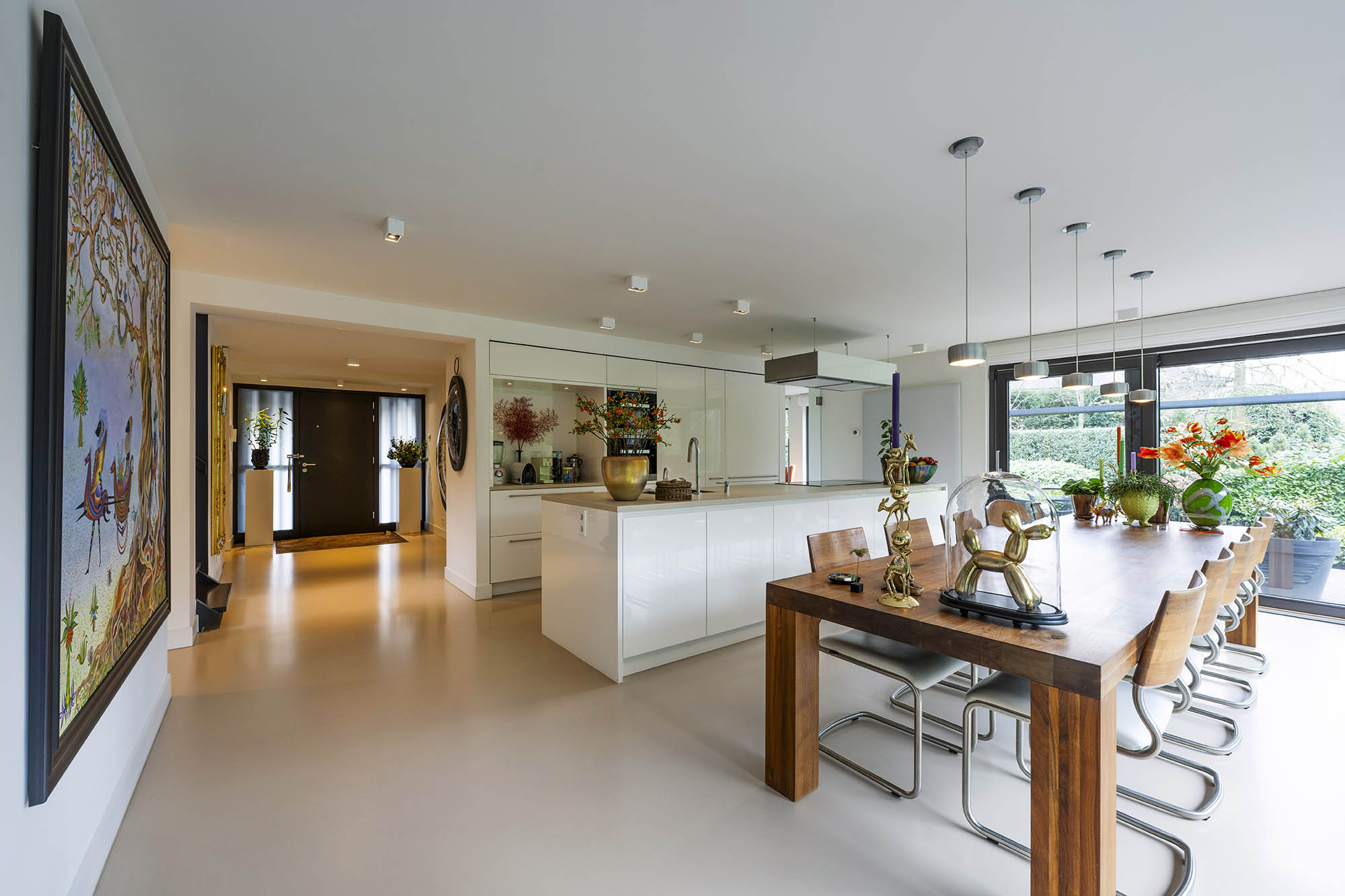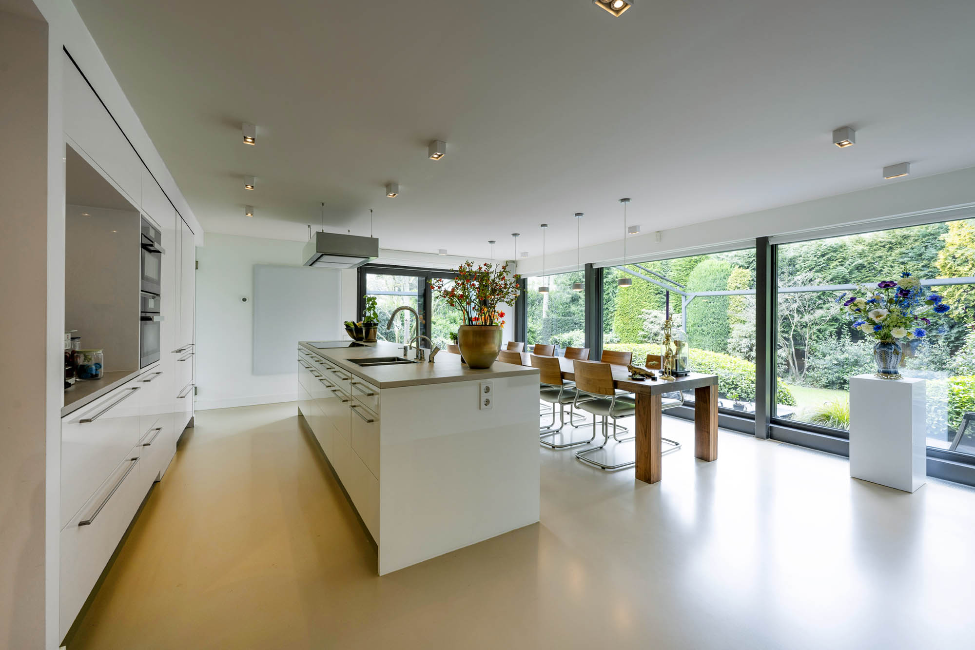 Via de overdekte entree bereikt u de ontvangsthal, die alle ruimtes op de begane grond met elkaar verbindt. Aan de voorzijde van de woning betreedt u door middel van een fraaie schuifdeur de gezellige living met een gashaard en ramen aan 3 zijden met prachtig uitzicht op de door Meker Tuinen aangelegde tuin. Zowel vanuit de centrale hal als vanuit de living betreedt u het hart van de woning: de ideale woonkeuken. Hier gaat u vele gezellige momenten beleven met uw gezin, familie en vriendenkring. De keuken is voorzien van diverse hoogwaardige inbouwapparaten en een ruim 360 cm lang eiland. Tafelen doet u als nooit tevoren. Vanuit de woonkeuken heeft u een panoramisch uitzicht op de fraai aangelegde tuin die zelfs in de winter een groene oase is, zoals te zien is op de foto’s die in februari zijn gemaakt. Er zijn diverse manieren om deze tuin te betreden. Direct aan de keuken grenzen twee terrassen die bij zonnig weer kunnen worden overdekt.