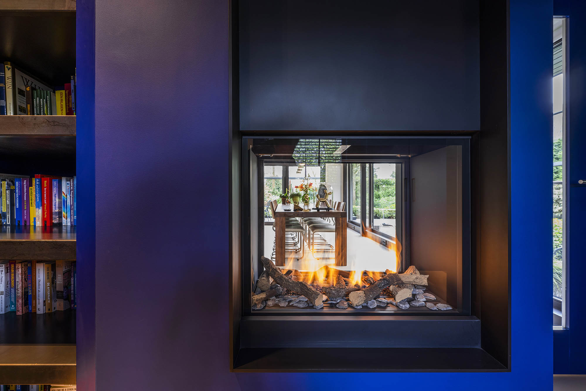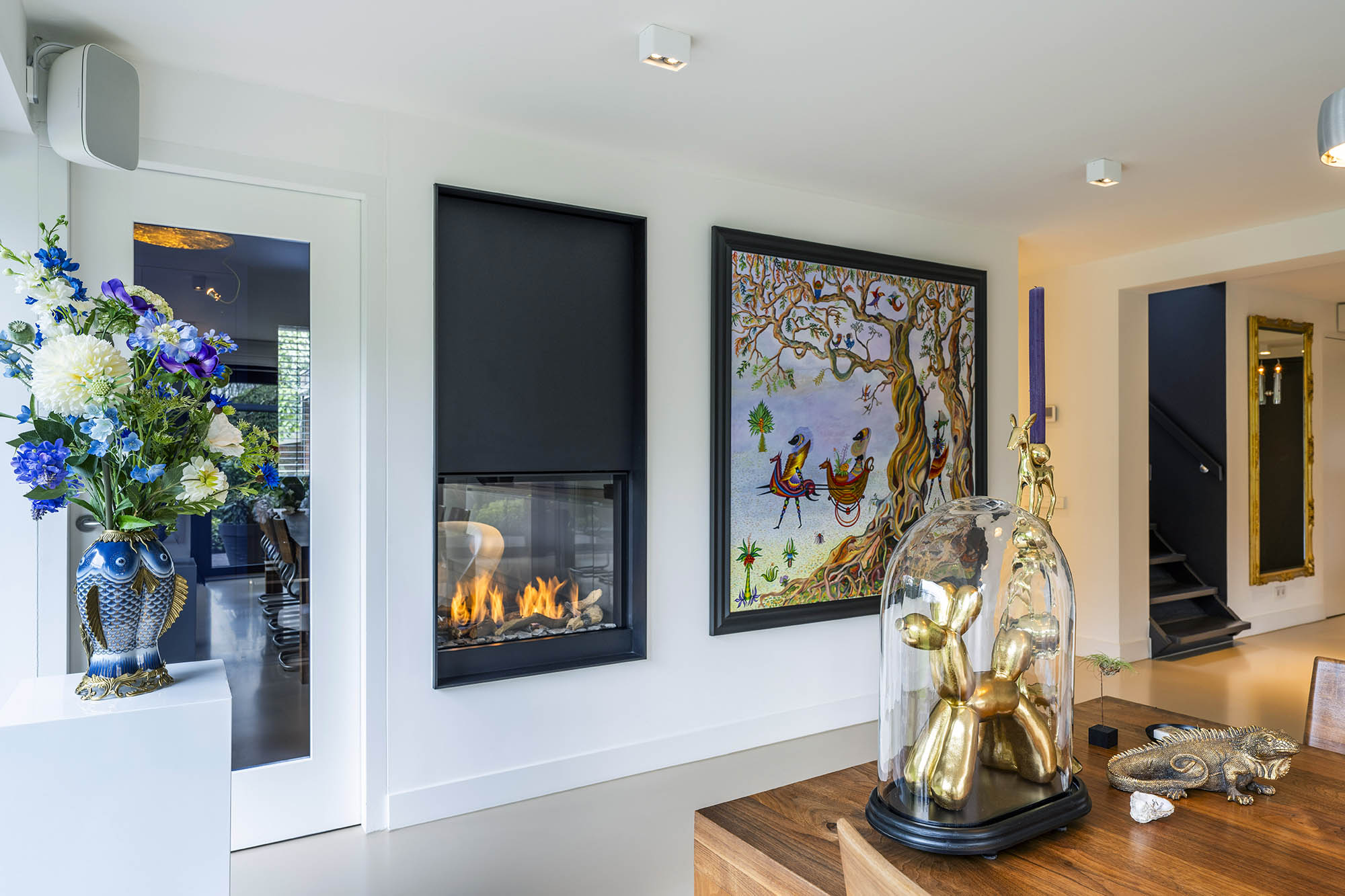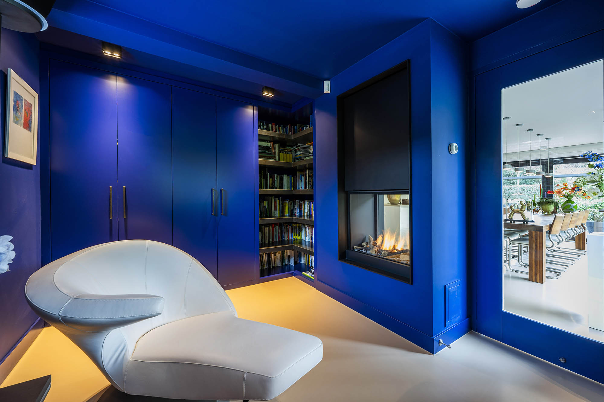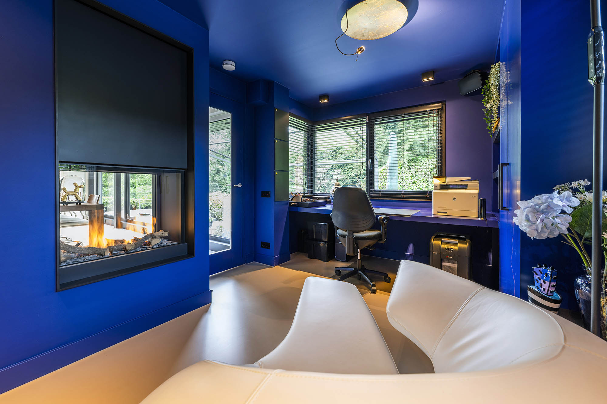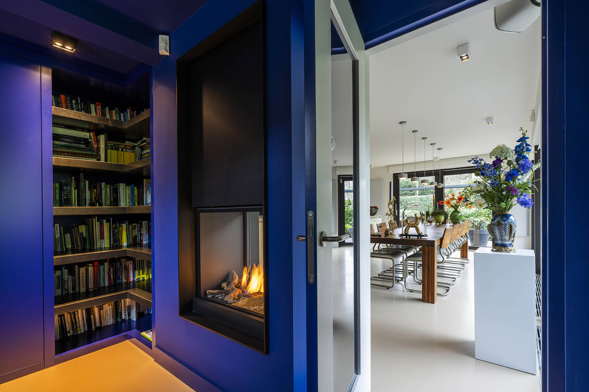 De sfeer in de keuken wordt extra versterkt door de doorkijk gashaard, die deze ruimte verbindt met de ‘blue room’: een gave werk- en leeskamer met maatwerkkasten. Tussen de keuken en het atelier bevindt zich praktische kastruimte en een wijnklimaatkast. Daarnaast zijn er een technische ruimte en een royale wasruimte aanwezig.