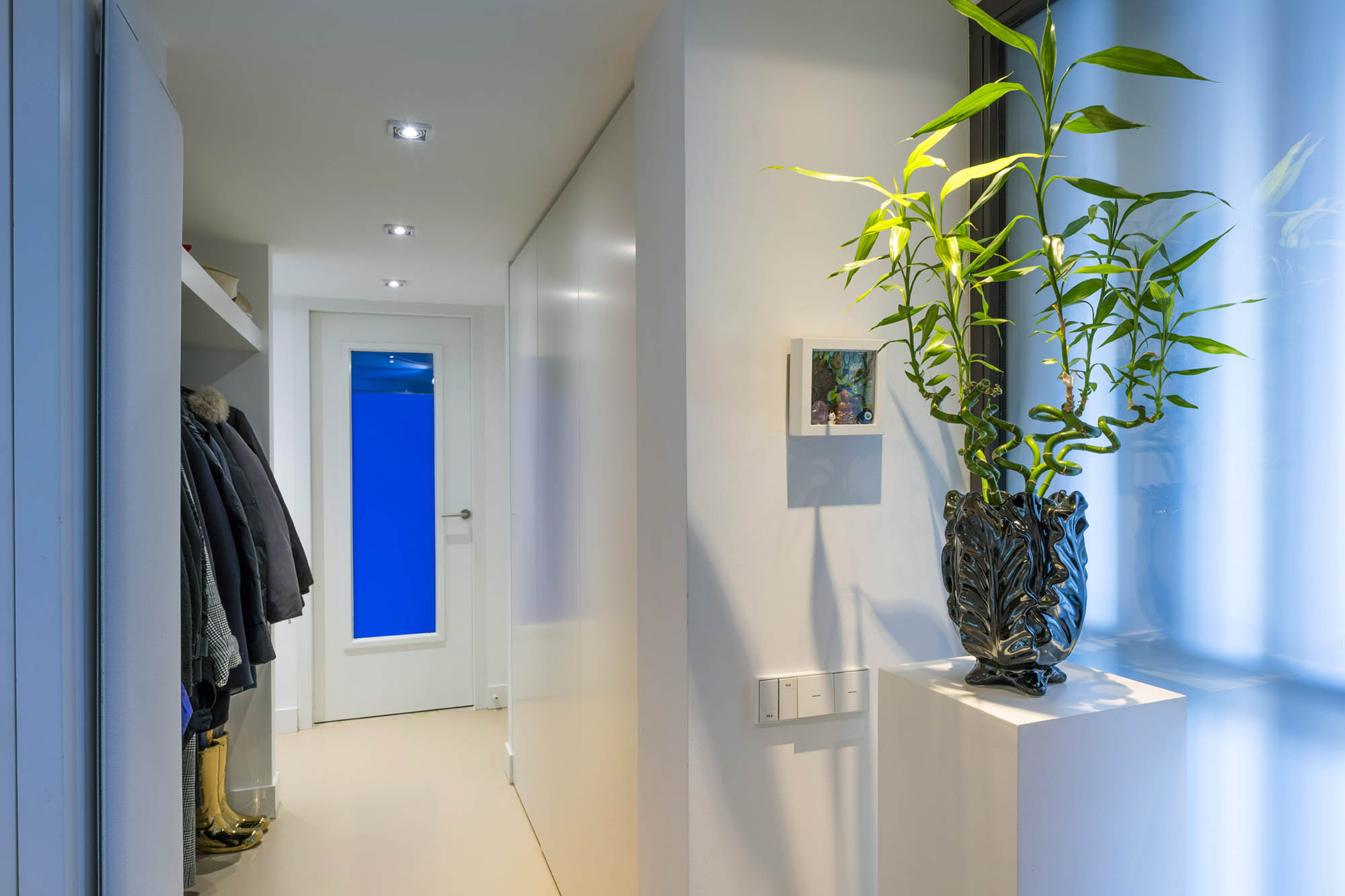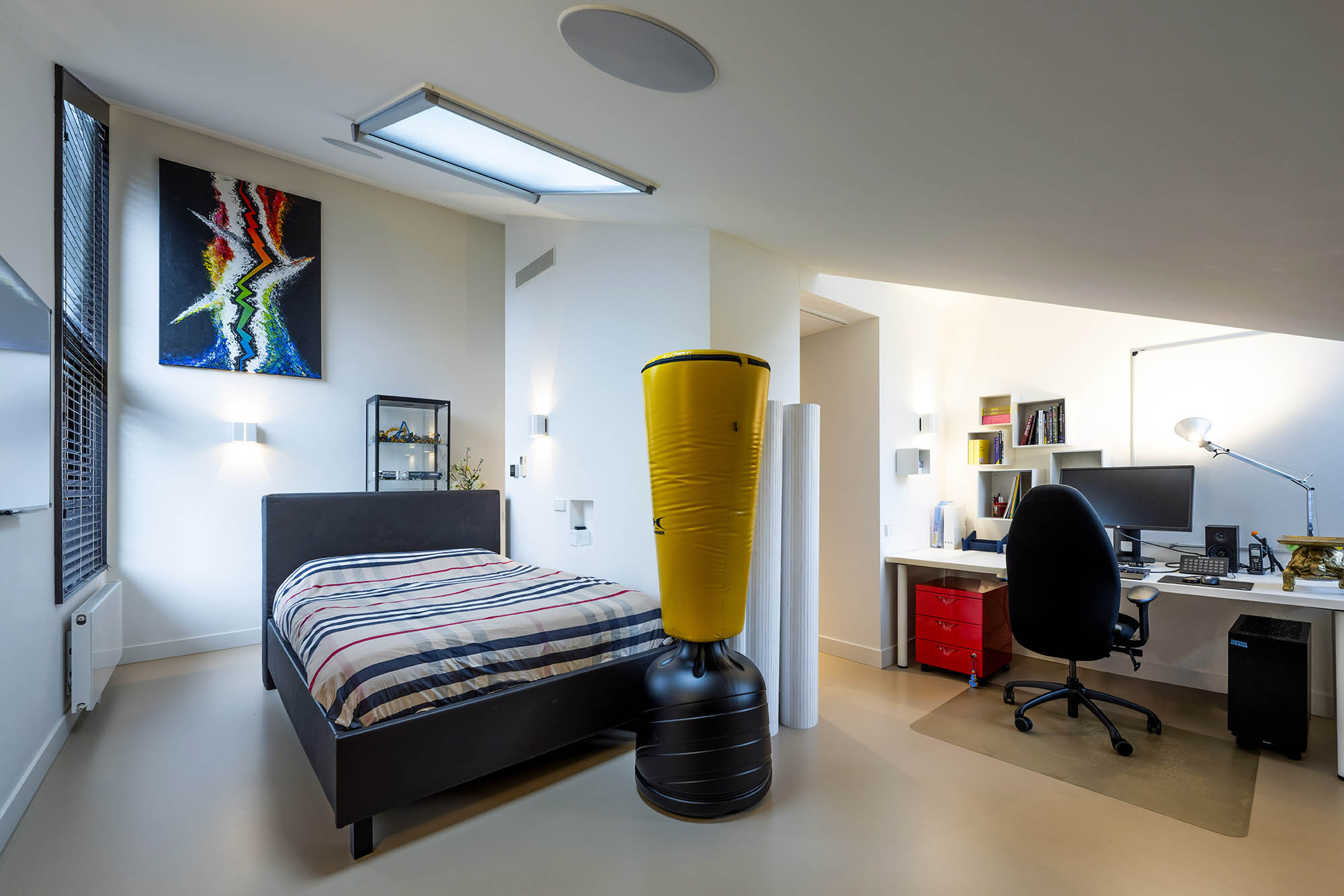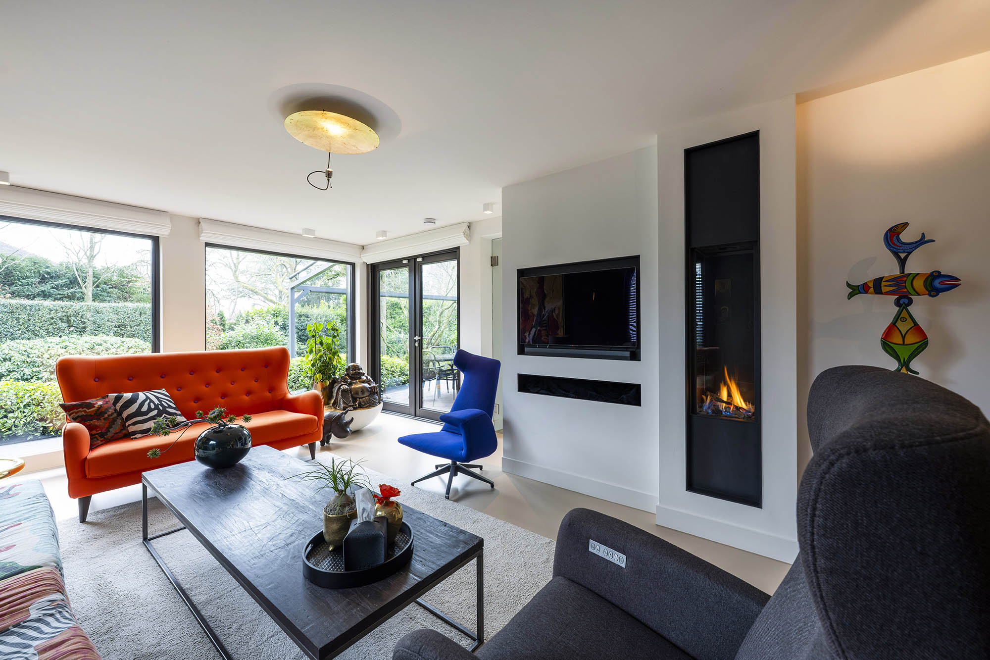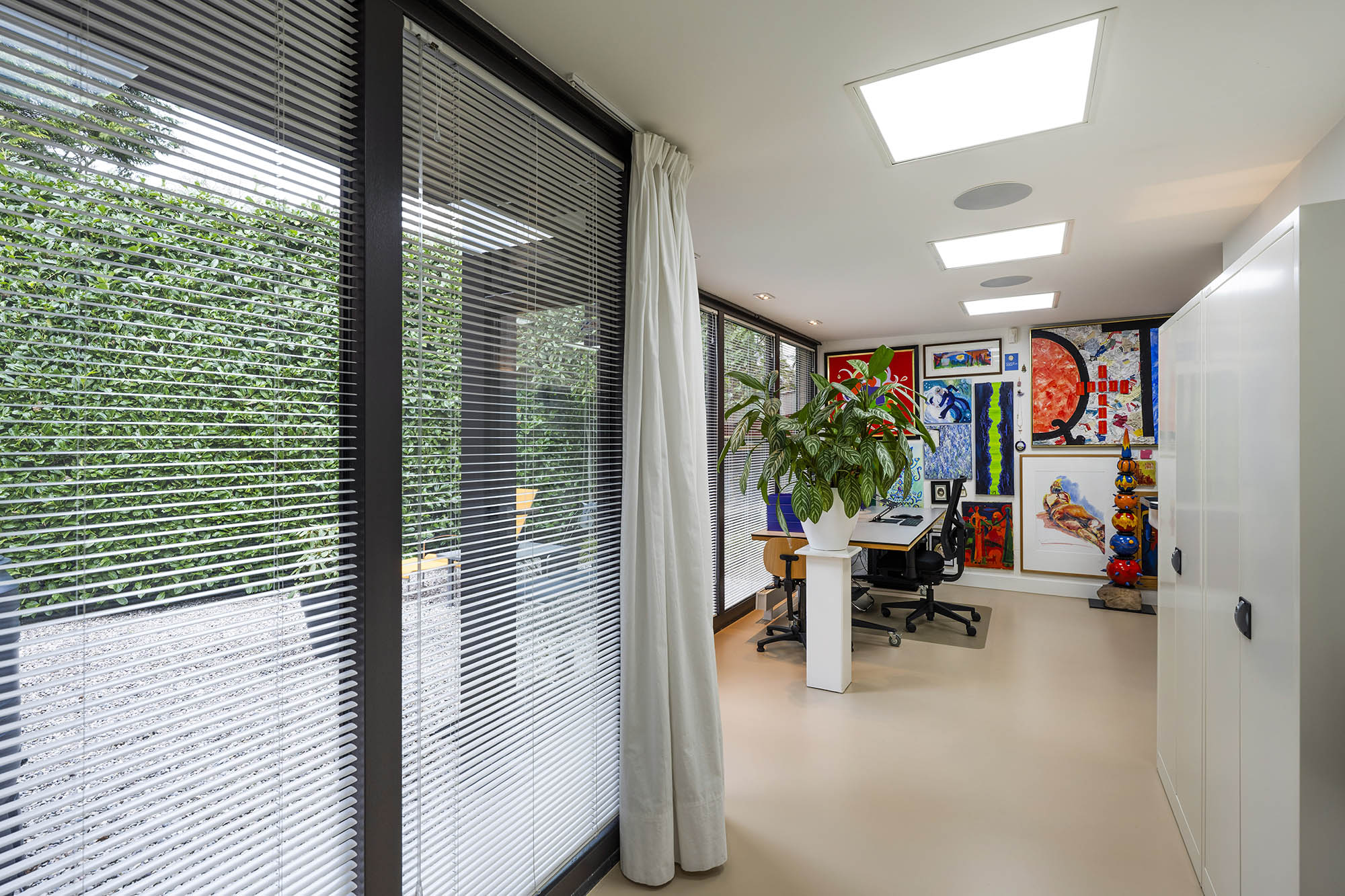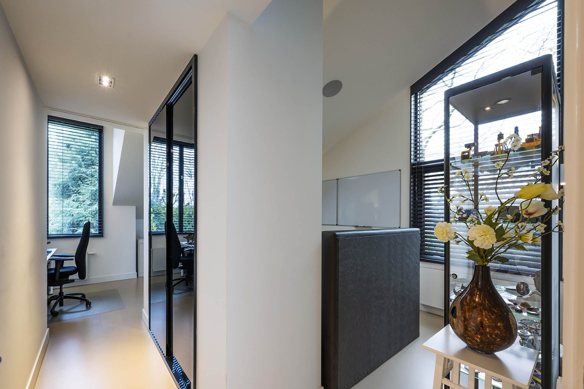 De sfeer in de keuken wordt extra versterkt door de doorkijk gashaard, die deze ruimte verbindt met de ‘blue room’: een gave werk- en leeskamer met maatwerkkasten. Tussen de keuken en het atelier bevindt zich praktische kastruimte en een wijnklimaatkast. Daarnaast zijn er een technische ruimte en een royale wasruimte aanwezig.
