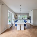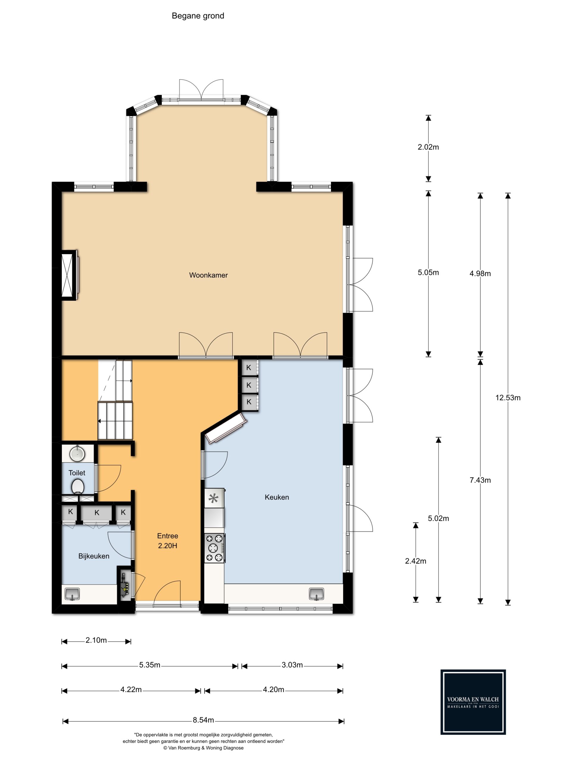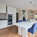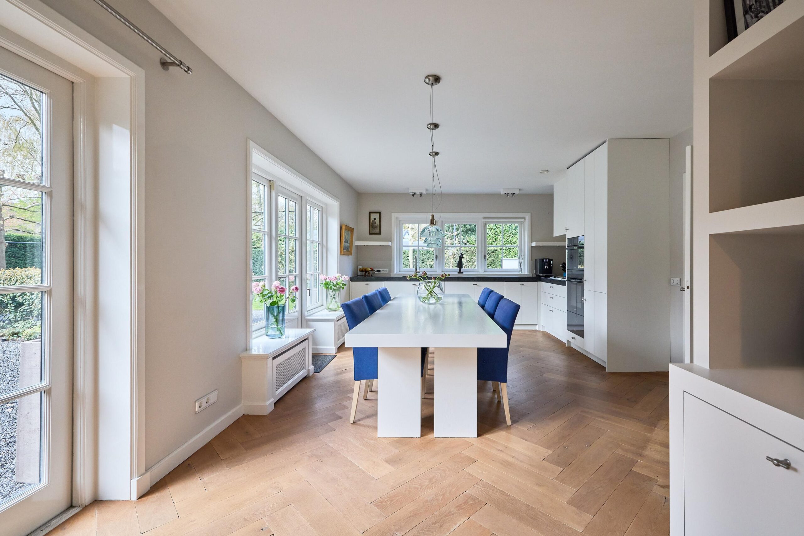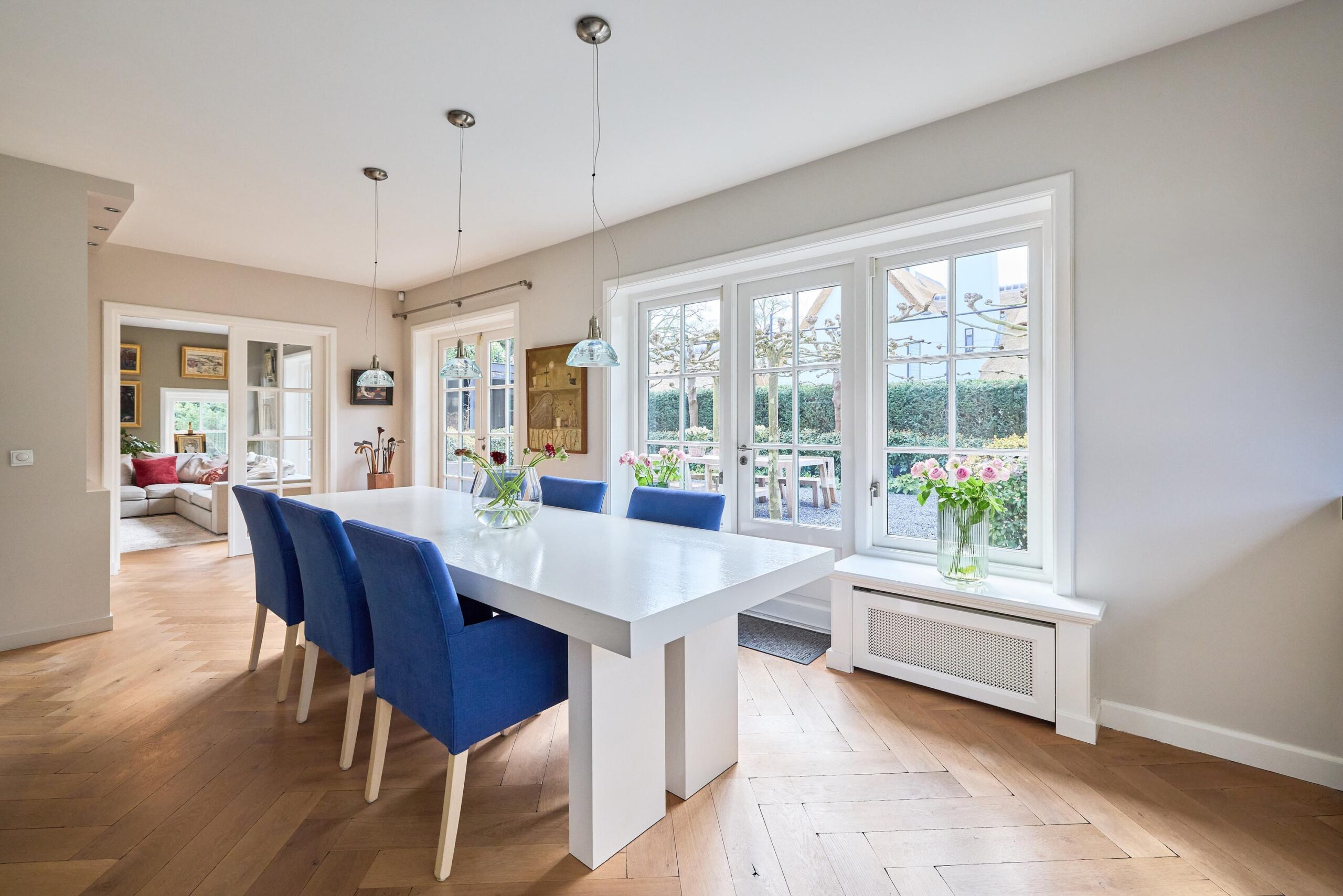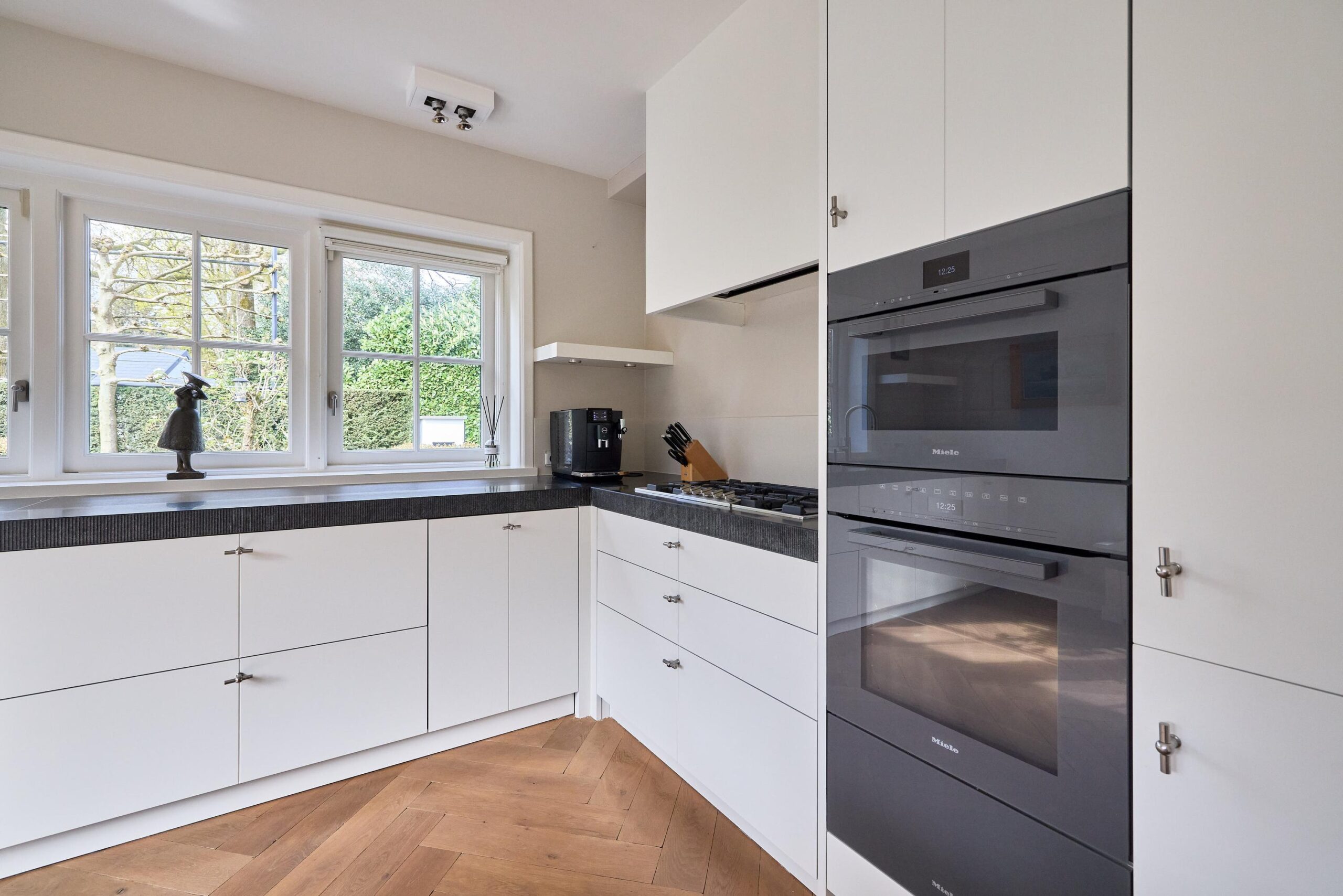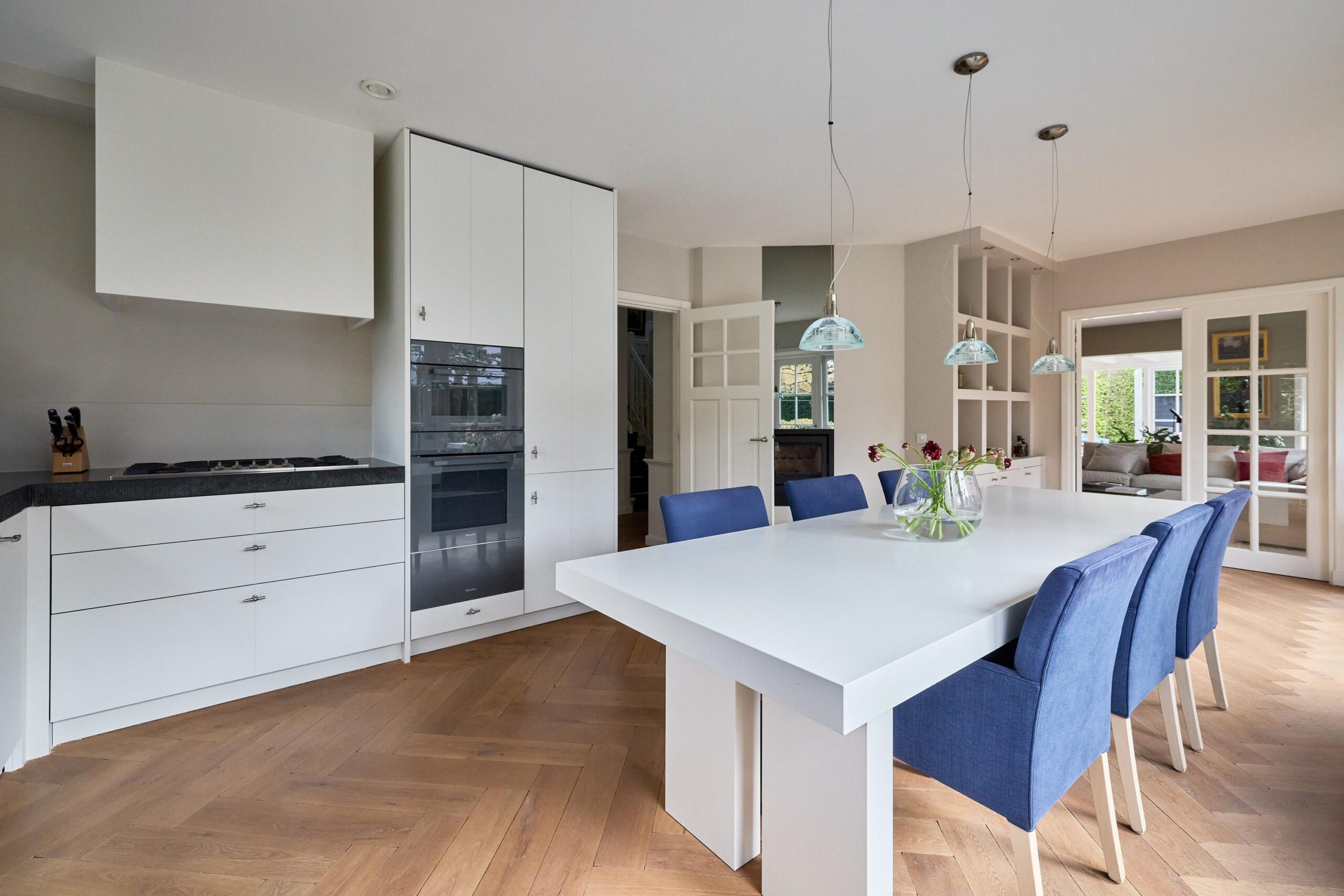 Begane grond: overdekt entree, royale hal met garderobe nis, toilet en toegang tot de woonkamer, keuken en bijkeuken. Bereikbaar middels dubbele deuren de riante woonkamer met erker, openslaande deuren naar de tuin, gashaard met schouw en dubbele deuren naar de luxe woonkeuken (Arjan Lodder keukens) voorzien van diverse inbouwapparatuur, openslaande deuren naar de tuin en een hout gestookte haard. De gehele begane grond is voorzien van een in visgraat gelegde luxe parketvloer. Bijkeuken met vaste kasten en keukenblok met spoelbak.