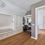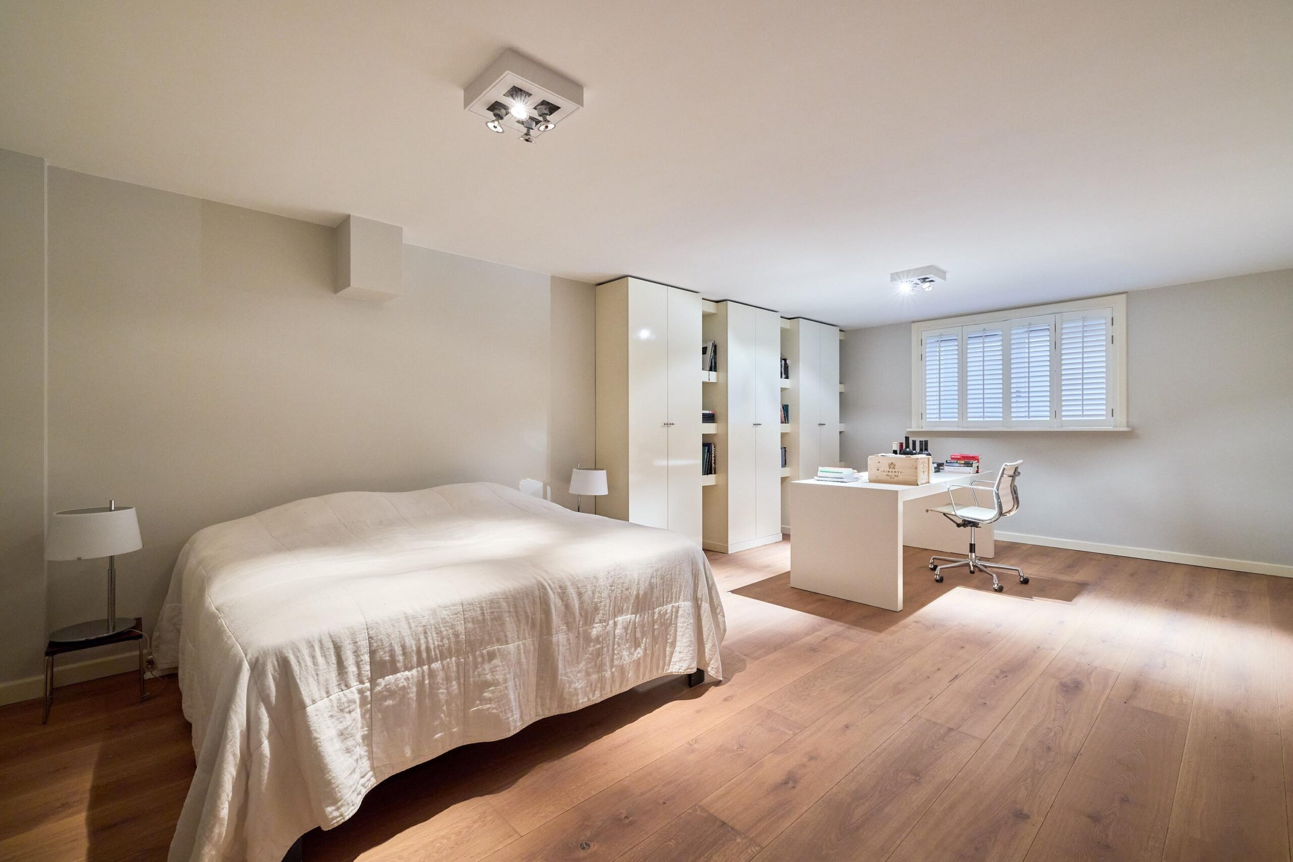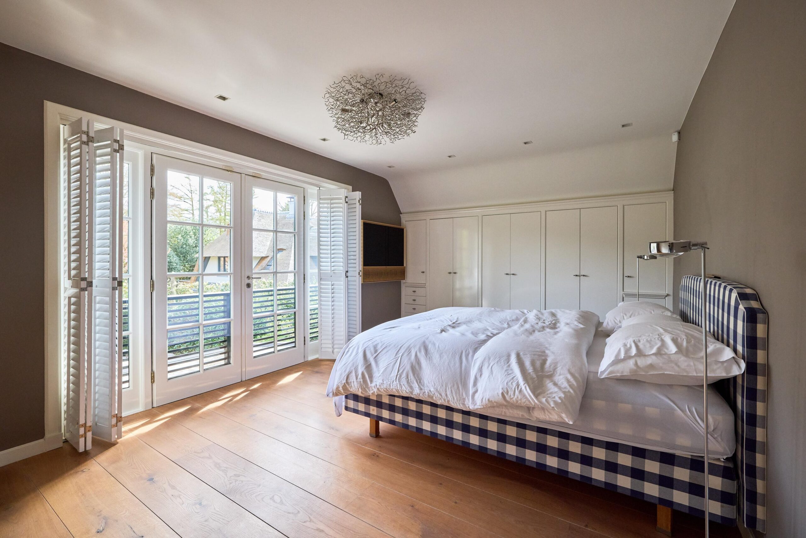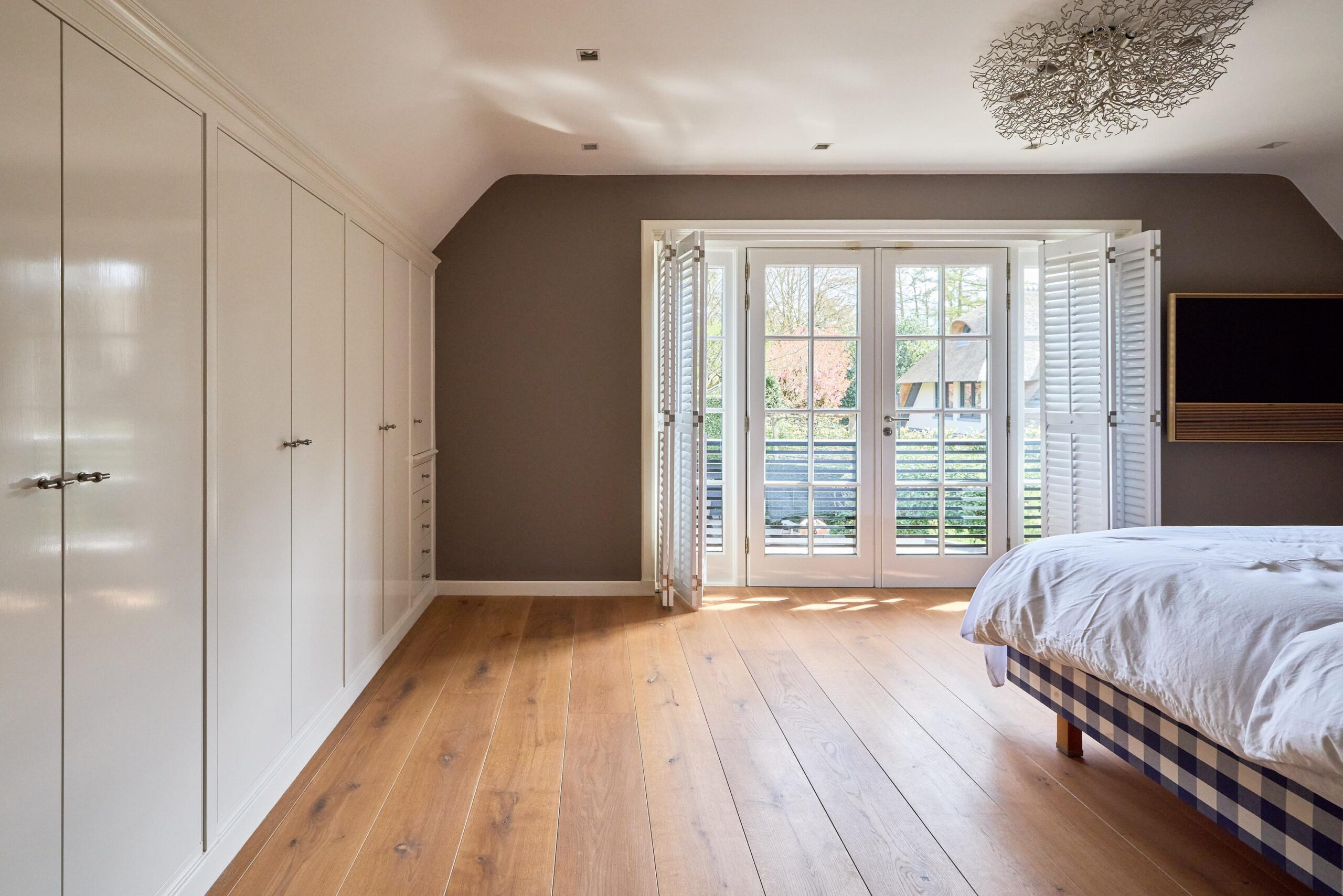 Eerste verdieping: zeer lichte overloop met vide, master-bedroom aan de achterzijde voorzien van airco, openslaande deuren naar Frans balkon, aan weerszijde van de…