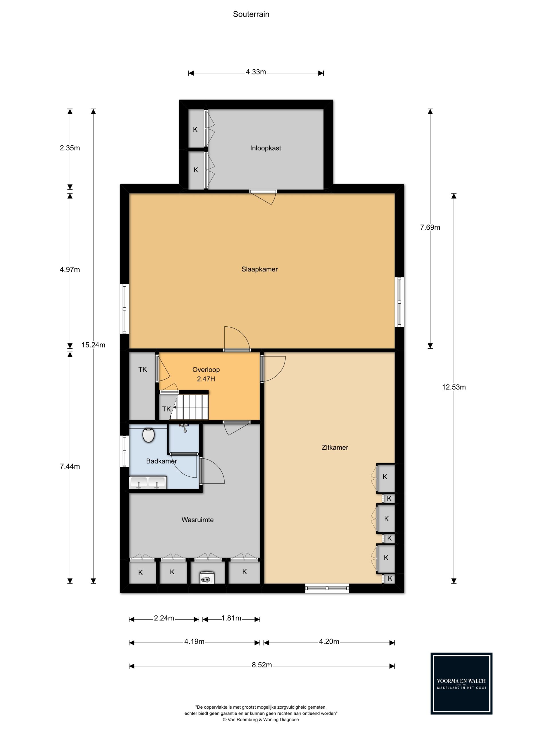 Souterrain: overloop, ruime (slaap) kamer met inloopkast, tweede multifunctionele kamer, badkamer voorzien van inloopdouche, dubbele vaste wastafel. Ruime waskamer met vaste kasten. De kamers en badkamer krijgen voldoende daglicht doormiddel van een koekoek.
