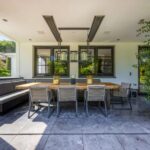 De living en eetkamer lopen naadloos in elkaar over, rondom twee separate haarden in hoogte verschillend. Openslaande deuren brengen u naar de overdekte veranda met vaste zithoek en terrasverwarming: vier seizoenen buitengenot. De royale maatwerkkeuken met groot kookeiland en hoogwaardige inbouwapparatuur vormt het kloppend hart. Naastliggend bevinden zich een praktische bijkeuken/second kitchen en een rustige werkkamer. De vloeren in de hal en de keuken zijn uitgevoerd in lichte natuursteen, de rest van de vloeren zijn uitgevoerd in een visgraat pakket.
