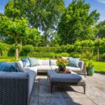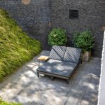 De zuid-tuin is ontworpen voor privacy: lommerrijke borders, meerdere terrassen (ook beschut bij de patio) en een diepe oprit achter de poort. Aan de villa grenst een overdekte veranda; aan de zij- en achterzijde vindt u zonnige plekken gedurende de hele dag.