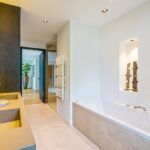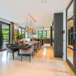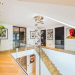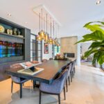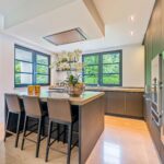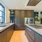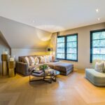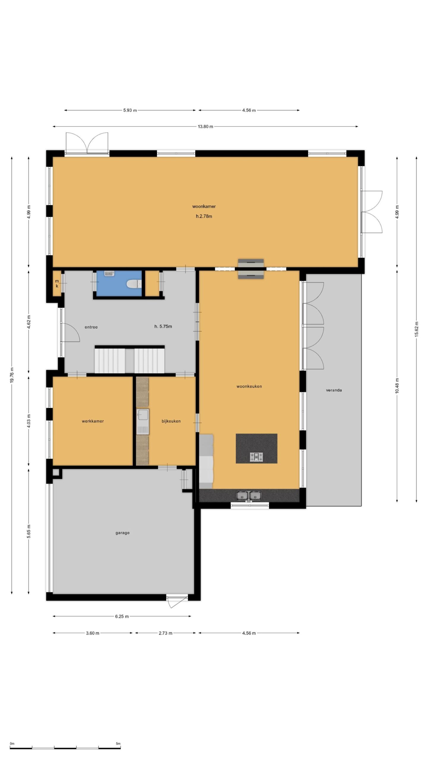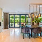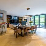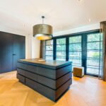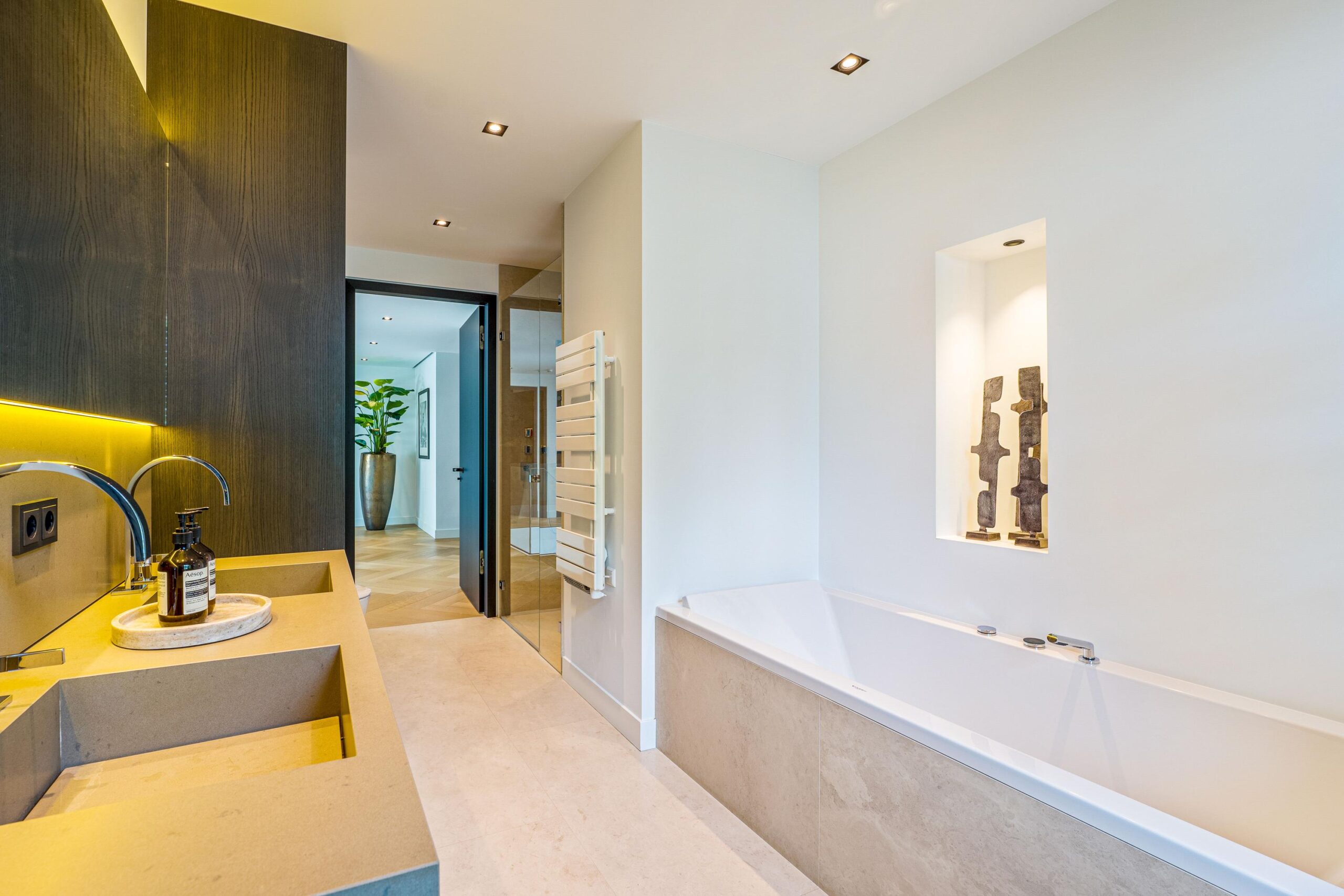 De living en eetkamer lopen naadloos in elkaar over, rondom twee separate haarden in hoogte verschillend. Openslaande deuren brengen u naar de overdekte veranda met vaste zithoek en terrasverwarming: vier seizoenen buitengenot. De royale maatwerkkeuken met groot kookeiland en hoogwaardige inbouwapparatuur vormt het kloppend hart. Naastliggend bevinden zich een praktische bijkeuken/second kitchen en een rustige werkkamer. De vloeren in de hal en de keuken zijn uitgevoerd in lichte natuursteen, de rest van de vloeren zijn uitgevoerd in een visgraat pakket.