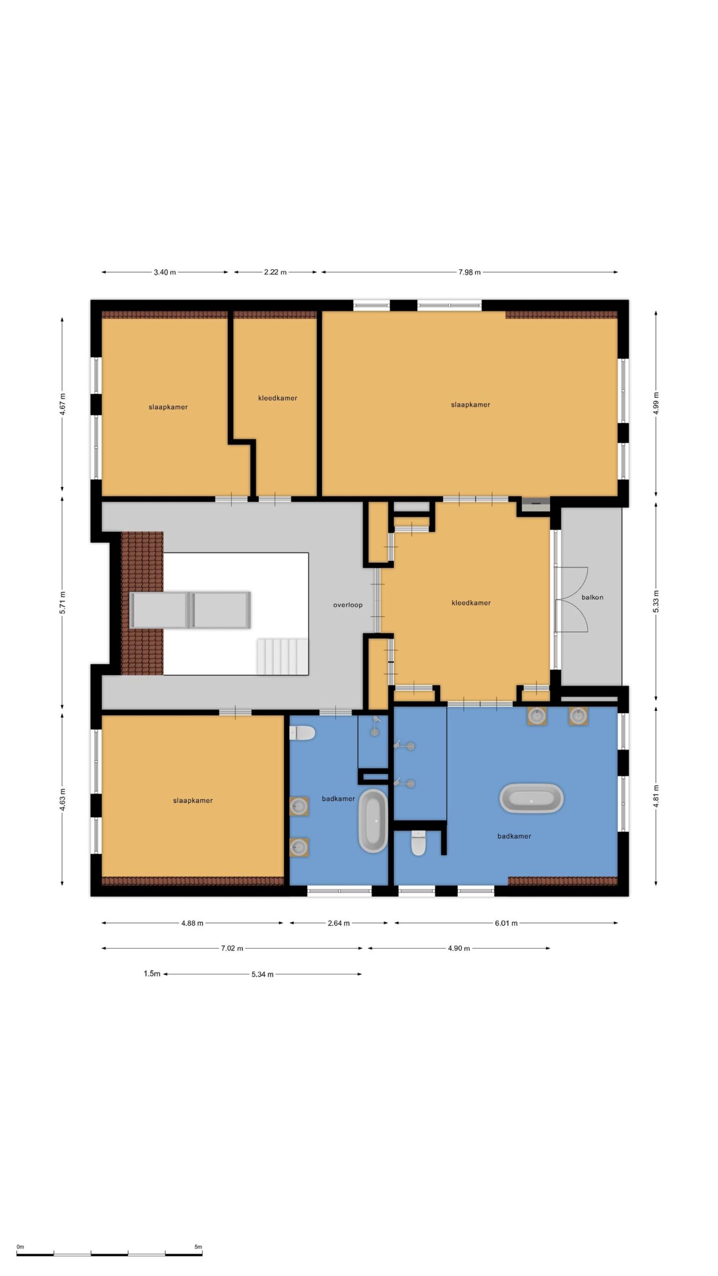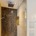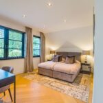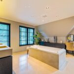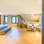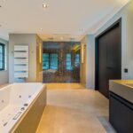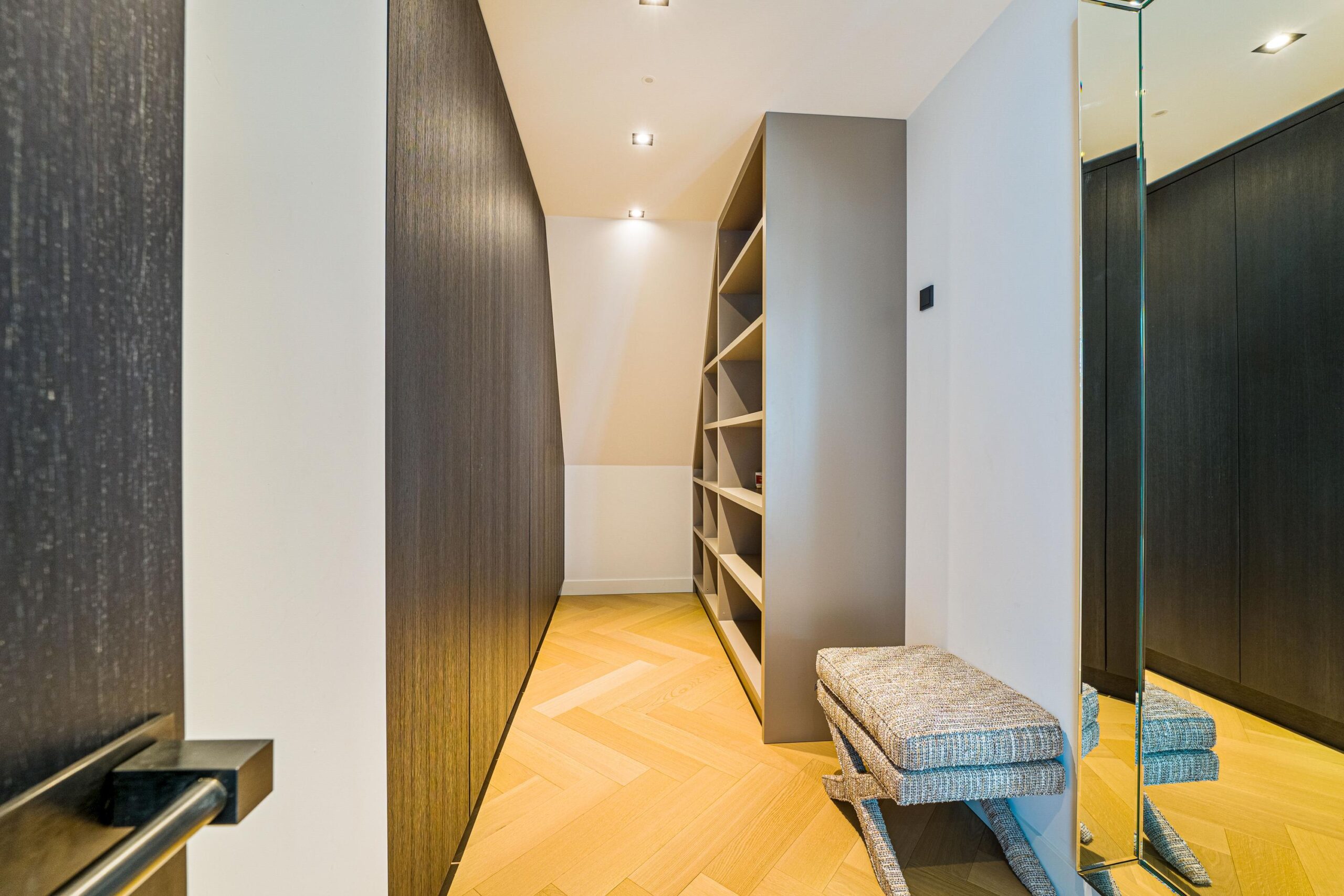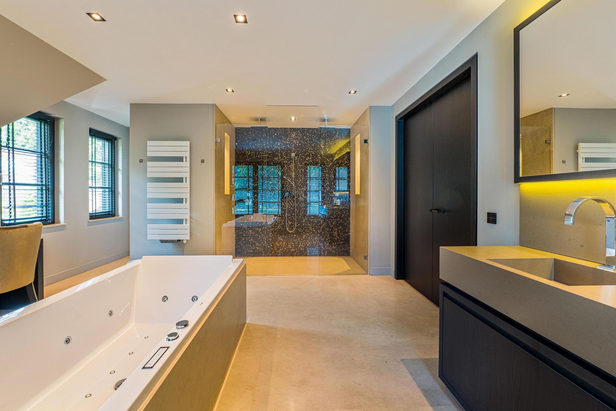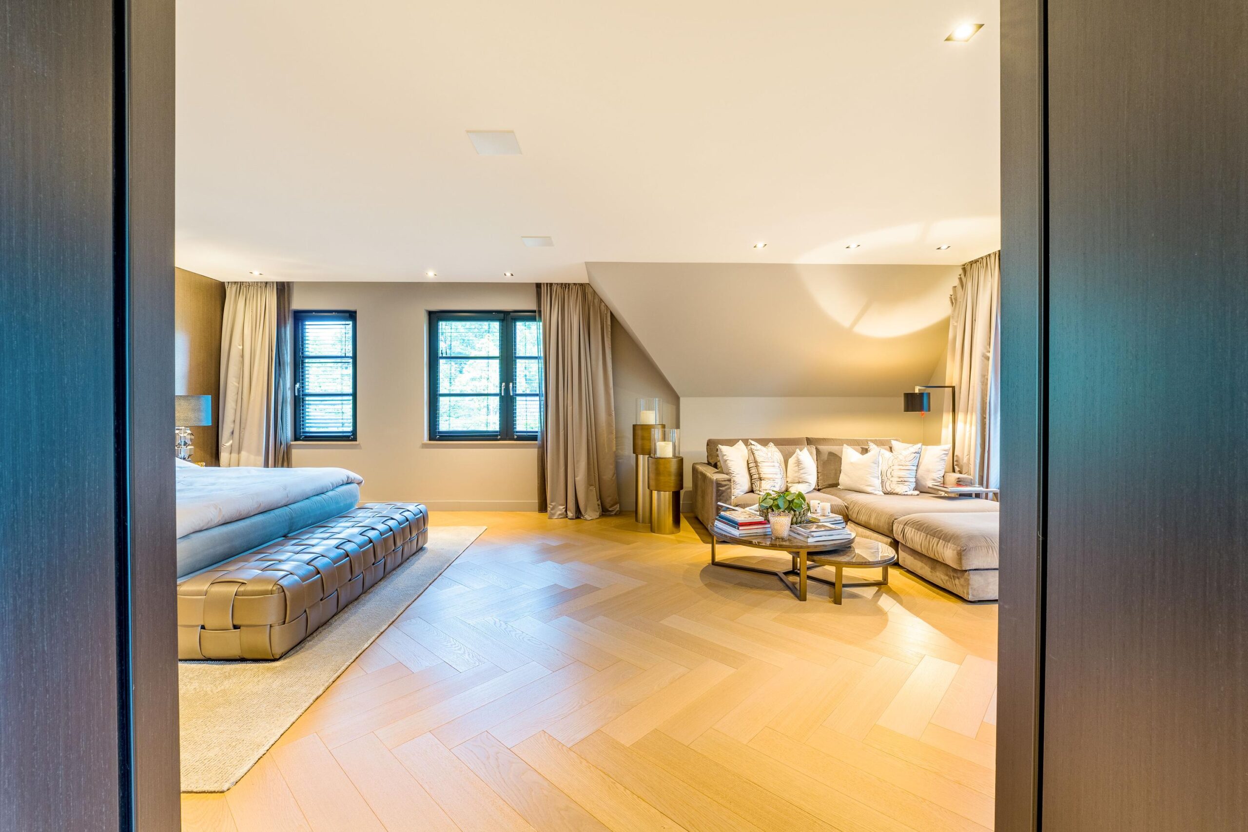 De eerste verdieping biedt drie royale slaapkamers en twee luxe badkamers in natuursteen. De master suite heeft een eigen zitgedeelte met open haard, een mooie walk-in-closet met balkon en een wellness badkamer met ligbad, inloopdouche en dubbele wastafel. Uiteraard zijn er op deze verdieping nog twee royale slaapkamers én een extra dressing én een extra tweede badkamer (met alle voorzieningen) aanwezig. Bovenliggend is er een ruime bergvliering.