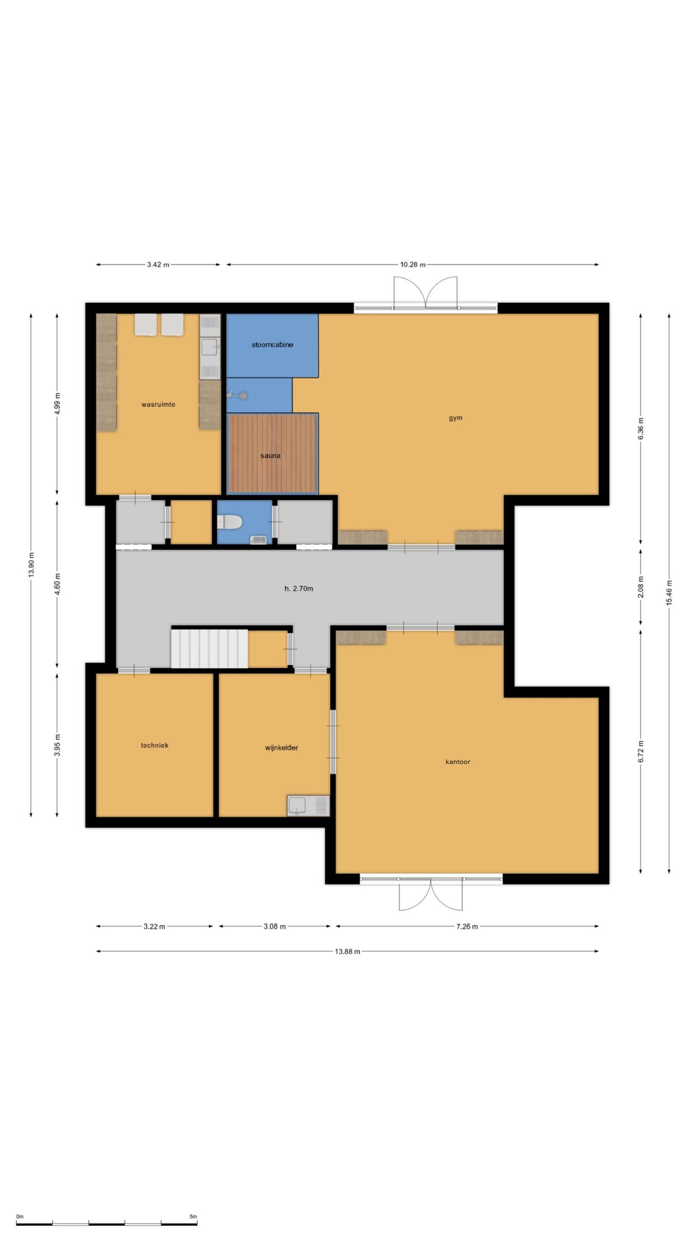 Het souterrain (sta-hoogte ca. 2,70 m) is een volwaardige woonlaag met daglichttoetreding via het terras. Hier vindt u: