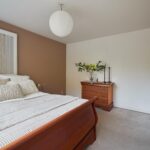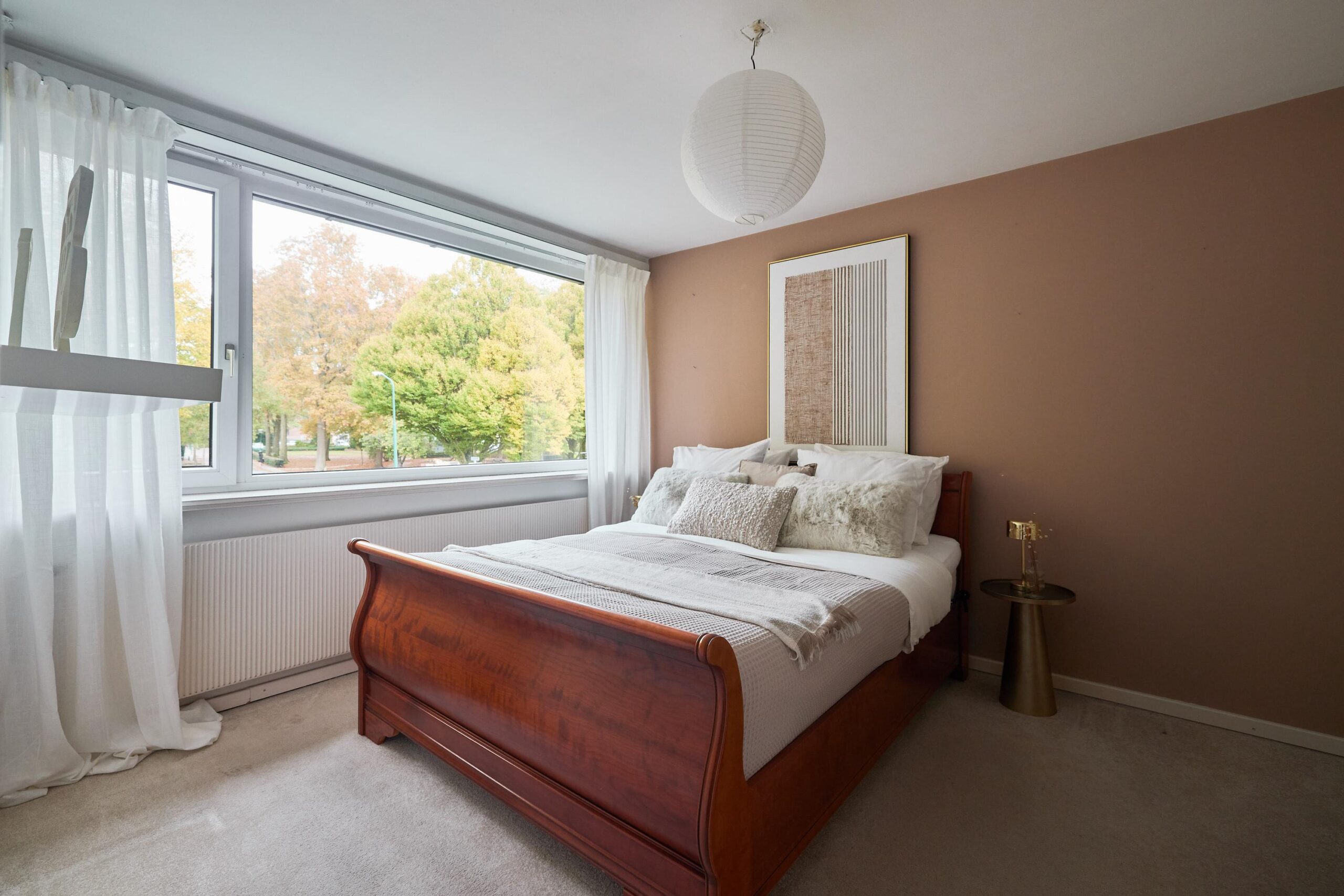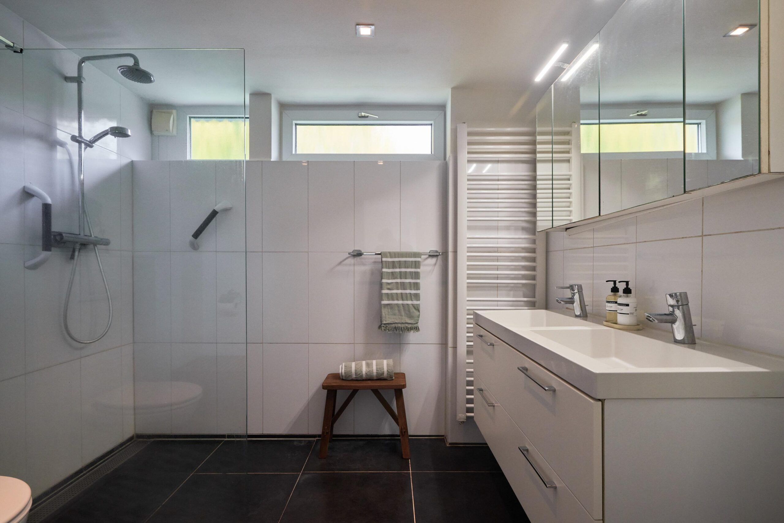 De overloop geeft toegang tot drie in grootte variërende slaapkamers en een moderne, strak afgewerkte badkamer voorzien van dubbele wastafel, ruime inloopdouche, tweede toilet en handdoekenradiator. Een diepe bergkast biedt ruimte voor wasmachine en droger.