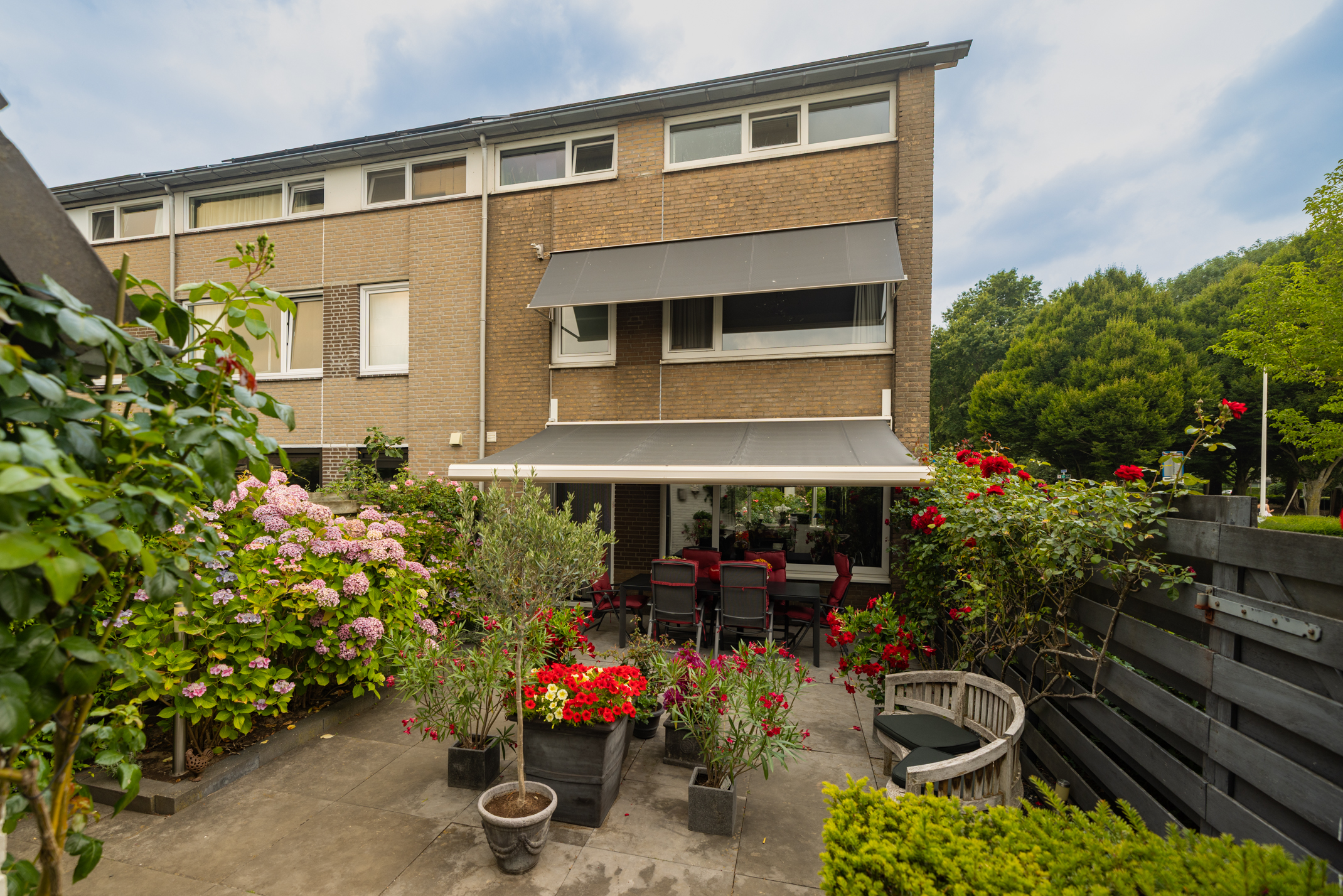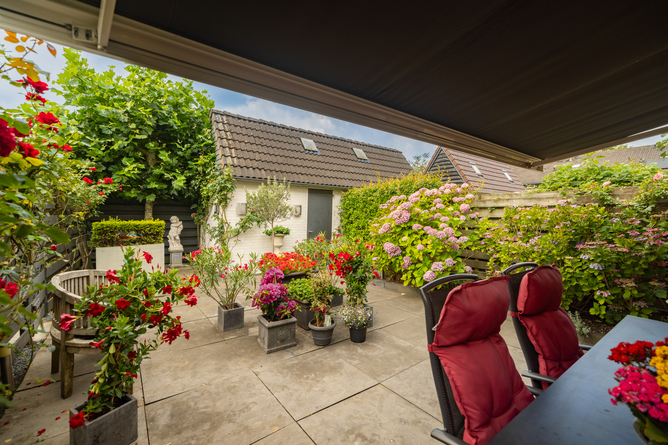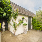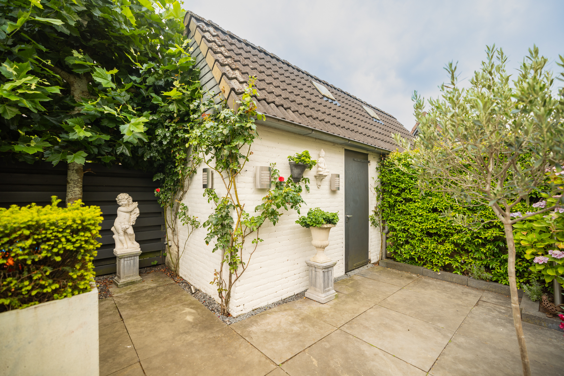De zonnige achtertuin op het zuiden is keurig aangelegd en biedt veel privacy, perfect voor ontspannen zomerdagen. De vrijstaande stenen berging beschikt over een handige vliering, ideaal voor extra opslag.