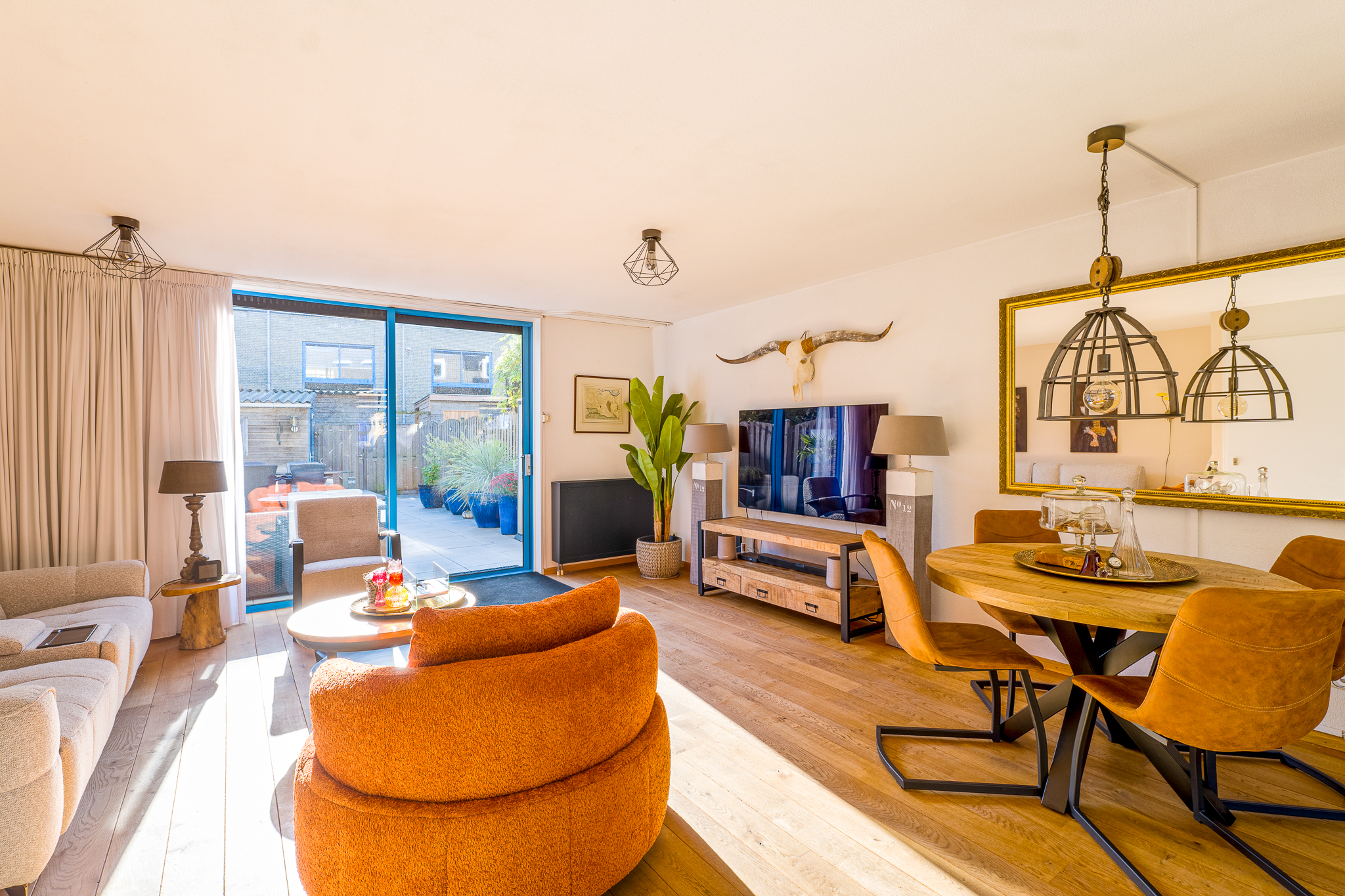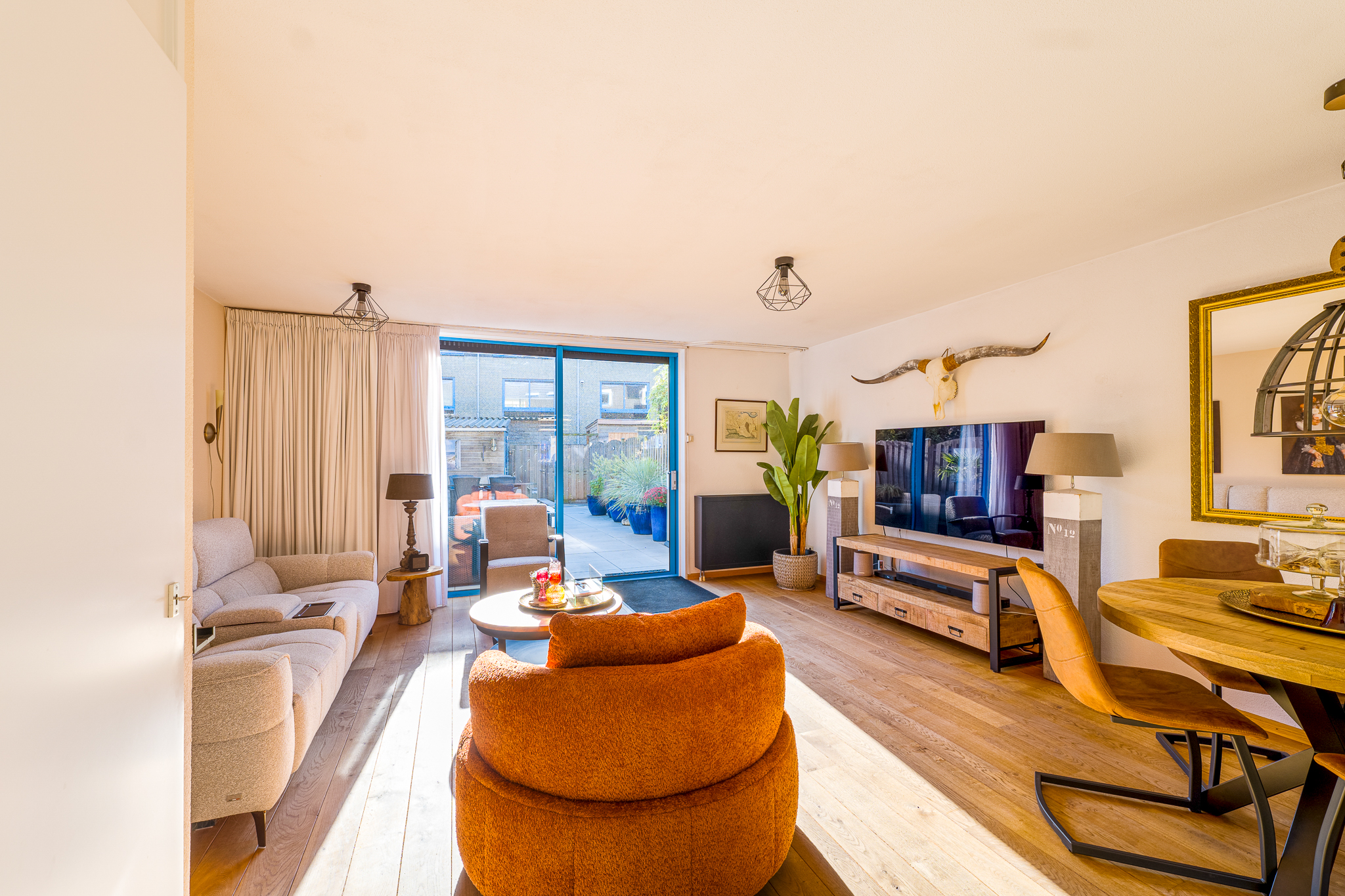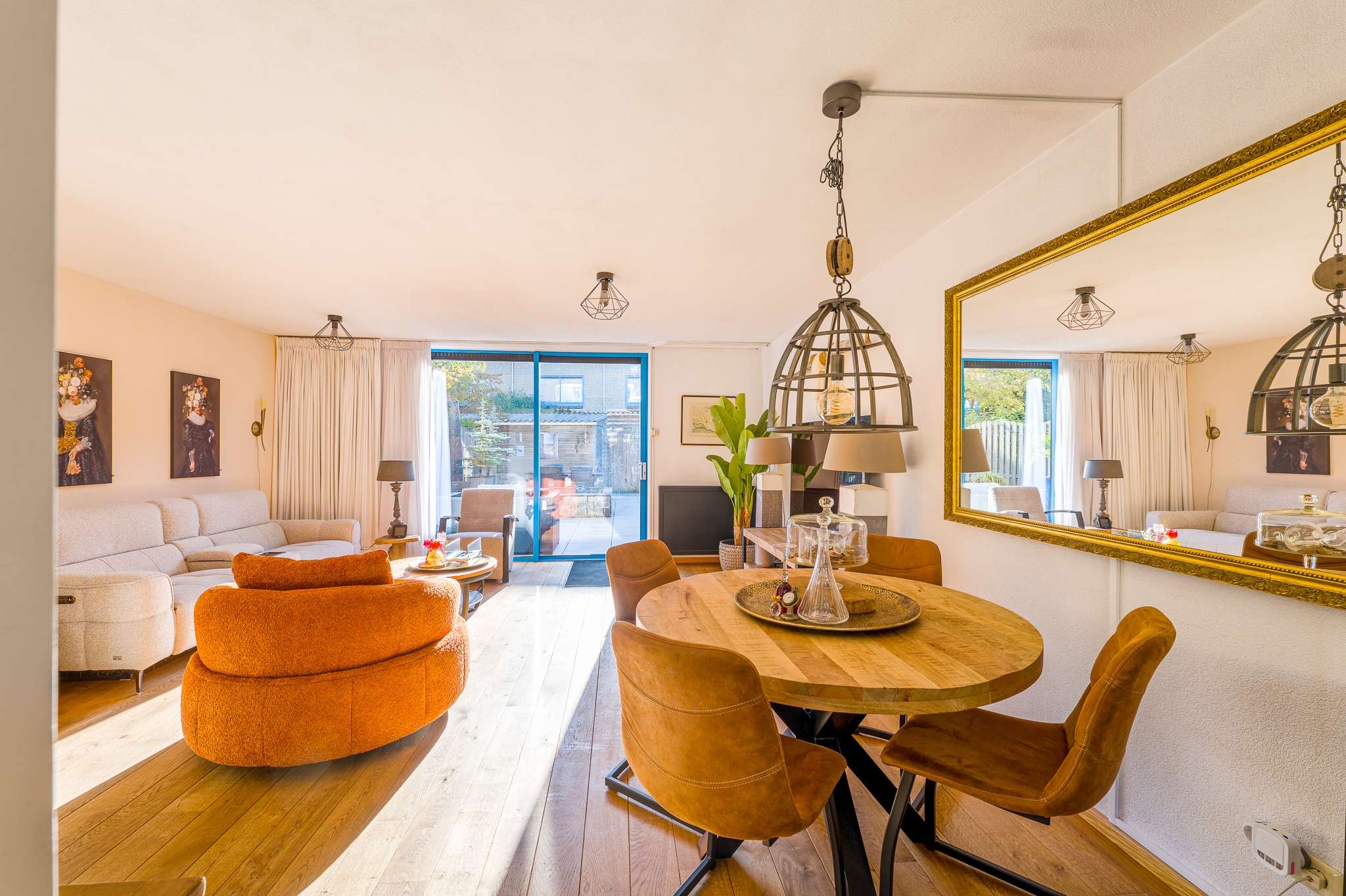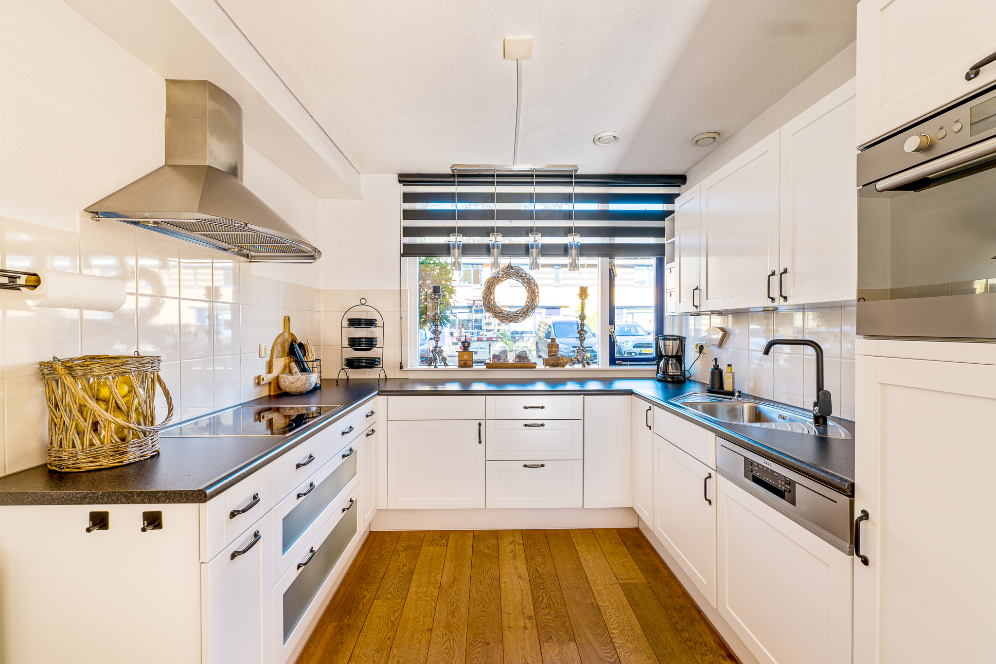 Entree, hal, modern toilet met fonteintje, meterkast, lichte woon-eetkamer met houten vloer, vanuit de woonkamer middels schuifpui toegang tot de zonnige achtertuin, moderne open keuken voorzien van diverse inbouwapparatuur.