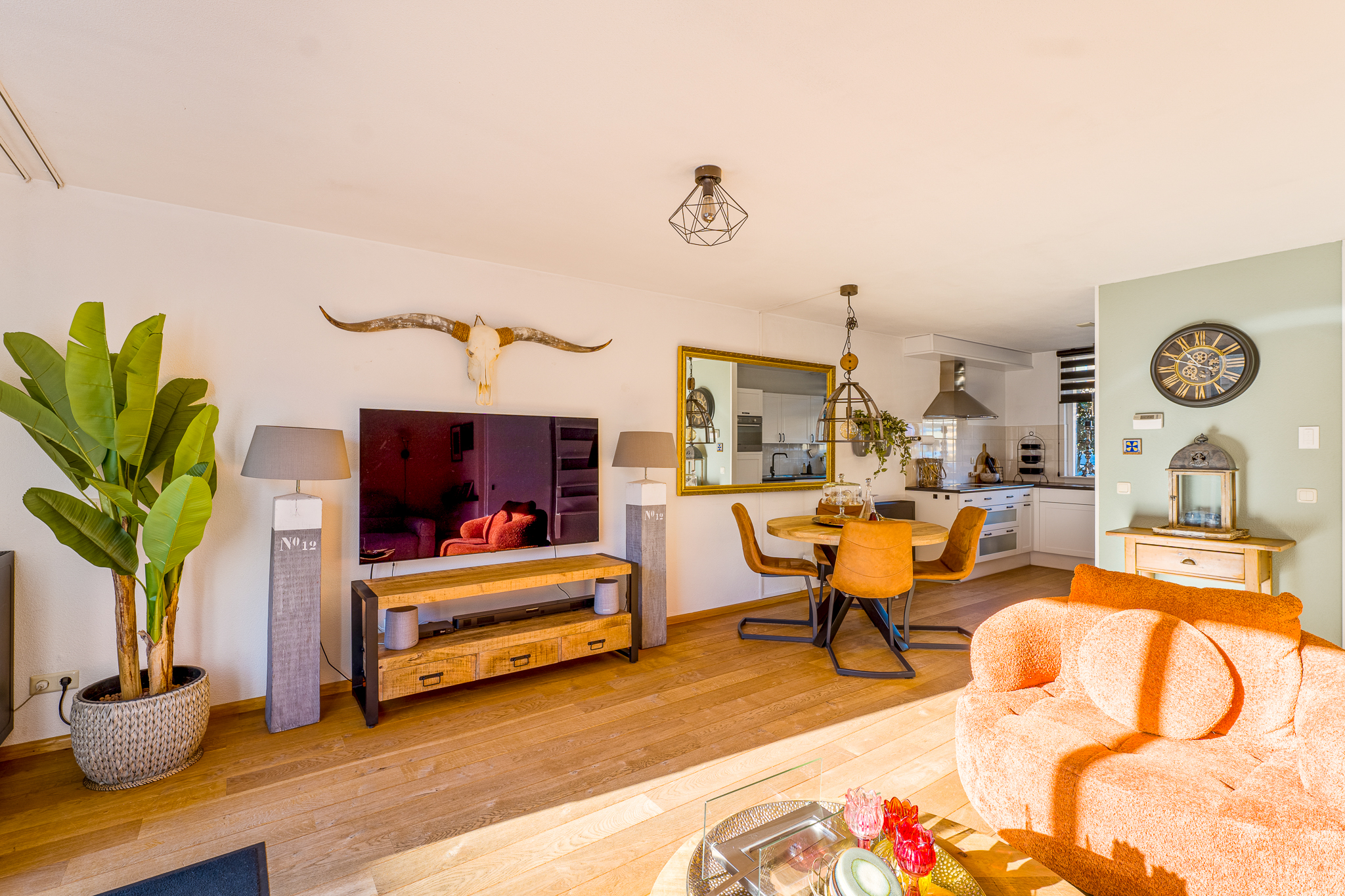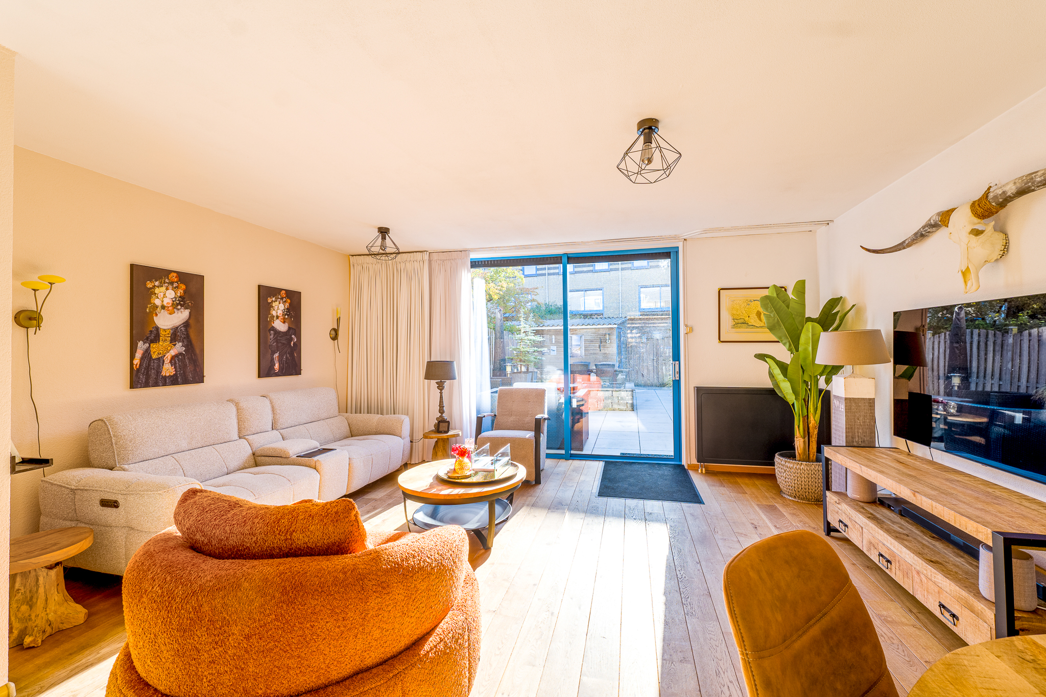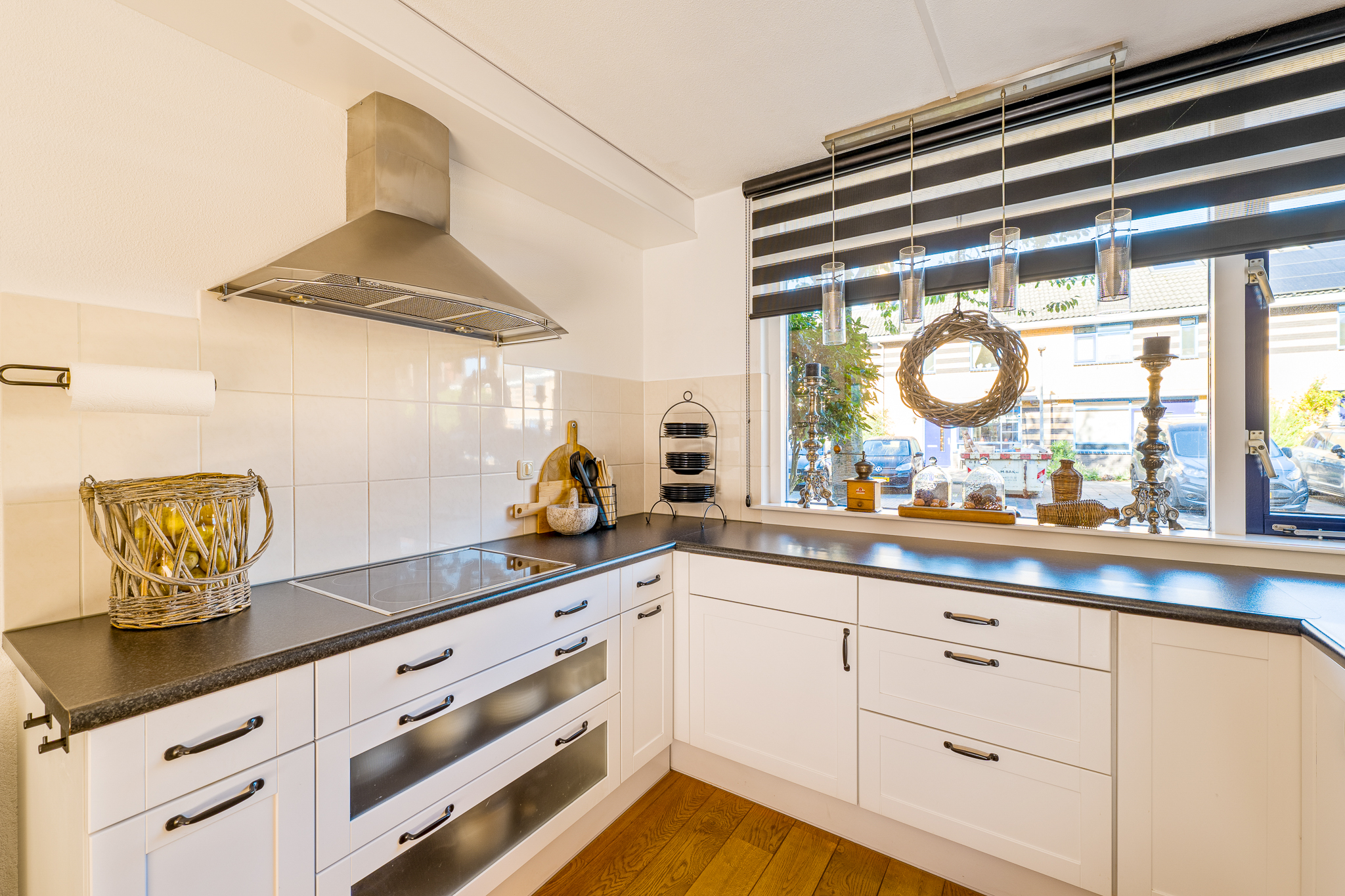 Entree, hal, modern toilet met fonteintje, meterkast, lichte woon-eetkamer met houten vloer, vanuit de woonkamer middels schuifpui toegang tot de zonnige achtertuin, moderne open keuken voorzien van diverse inbouwapparatuur.