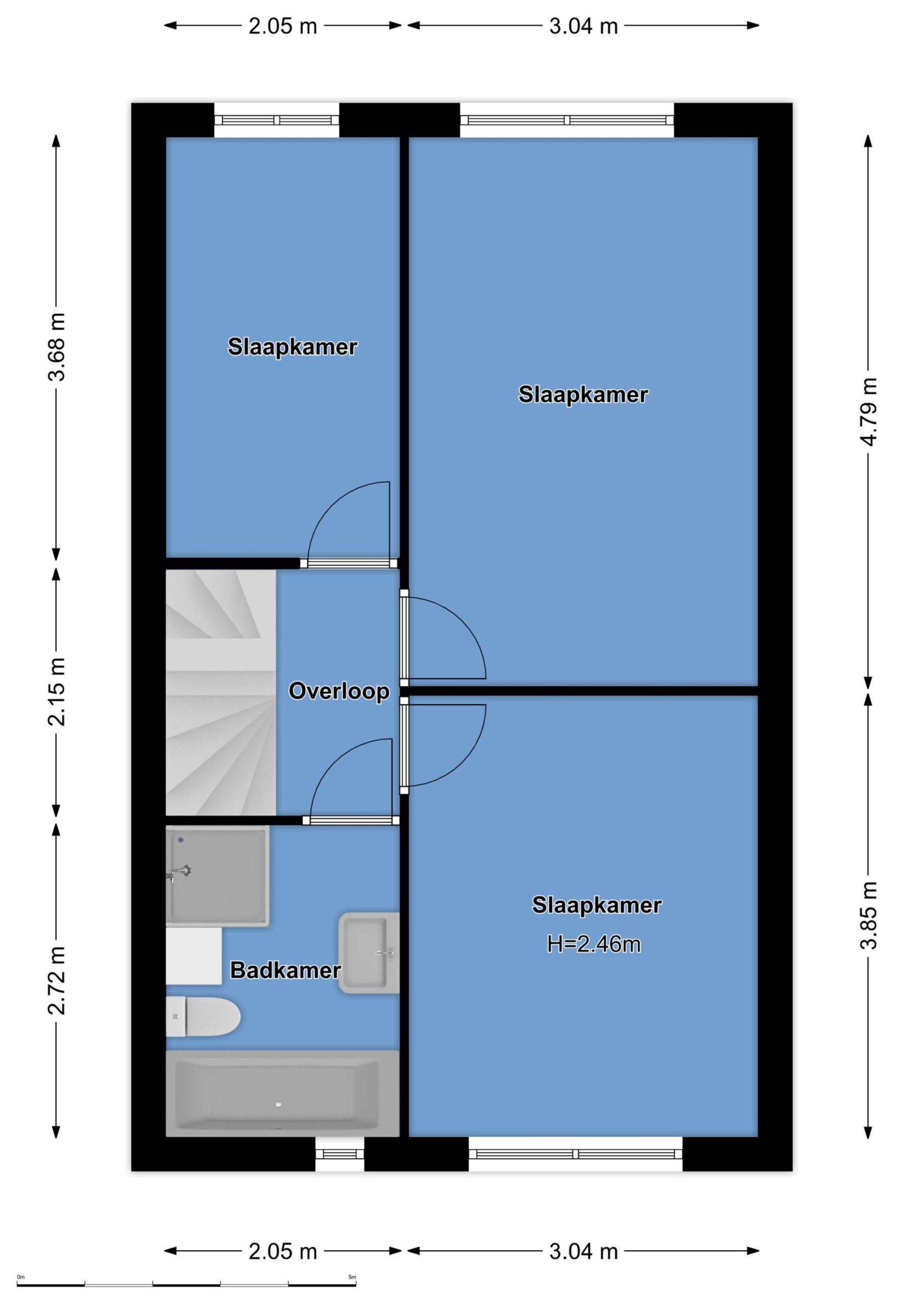 Overloop, slaapkamer aan de voorzijde, 2e en 3e slaapkamer aan de achterzijde. Badkamer…