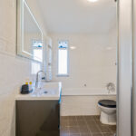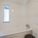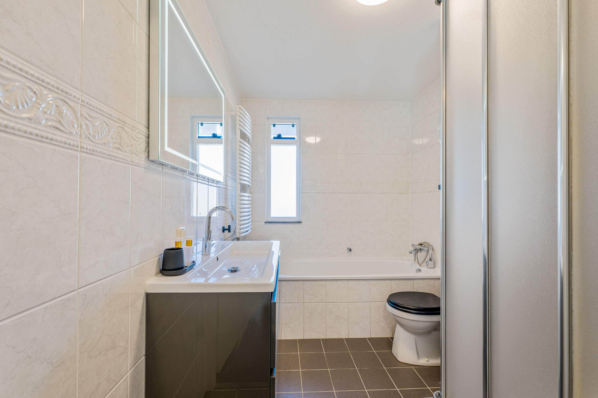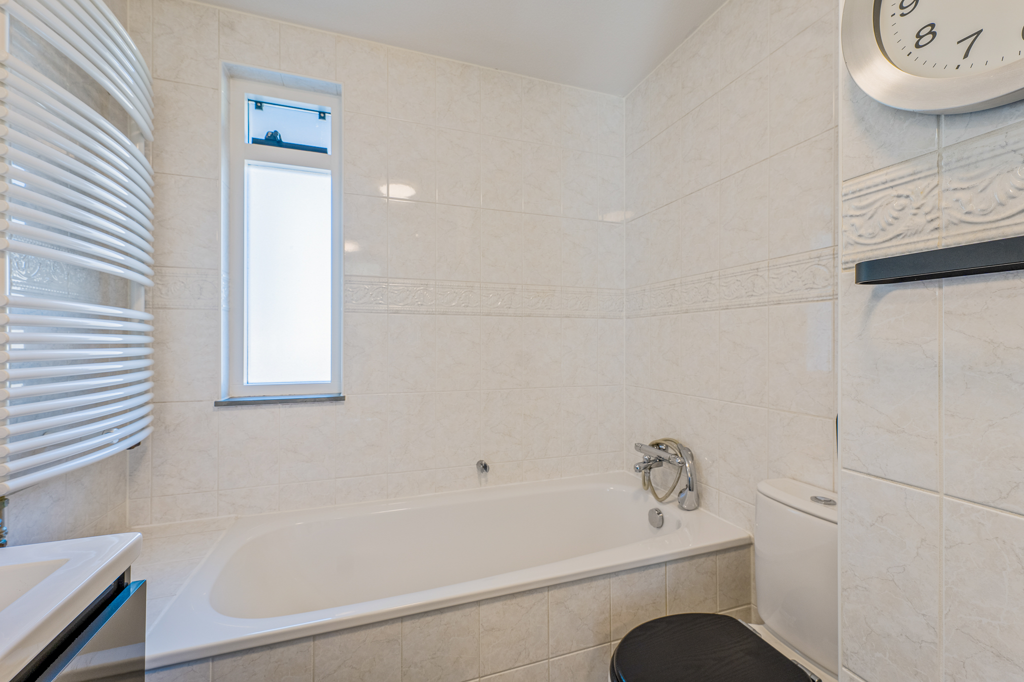 Overloop, slaapkamer aan de voorzijde, 2e en 3e slaapkamer aan de achterzijde. Badkamer met ligbad, separate douche, vaste wastafel en toilet.