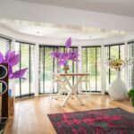 Facing the garden is the living room, featuring a cozy fireplace and a conservatory with double doors. Double doors from the dining area also lead to the green outdoor area.