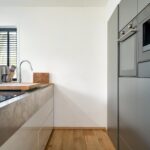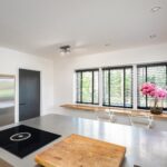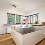 The kitchen features an island and is equipped with all conceivable built-in appliances, including a dishwasher, coffee machine, steam oven, and Bora BFIU induction hob.
